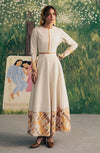 Woven poetry A graceful full-length skirt in soft cream elevated with tie and dye detailing and a hint of artistic print.