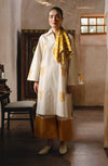 Traditional style meets modern prints with this mid-length shirt and colour-block pants in this seasonal favorite.