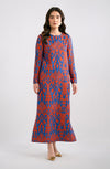 Make a statement in a straight dress, adorned with rust and cobalt blue print, featuring side slits and sleeve binding details.