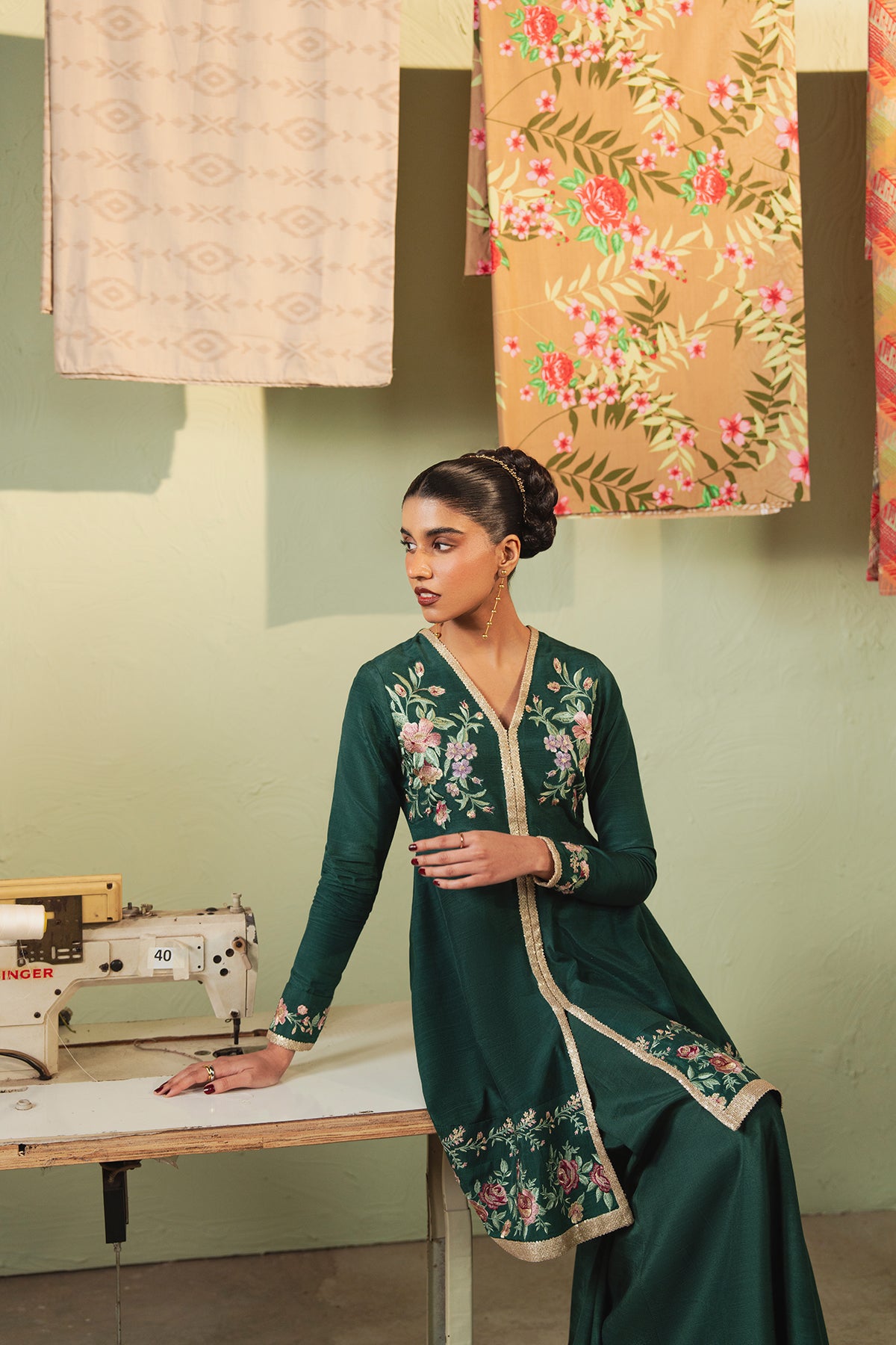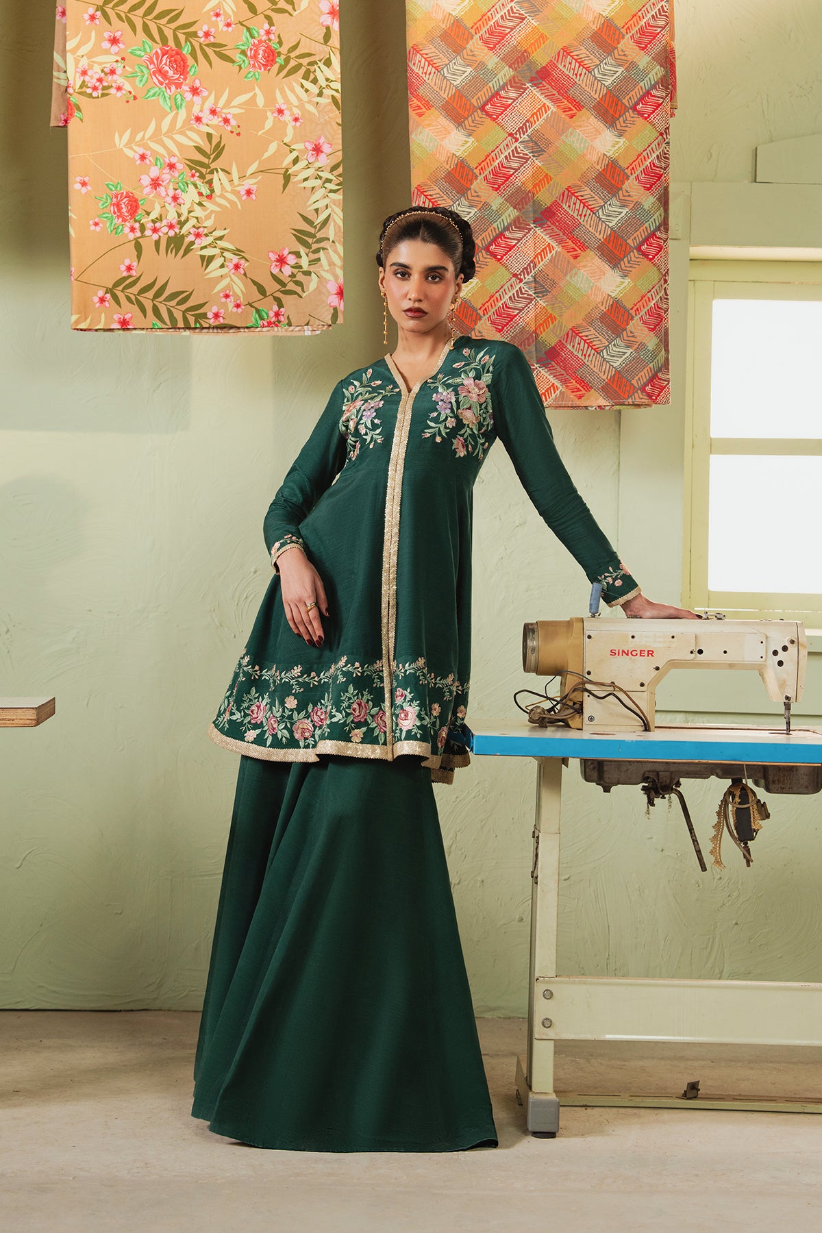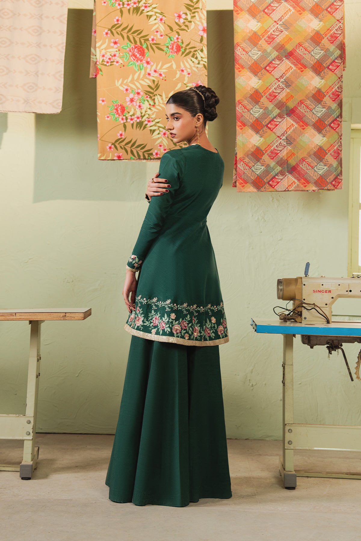 Step into royalty with this bottle green beauty! The raw silk peplum and sharara set blend opulence and timeless allure.
