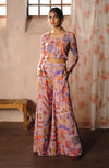 Radiate in a symphony of vibrant hues with this chiffon top featuring button-loop detailing and flared pants.