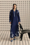 This deep-navy shirt dress is cut in a straight, elongated silhouette, detailed with soft blue florals that build from tiny pointillist strokes along the sleeves and hem. The embroidered placket adds structure through the center, while the full-length fall keeps the look sleek and uninterrupted. Paired with matching heels, the outfit stays refined, tonal, and visually balanced — a crisp composition of navy, blues, and subtle texture.