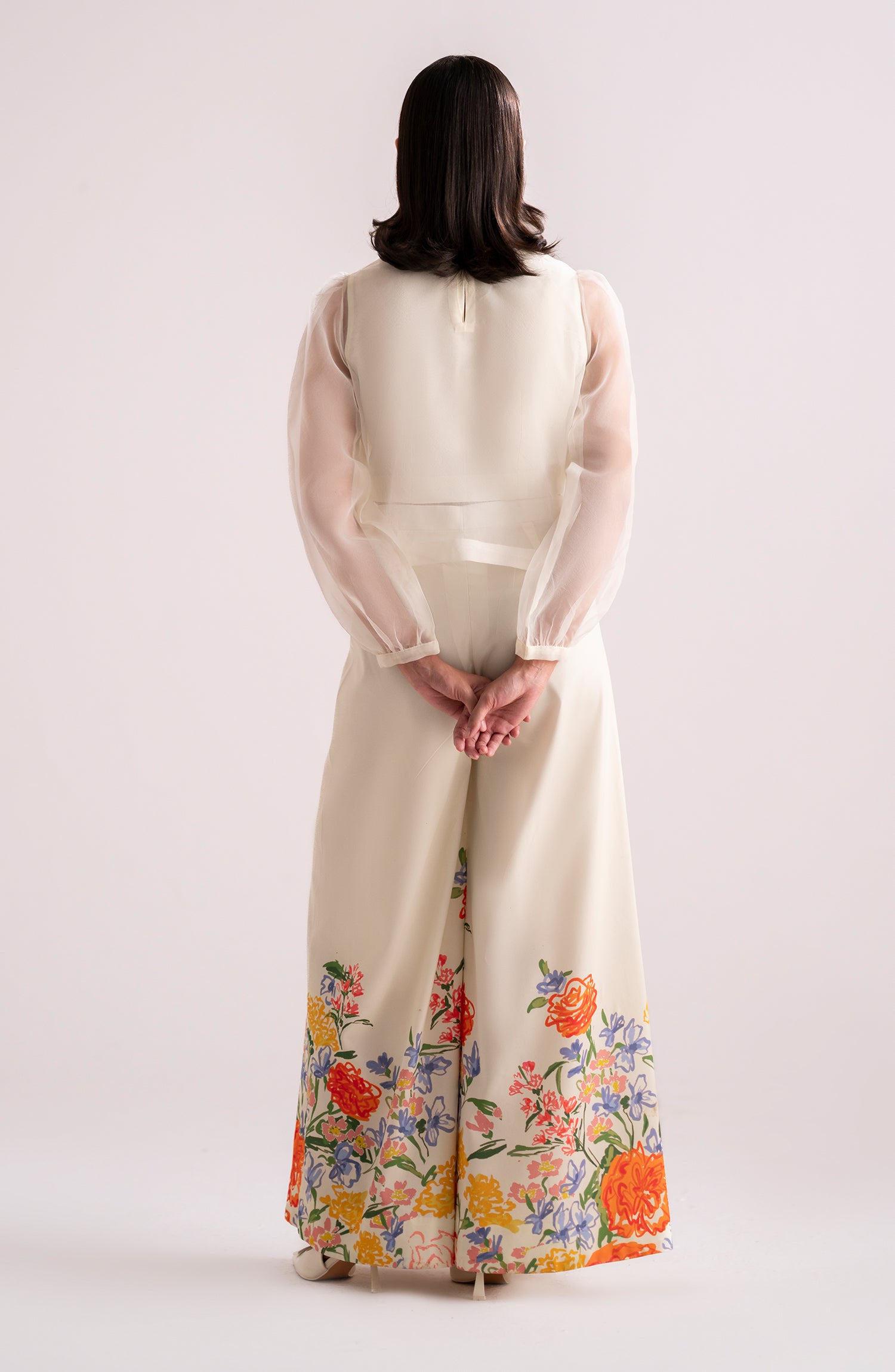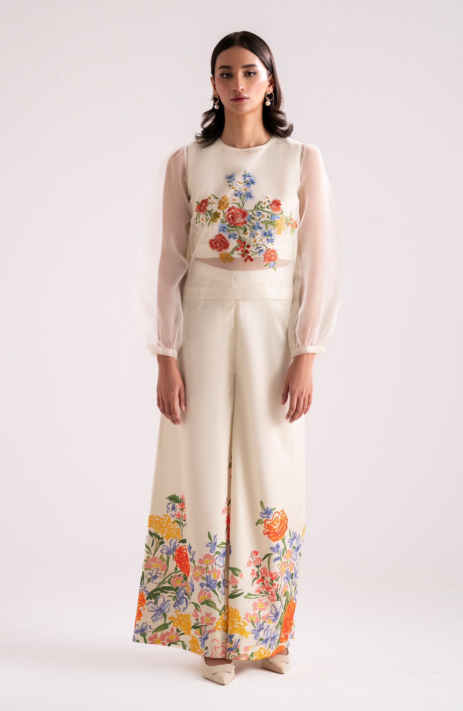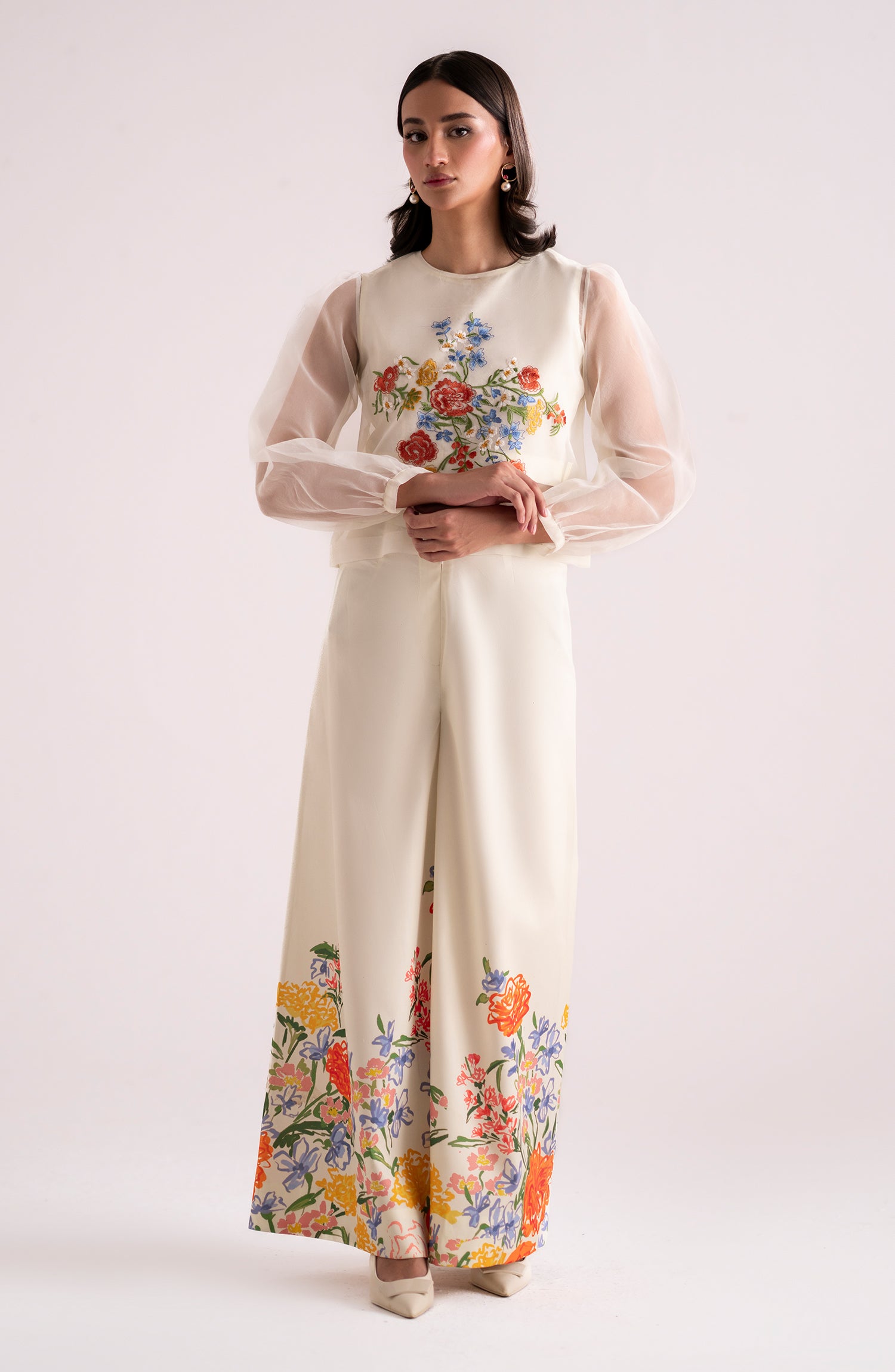 Dazzle in a modern embroidered organza top and printed wide-leg pants.