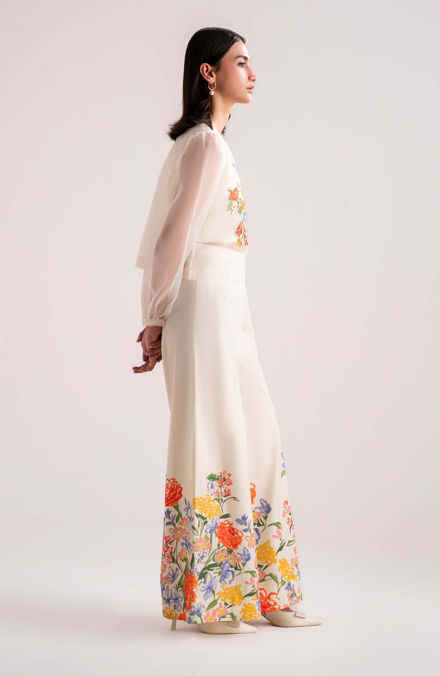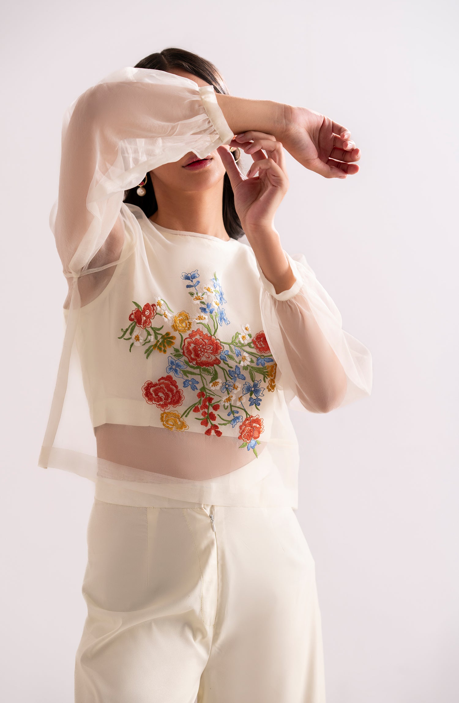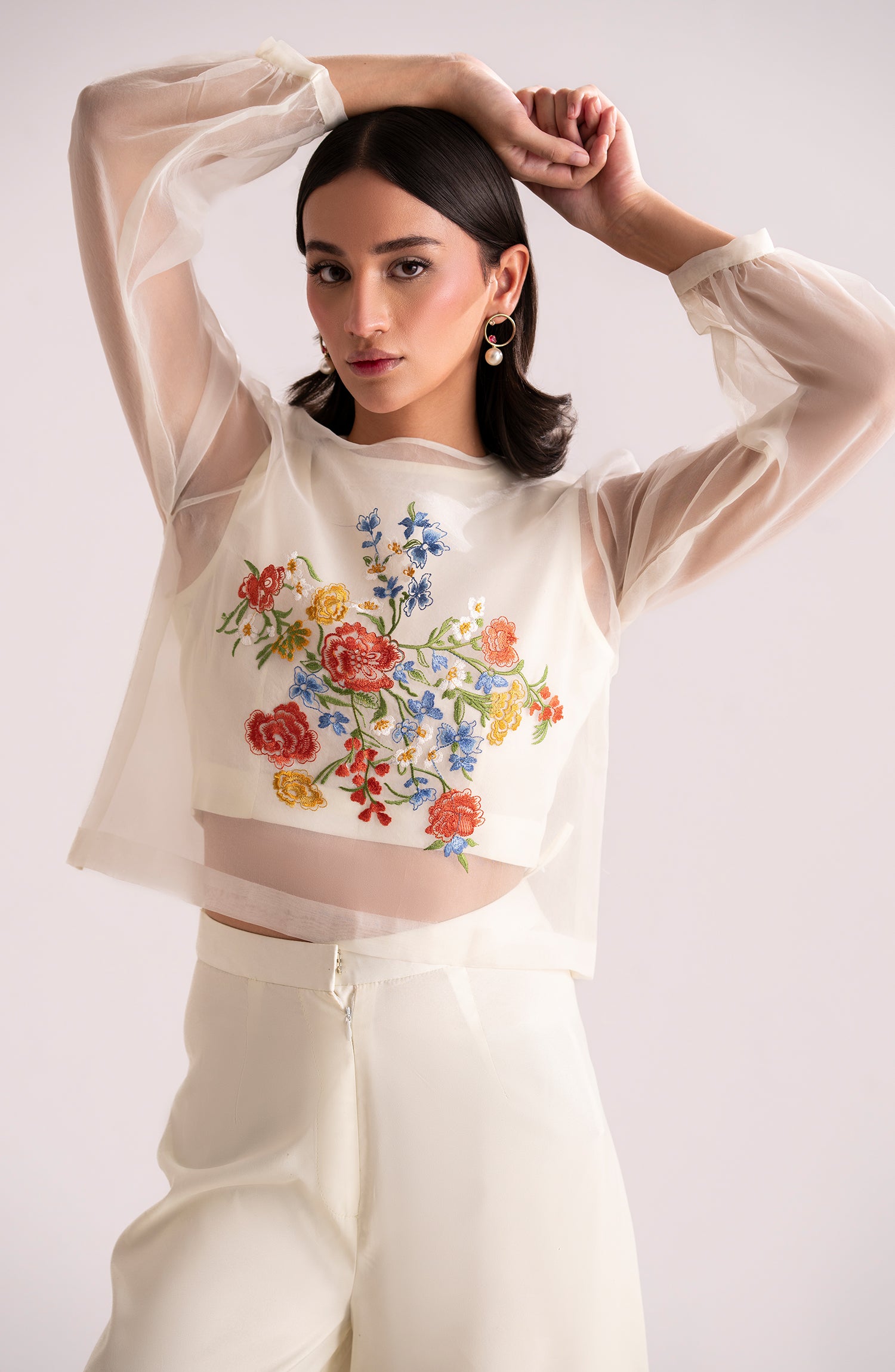 Dazzle in a modern embroidered organza top and printed wide-leg pants.