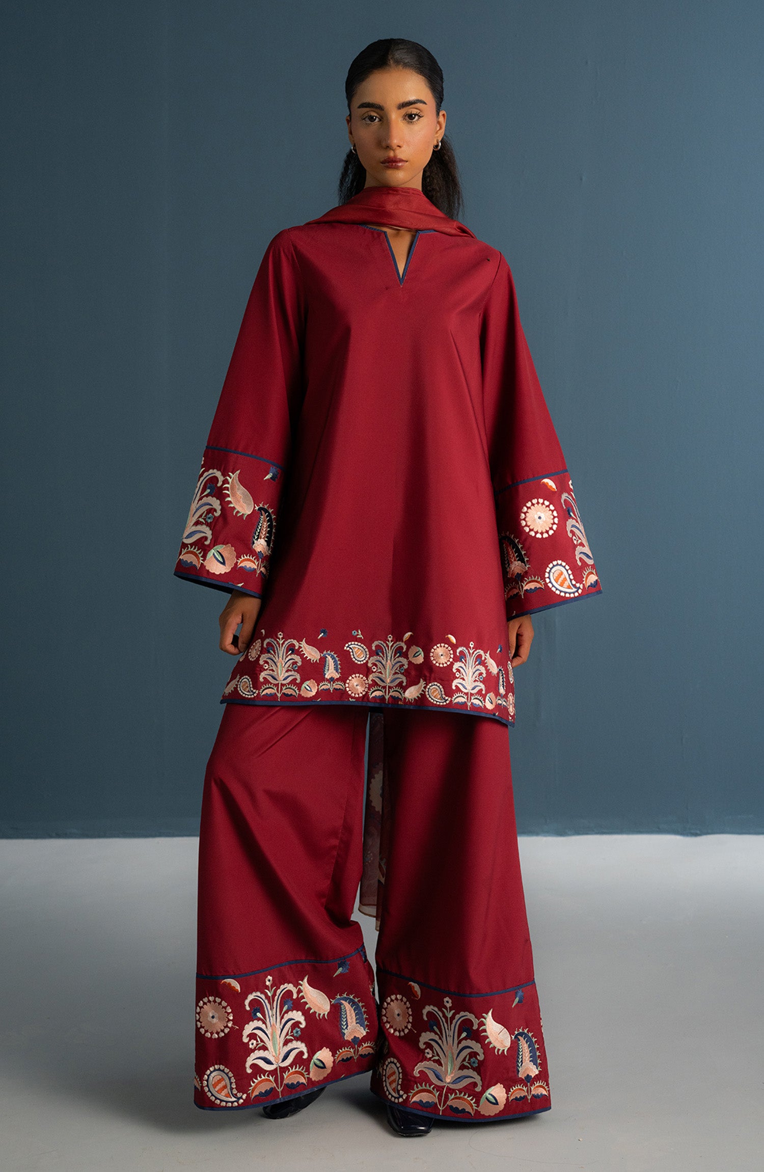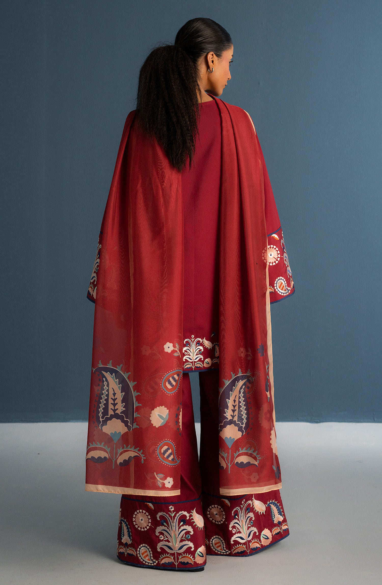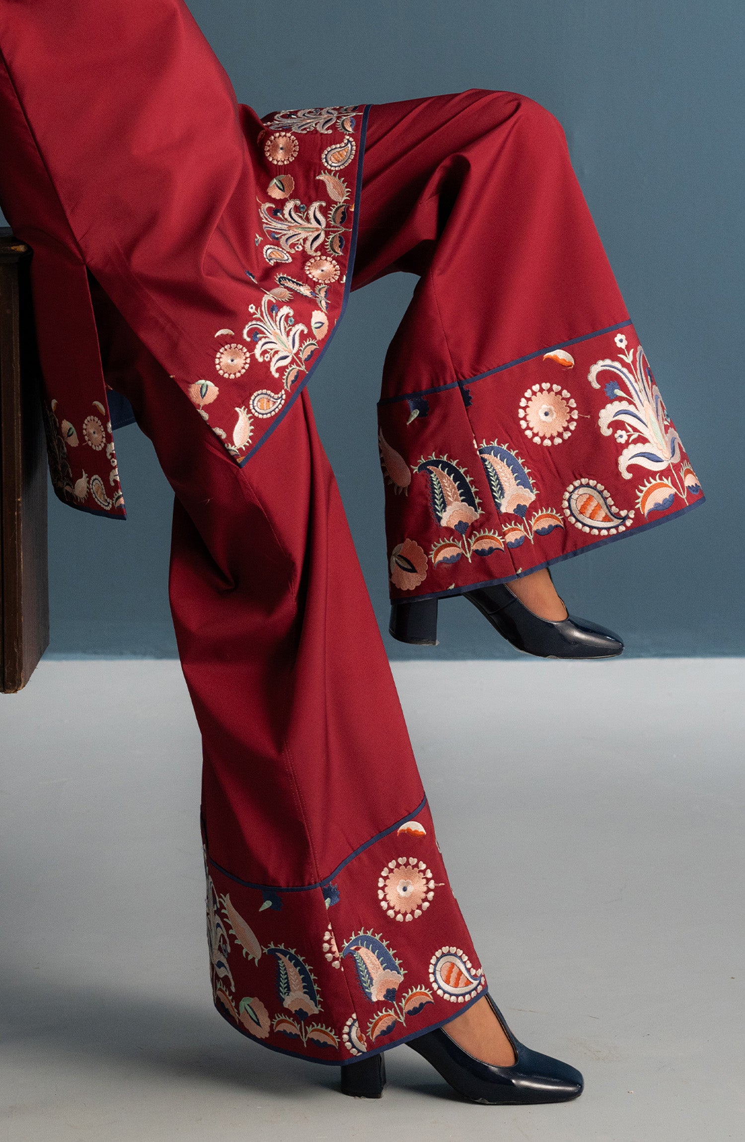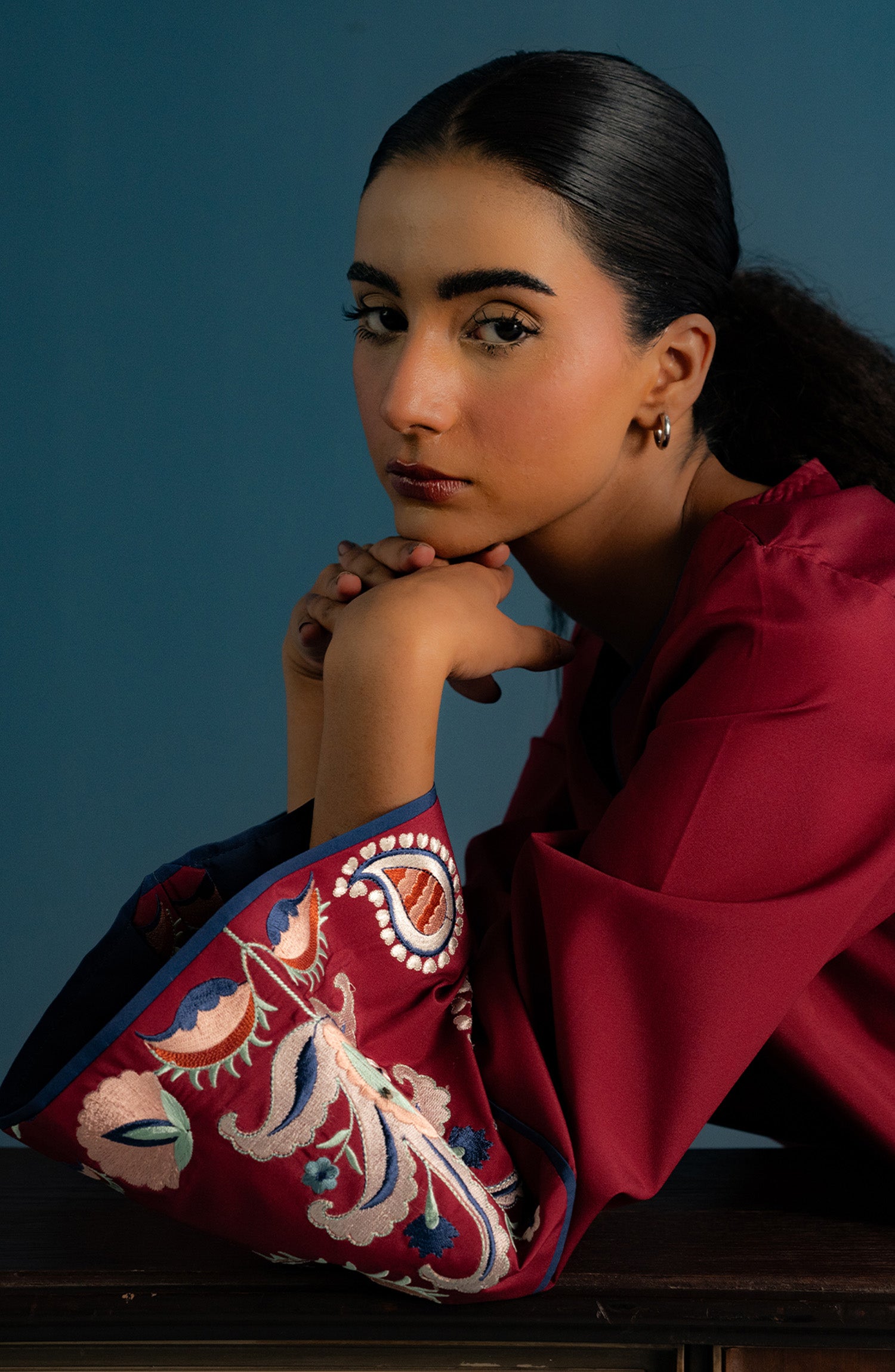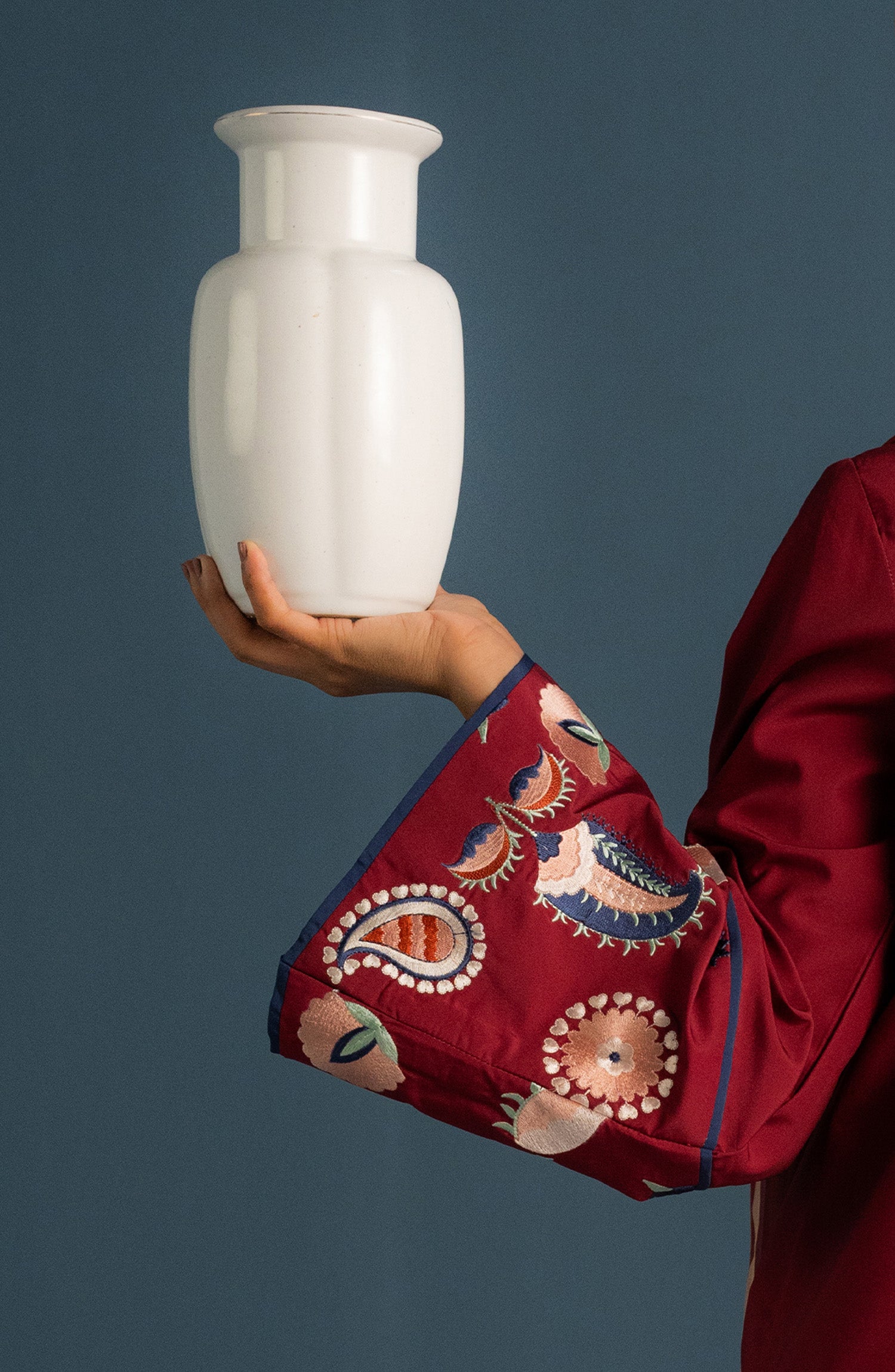 Understated in spirit. A rich maroon silhouette framed with tonal threadwork in soft neutrals and cool blues, bringing artisanal symmetry and visual depth to each panel.