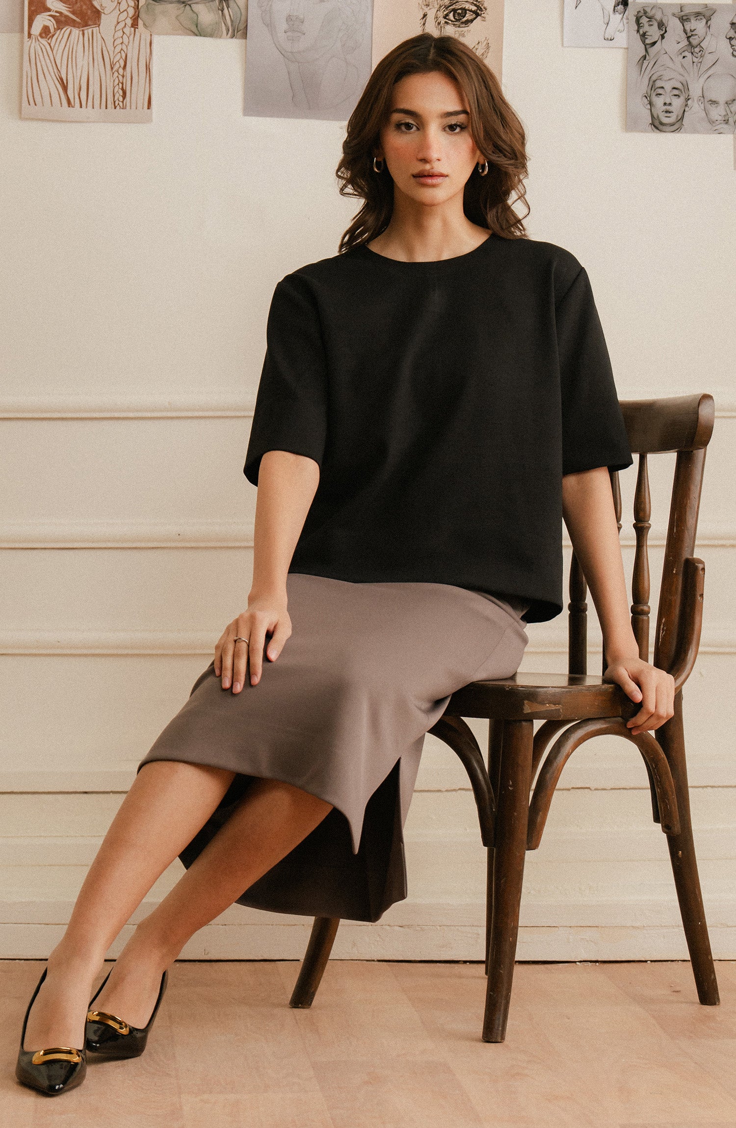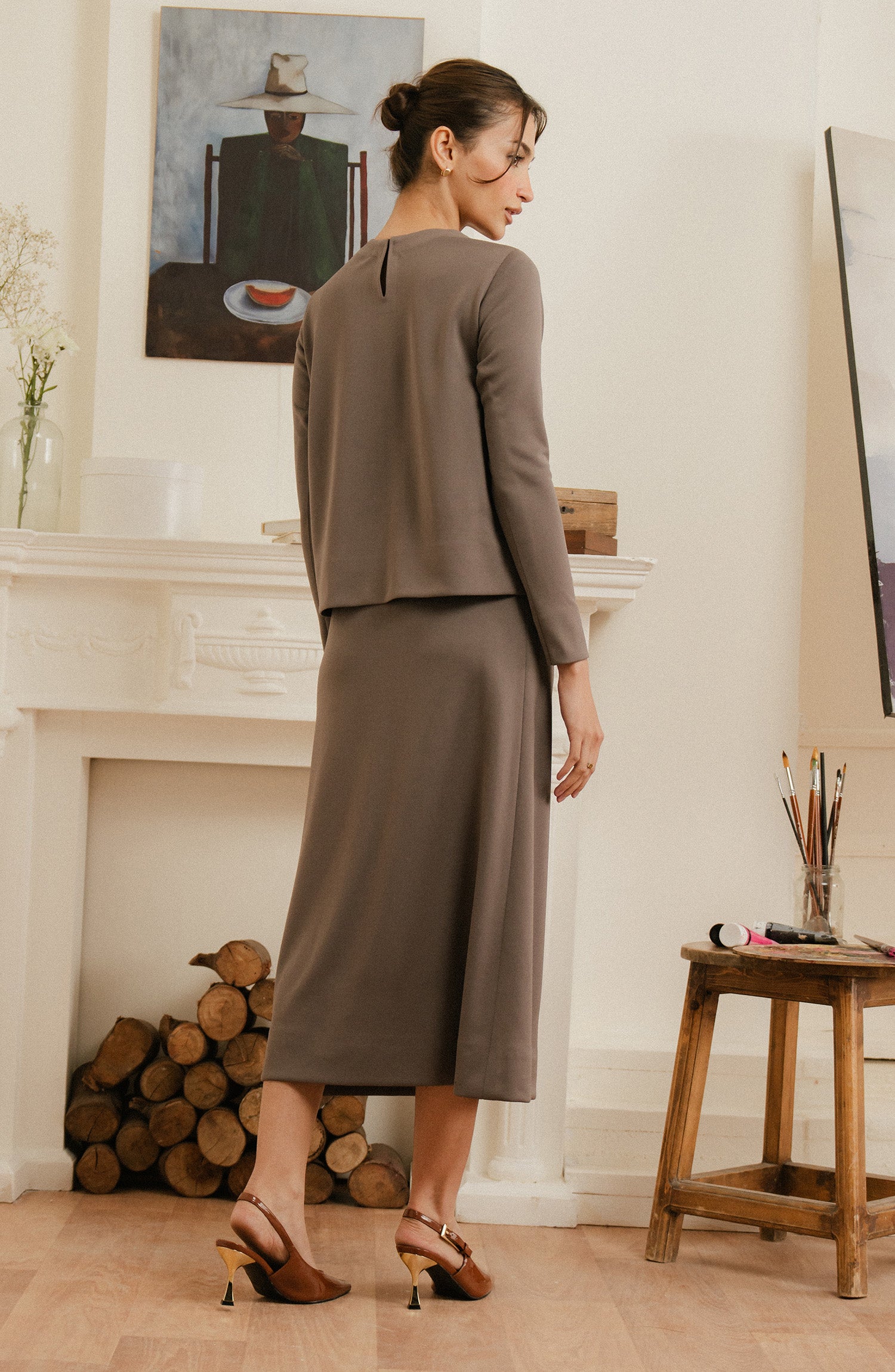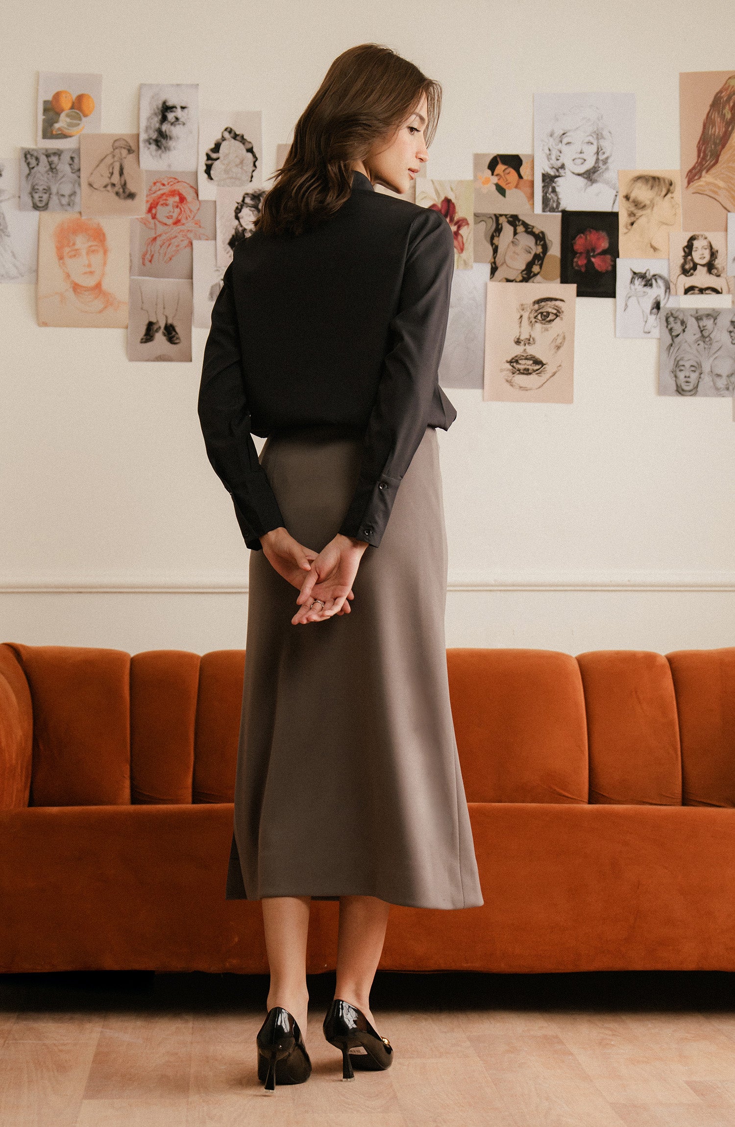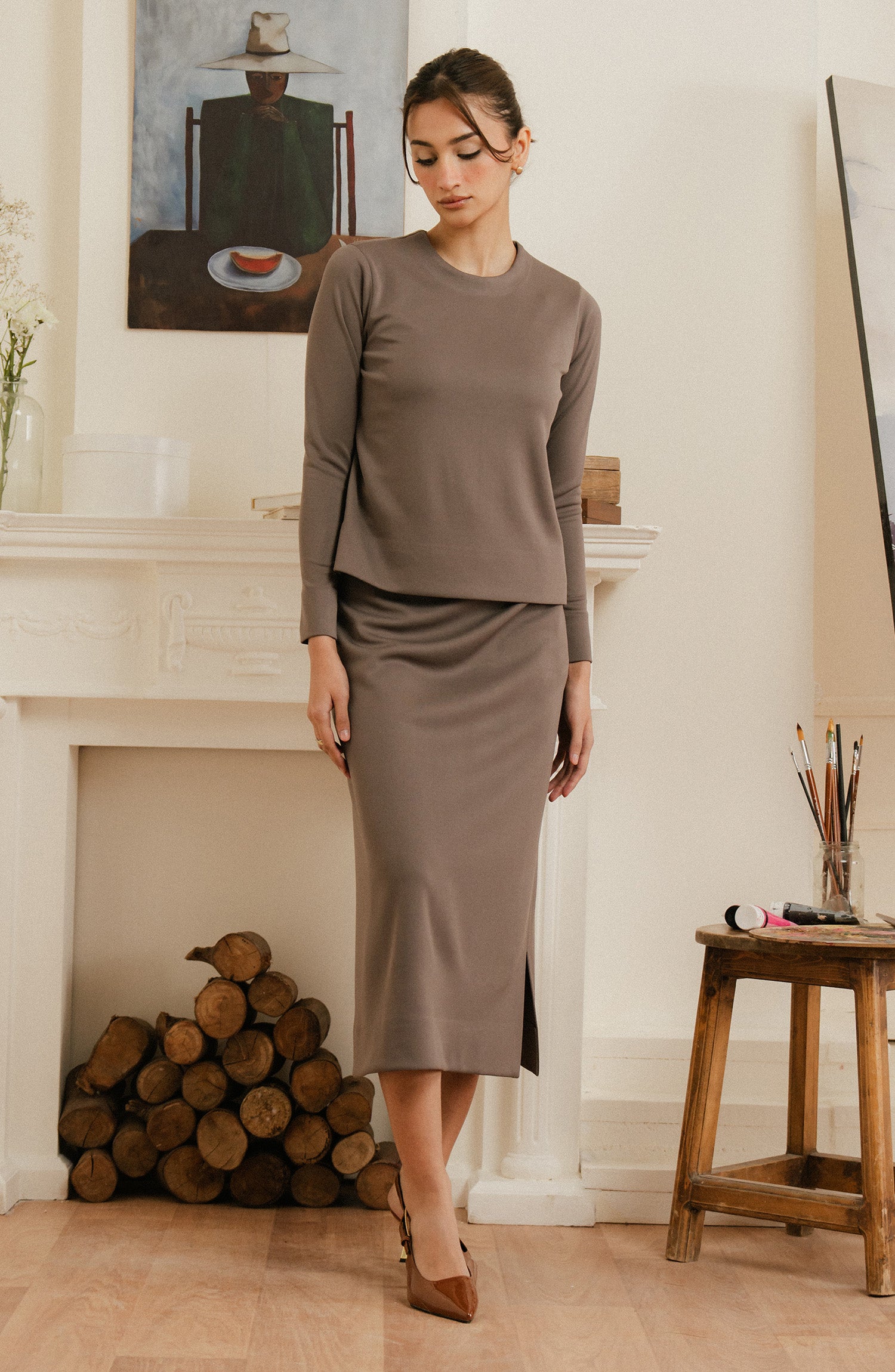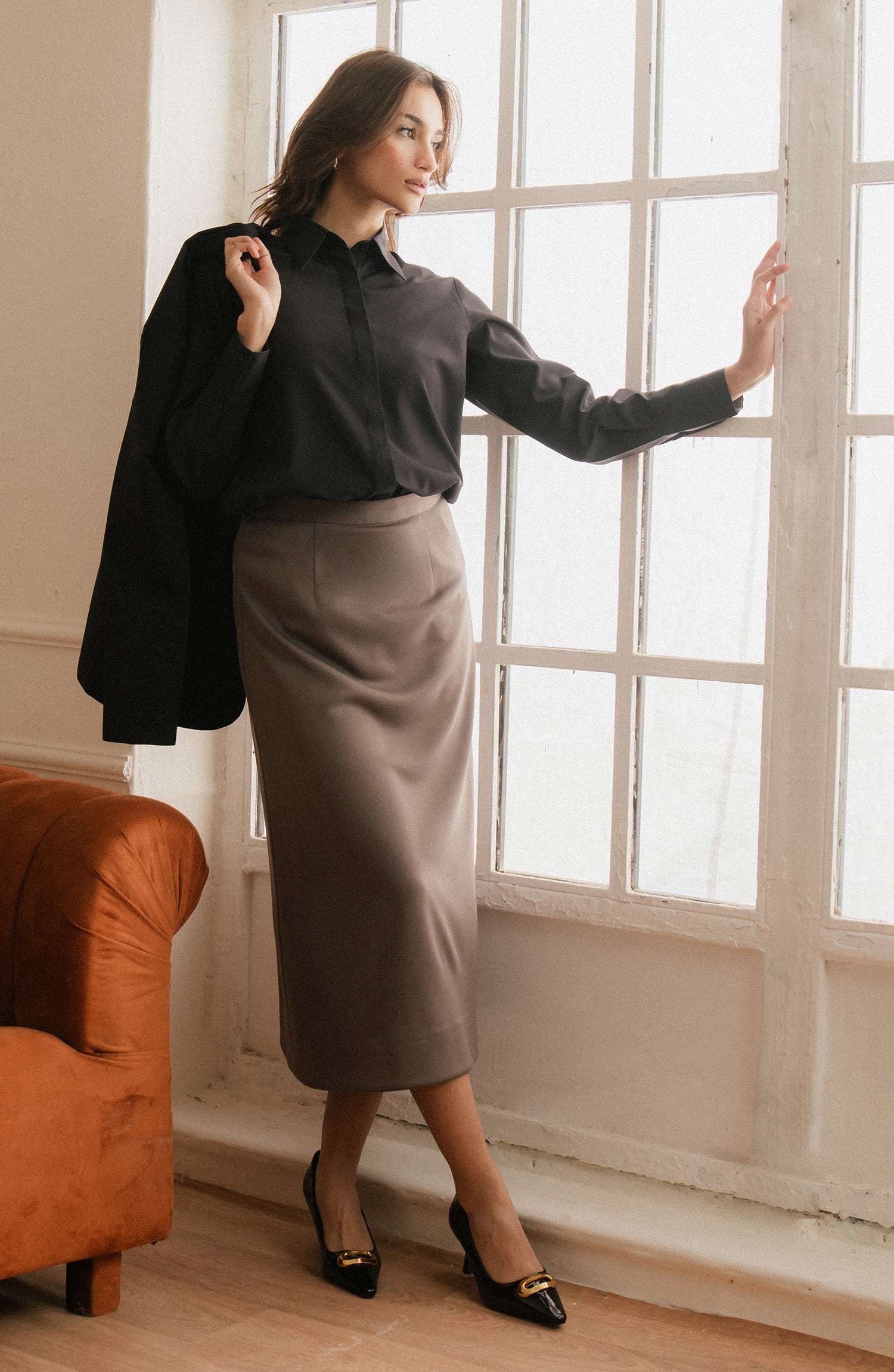 From office elegance to evening glam, the dull brown pencil skirt with a side slit.