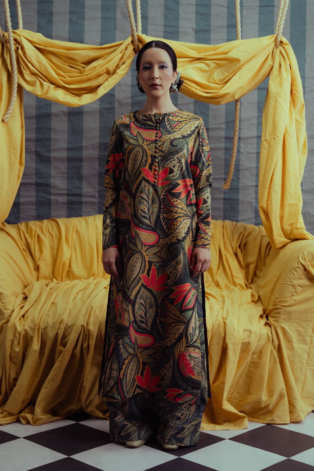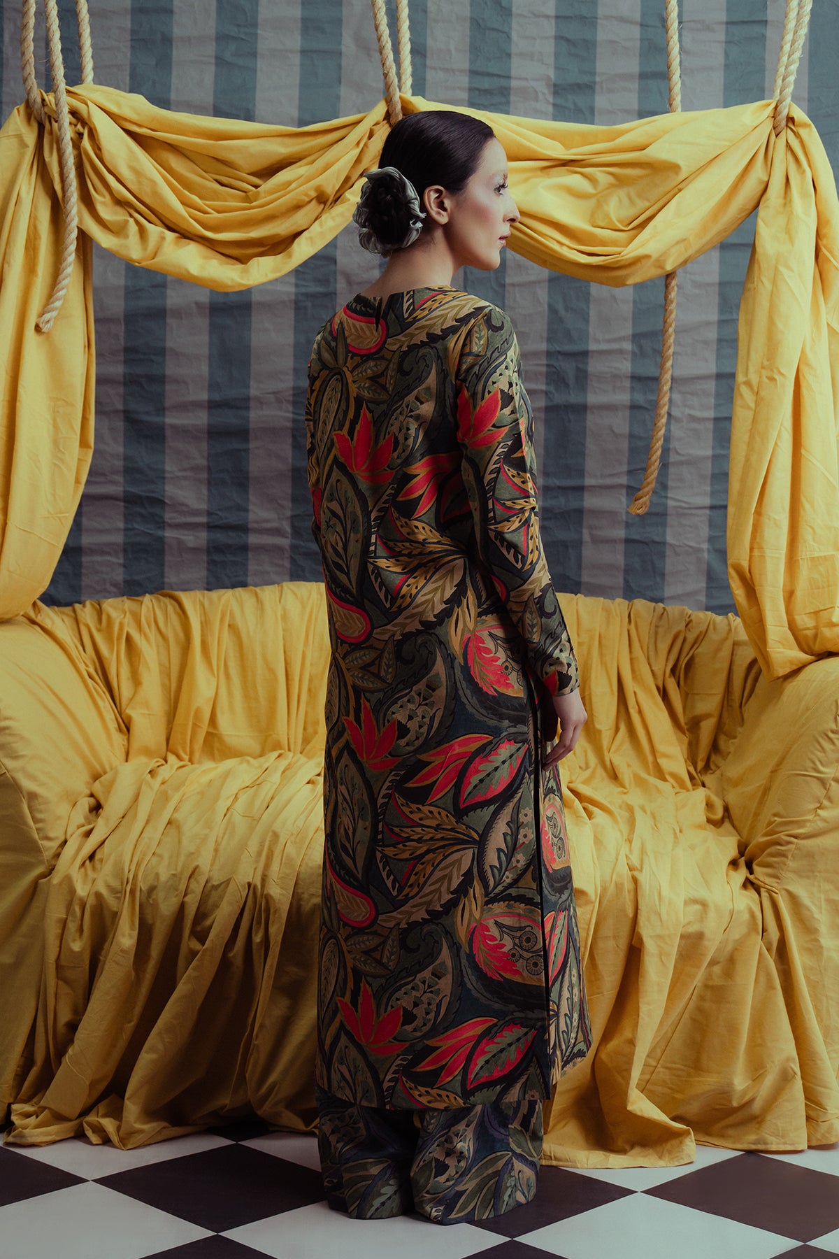 Step into timeless grace with this stunning green long shirt and trouser set, where classic tailoring meets artistic charm. Crafted from breathable, flowy fabric the ensemble features intricate paisley prints that add a touch of heritage and sophistication.