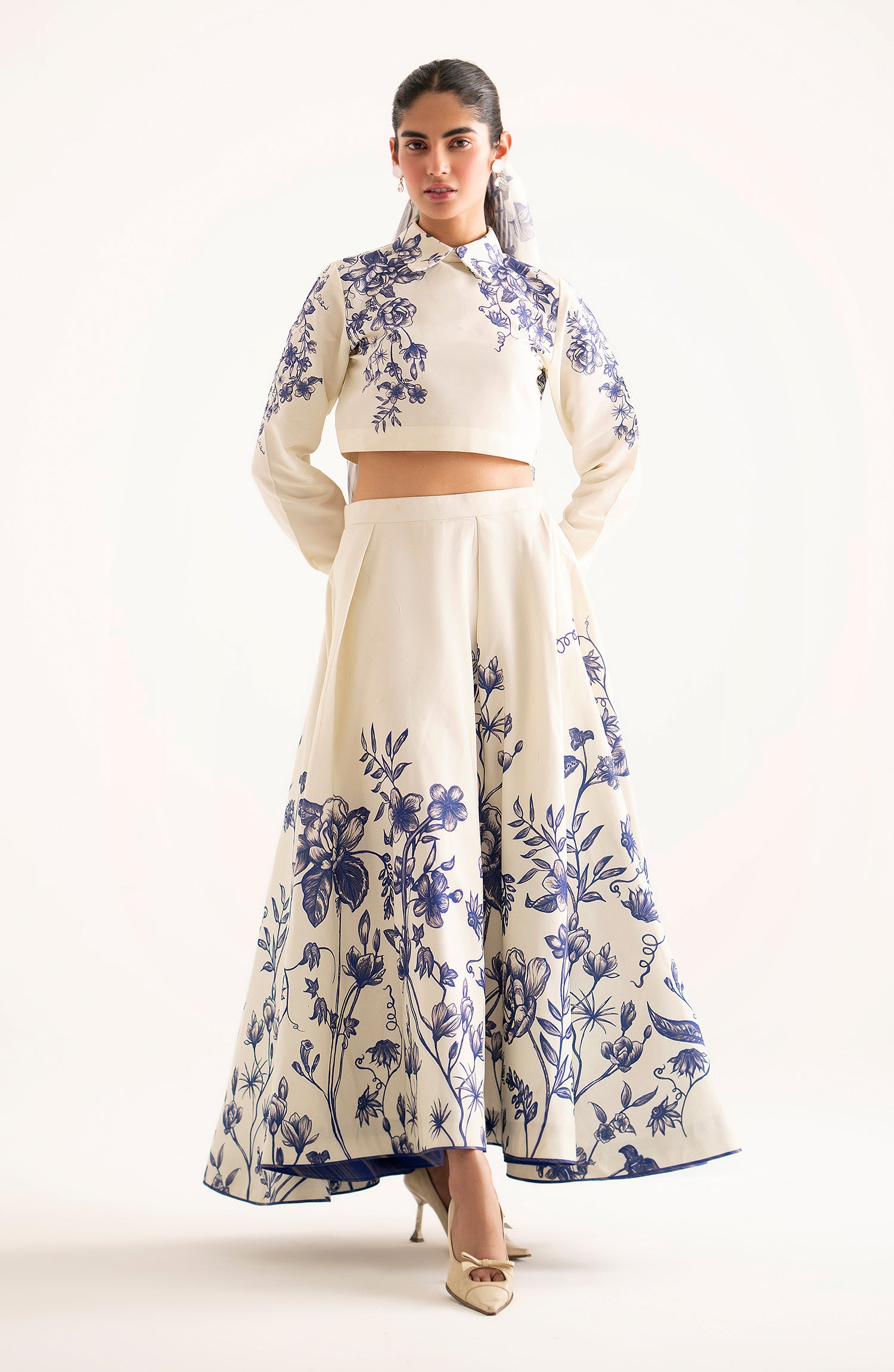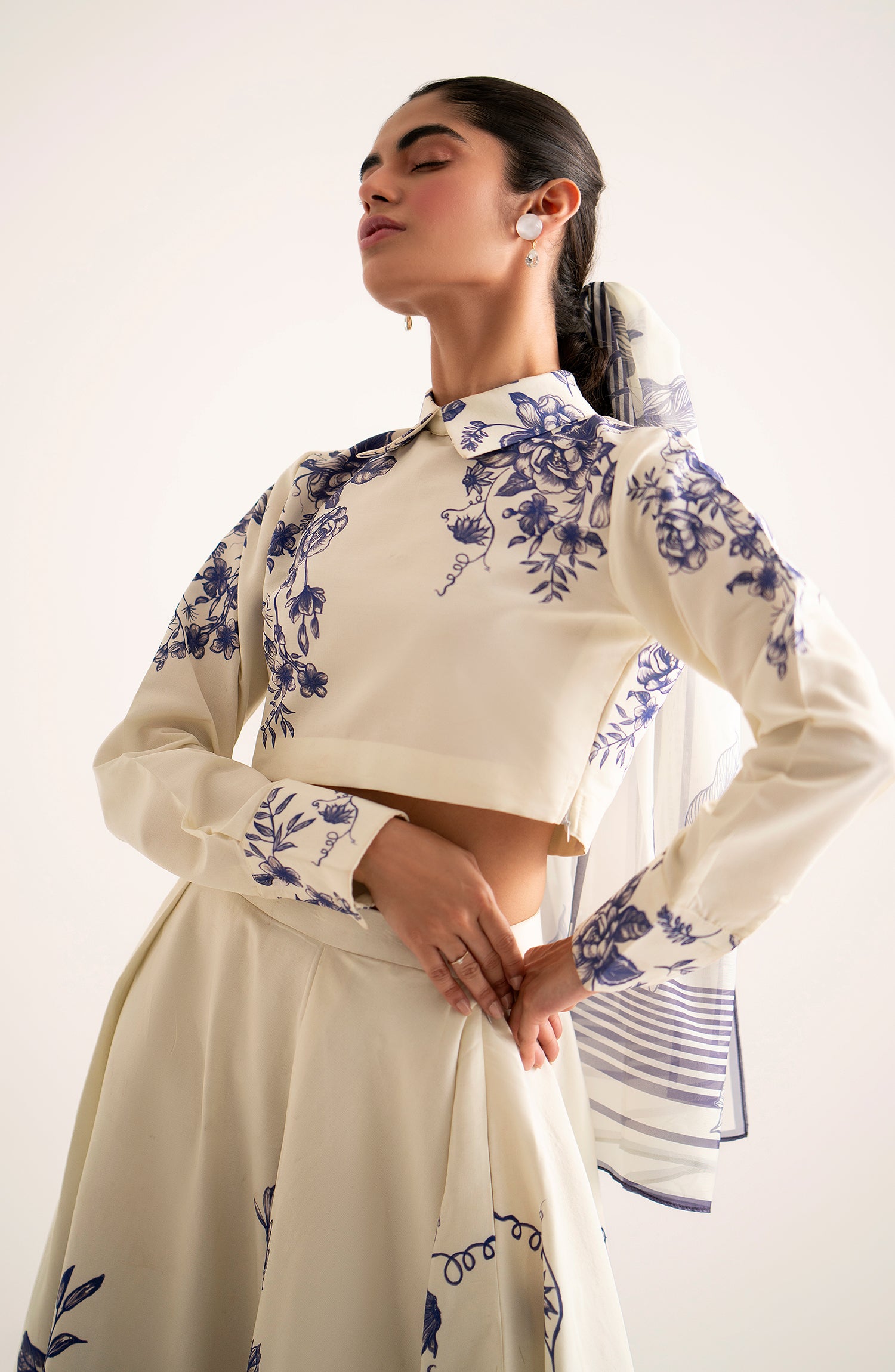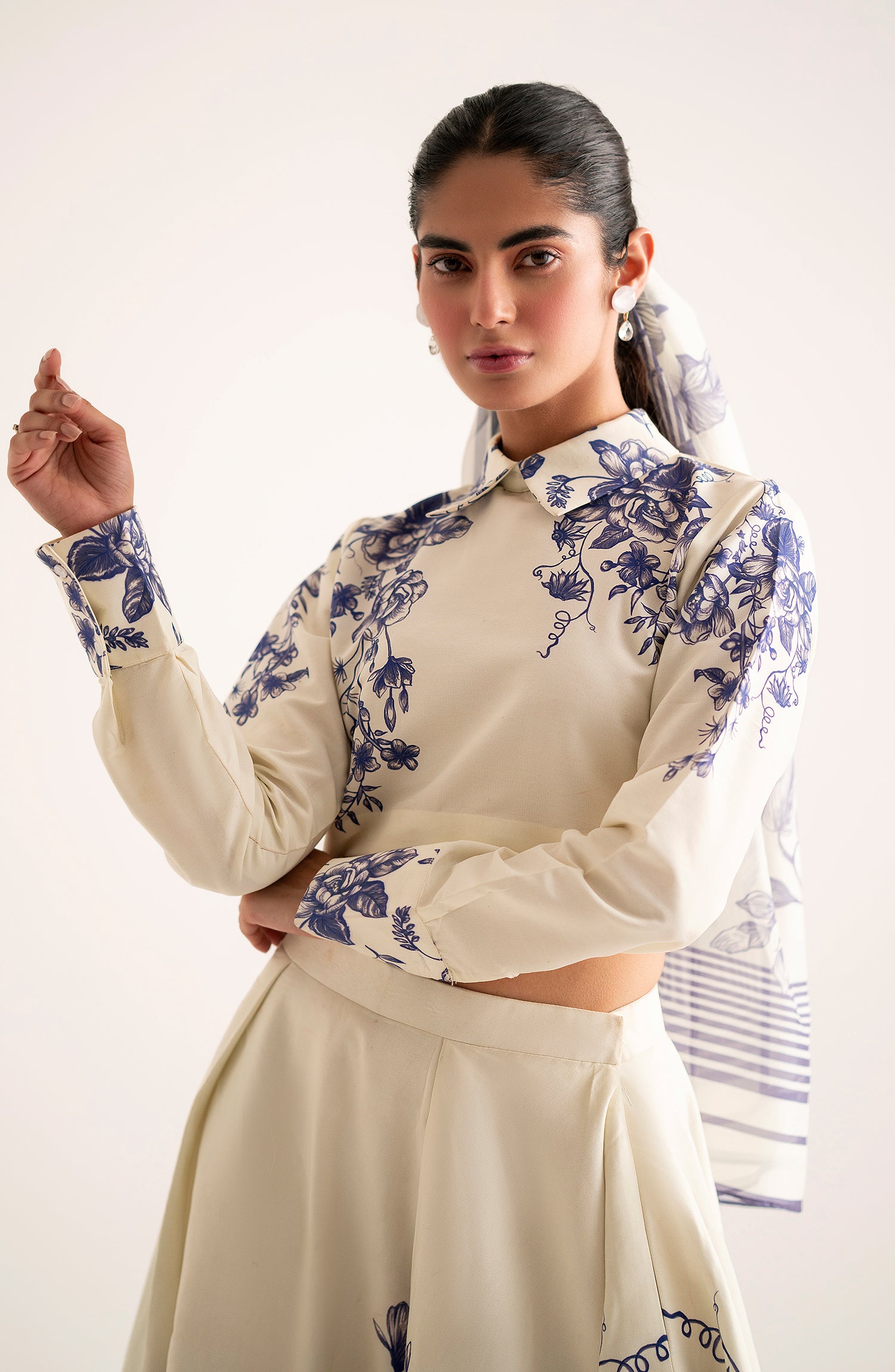 Combining chic elegance with playful charm, this trendy fused tank top with a stylish collar and cuffs pairs effortlessly with a flared fused floral skirt.