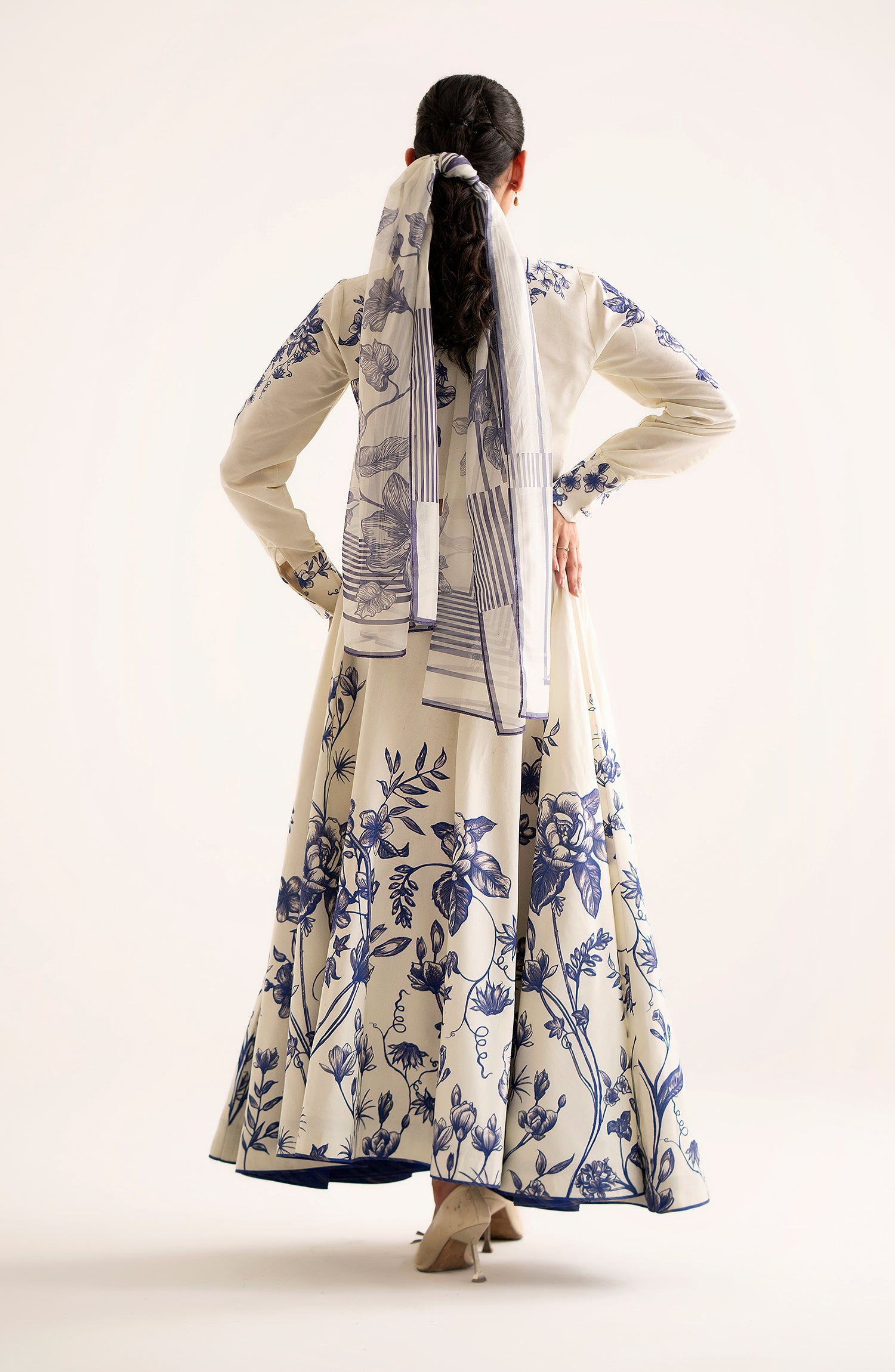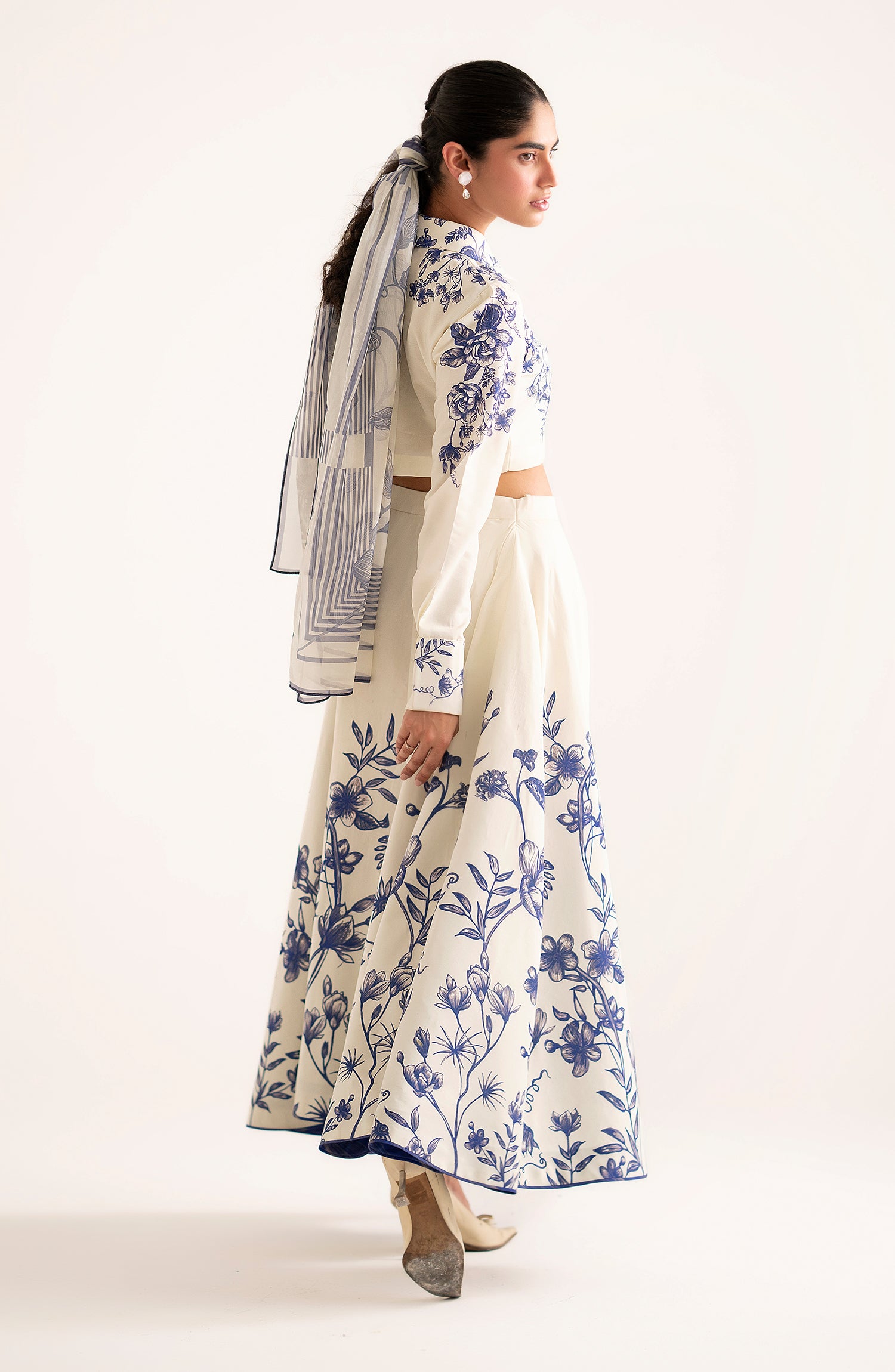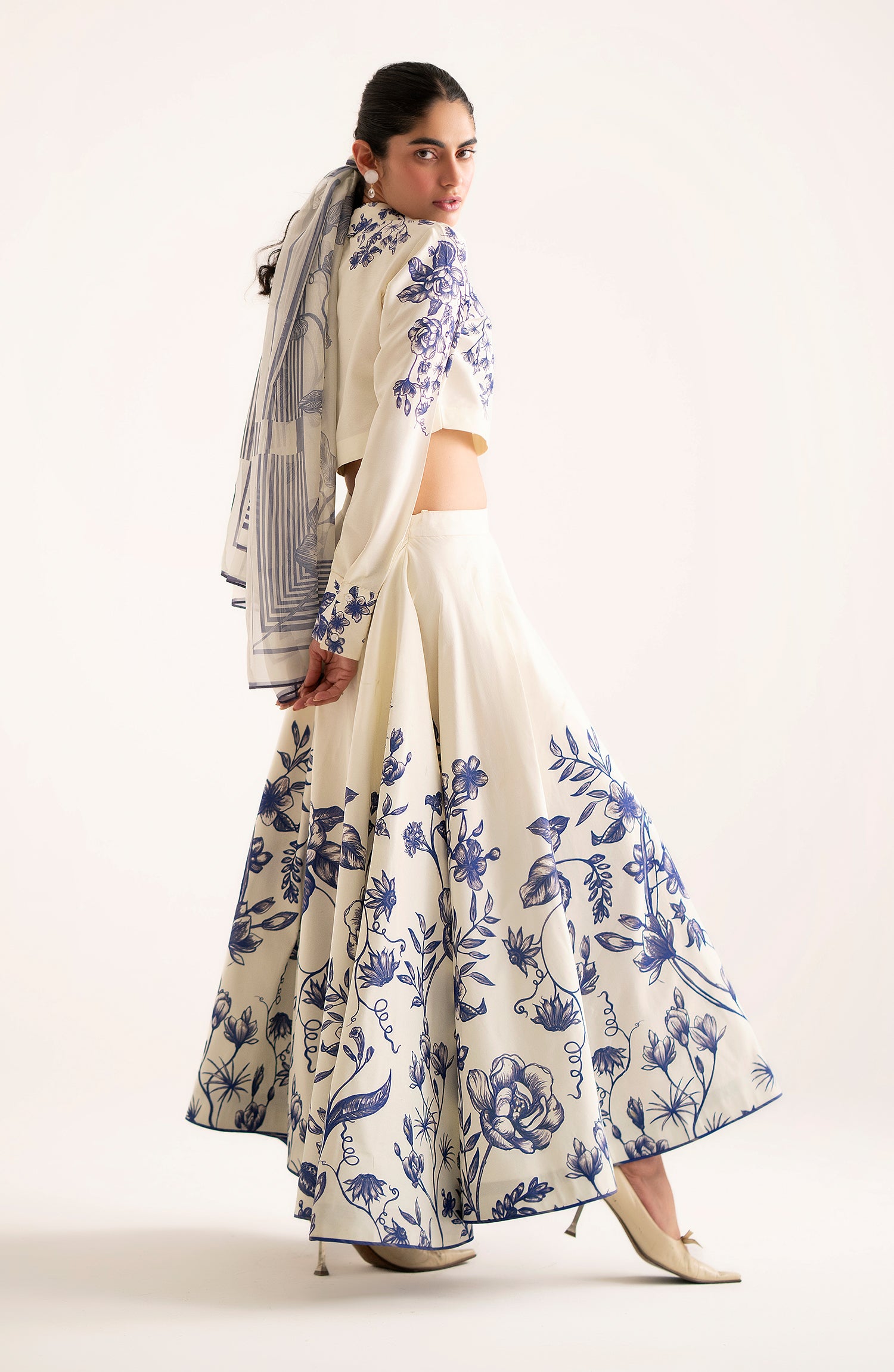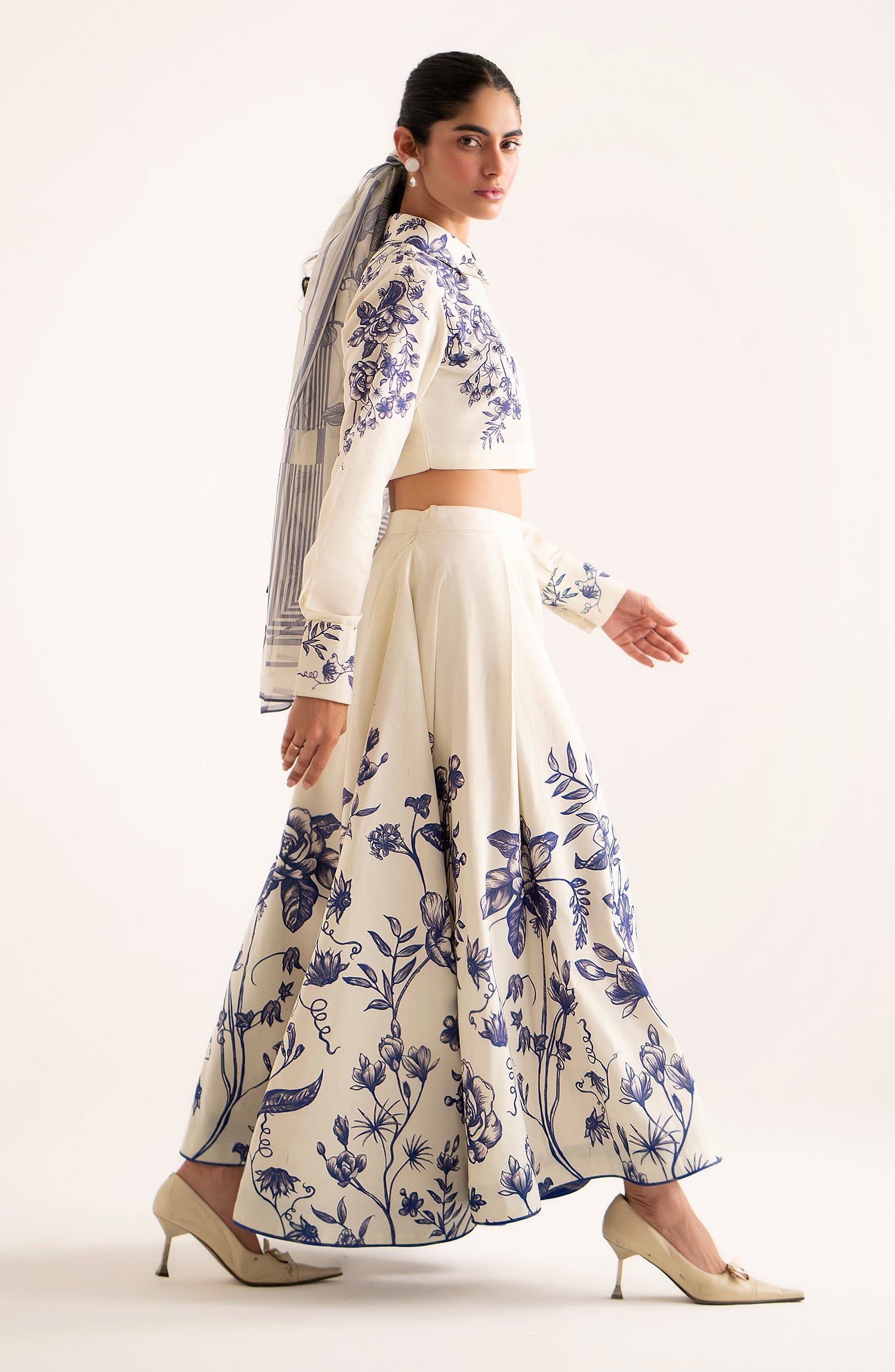 Combining chic elegance with playful charm, this trendy fused tank top with a stylish collar and cuffs pairs effortlessly with a flared fused floral skirt.