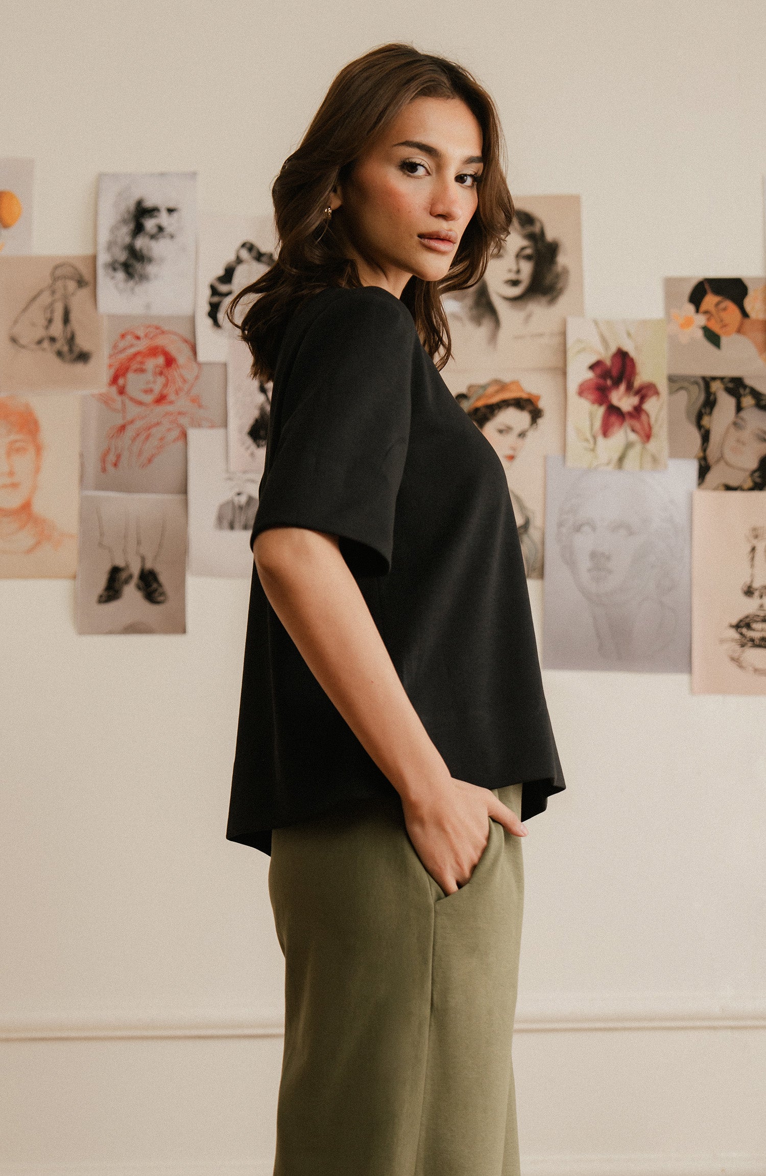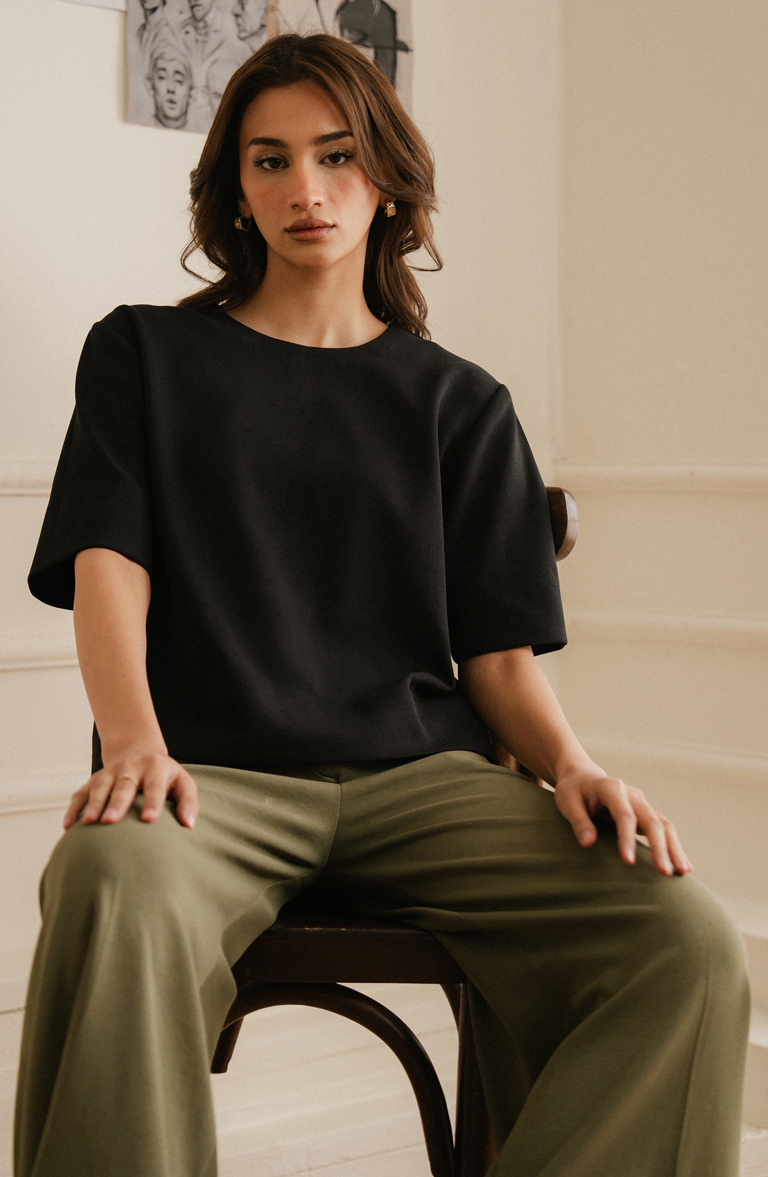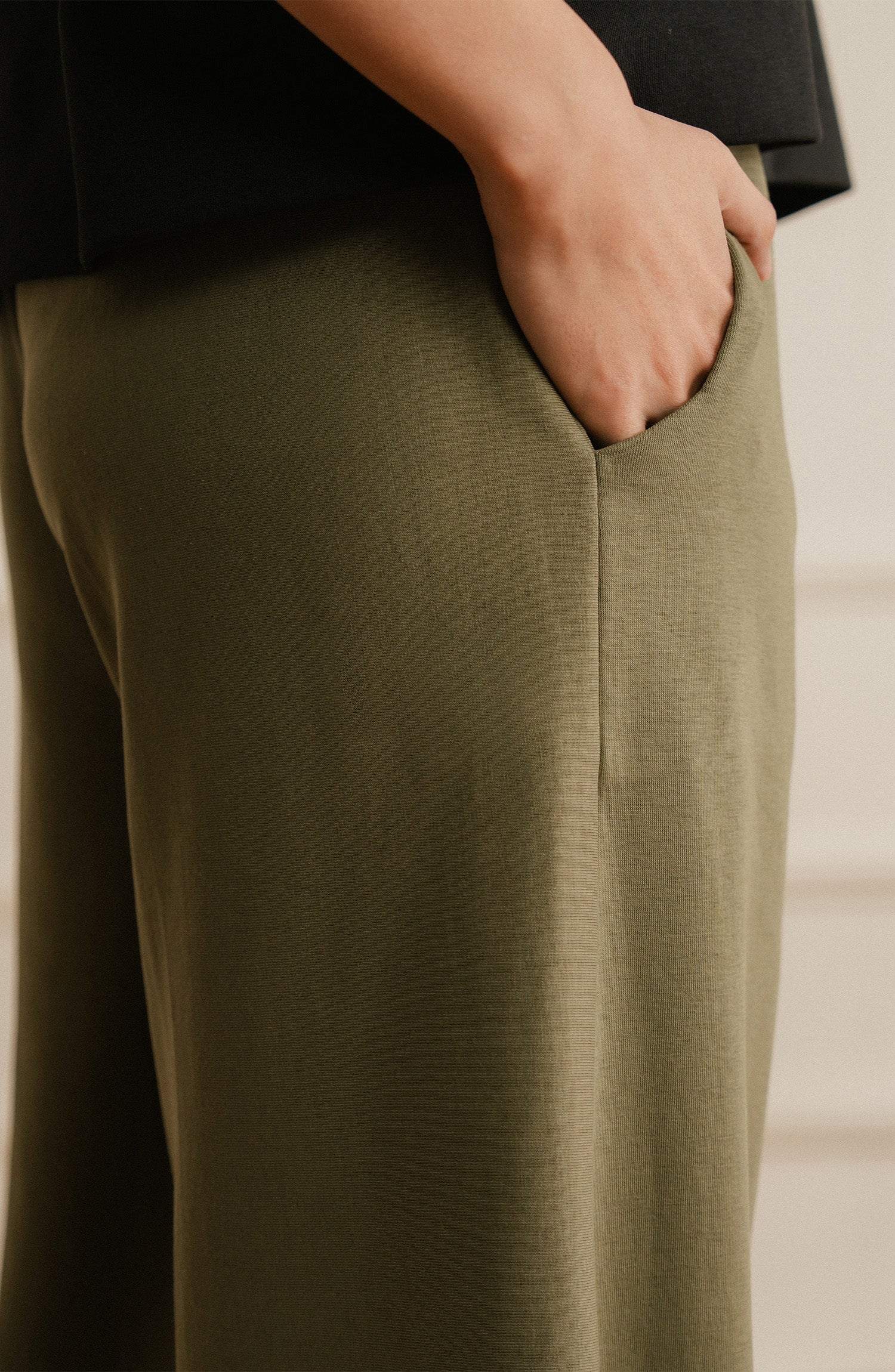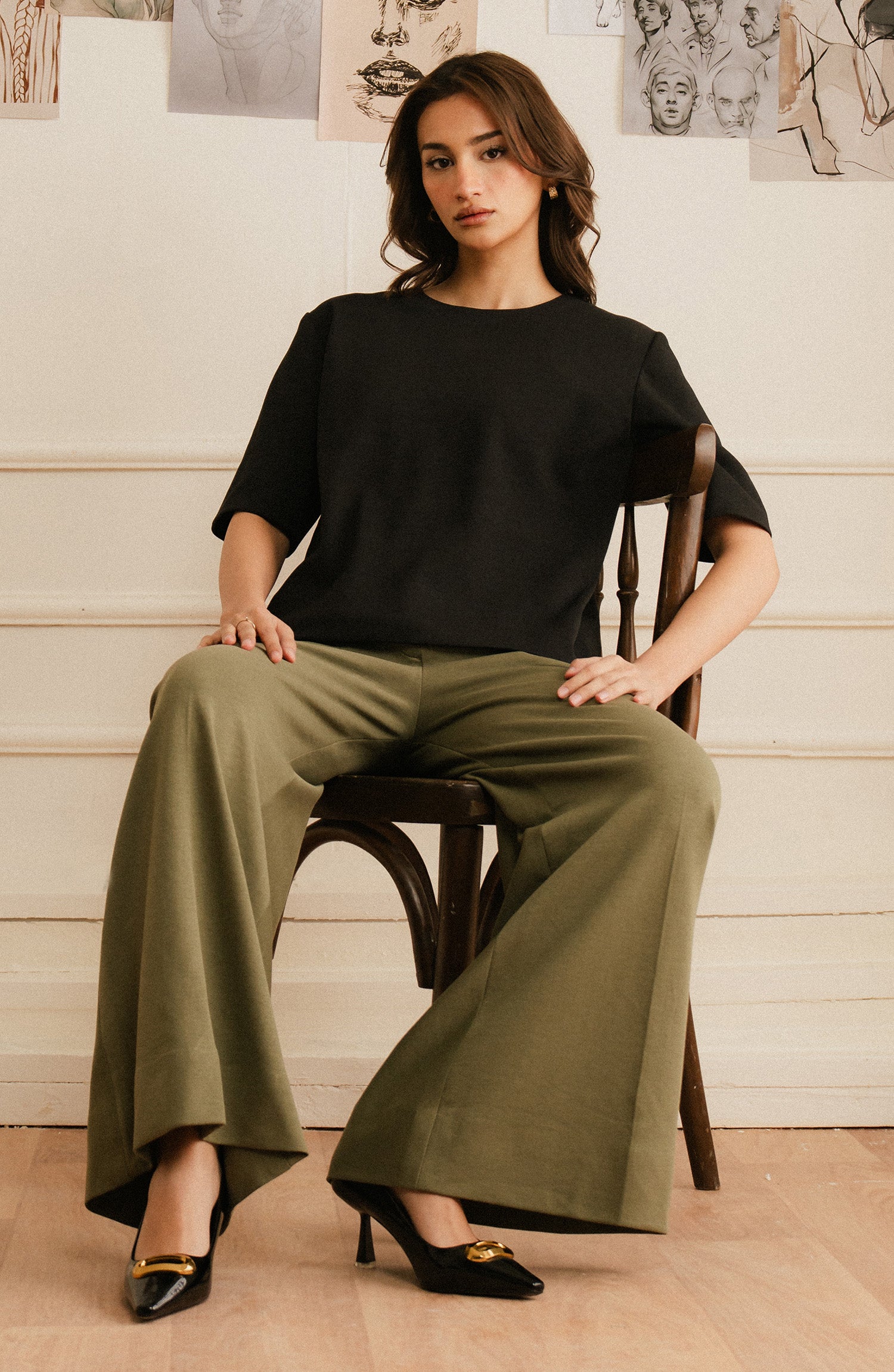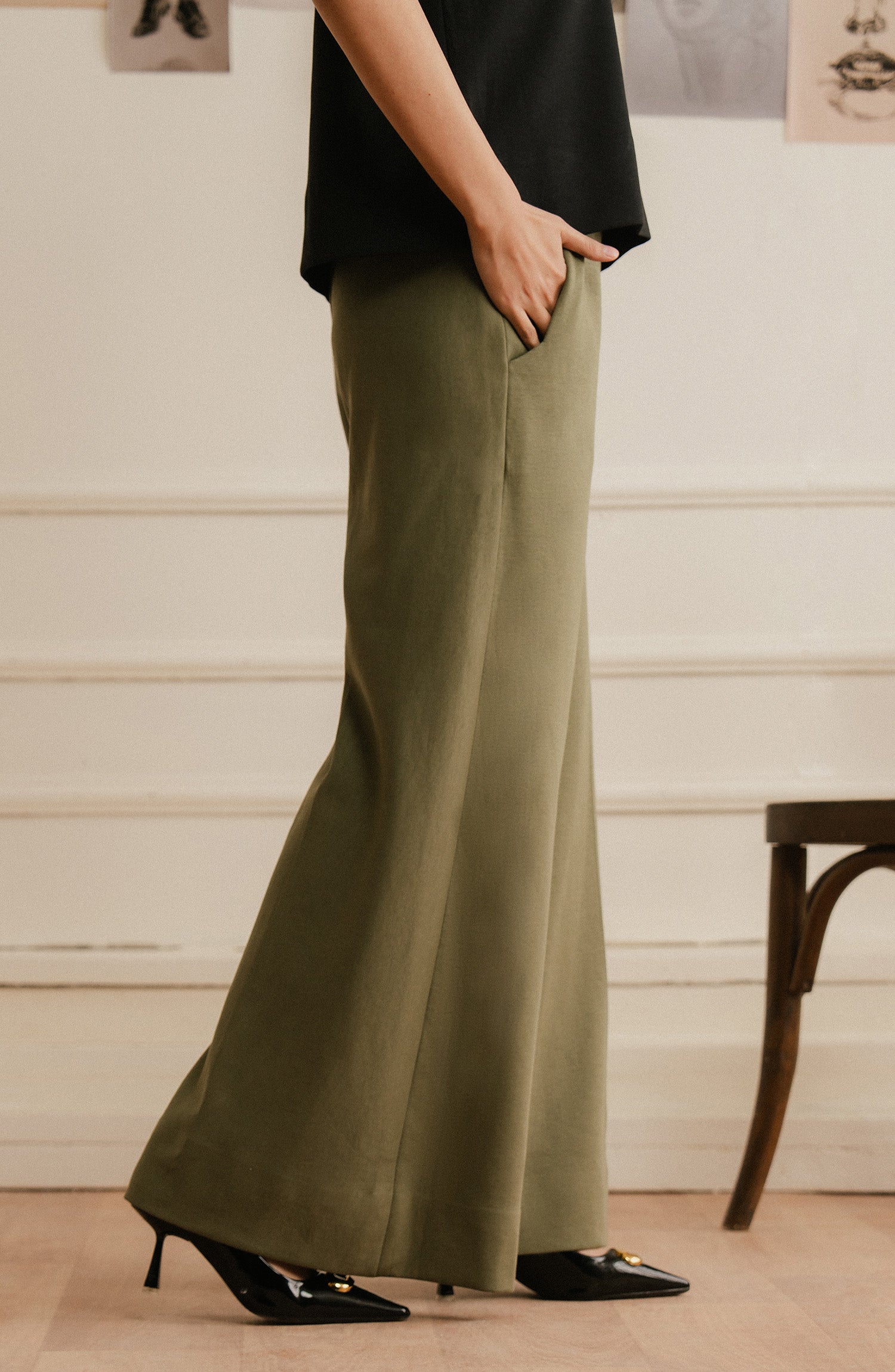 Stylish and adaptable, wide-leg olive green pants elevate any outfit.