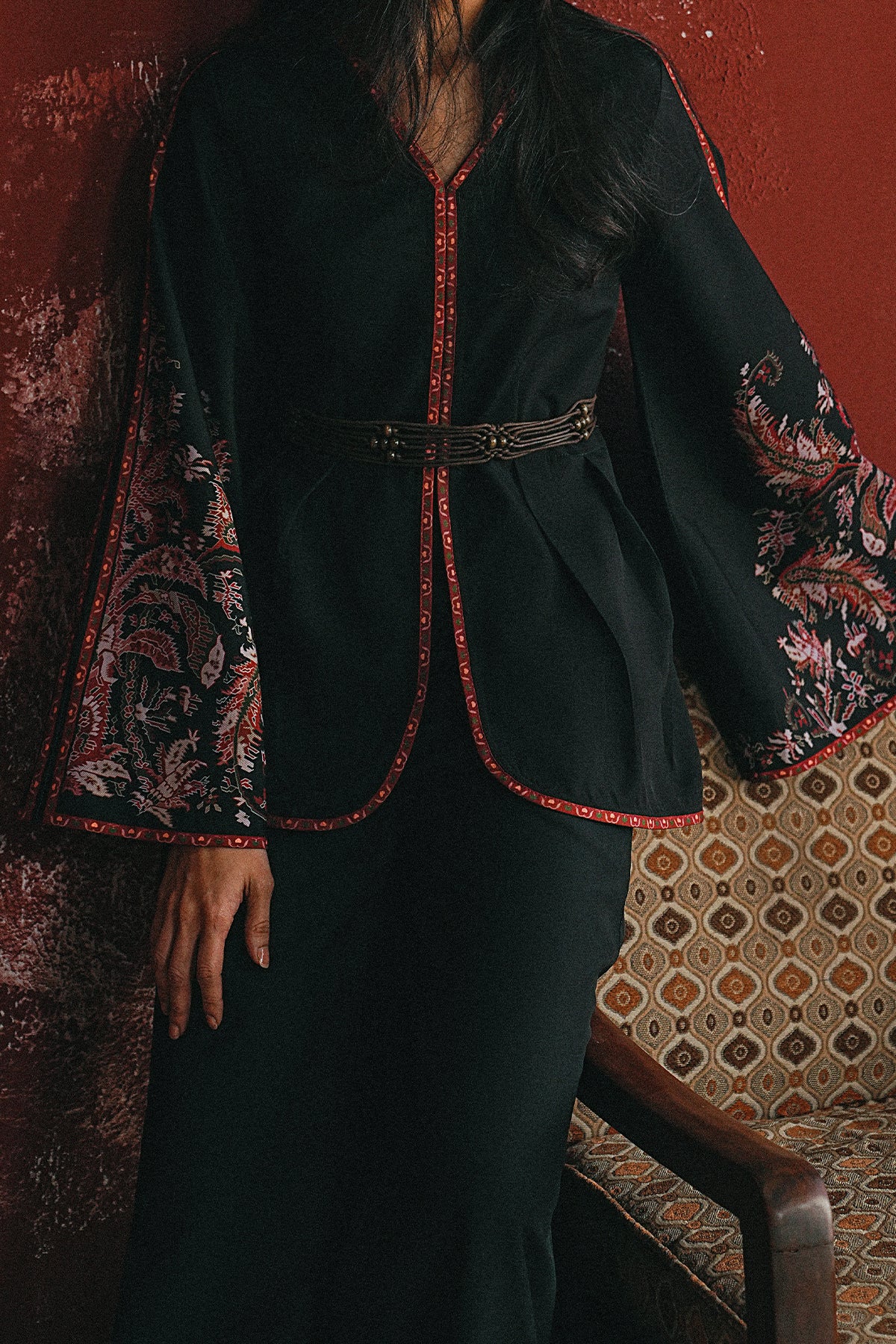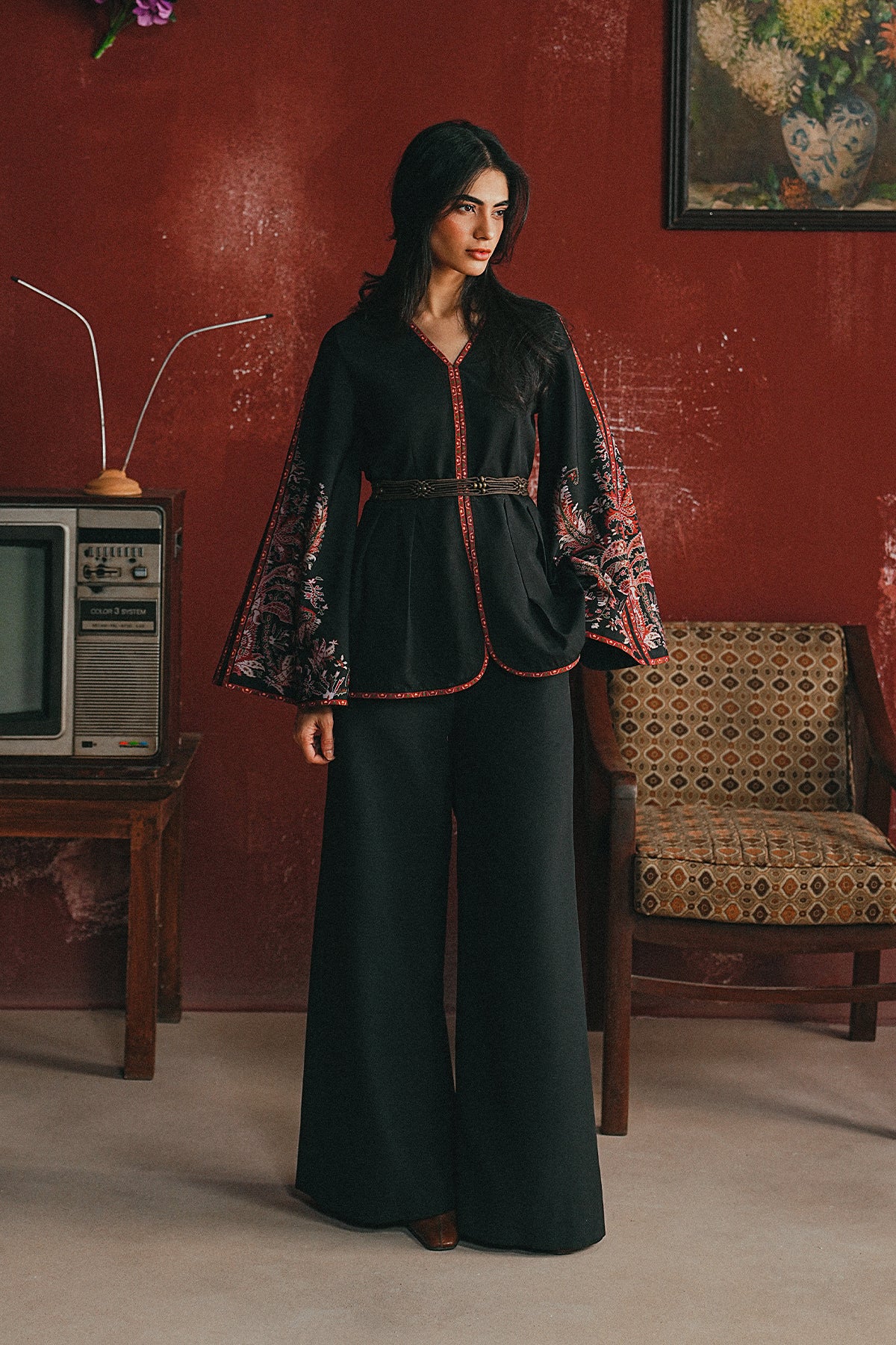 A black two-piece defined by its crimson-trimmed curves and dramatic printed sleeves — an easy statement set you can style with minimal jewelry and sleek hair to let the silhouette speak.