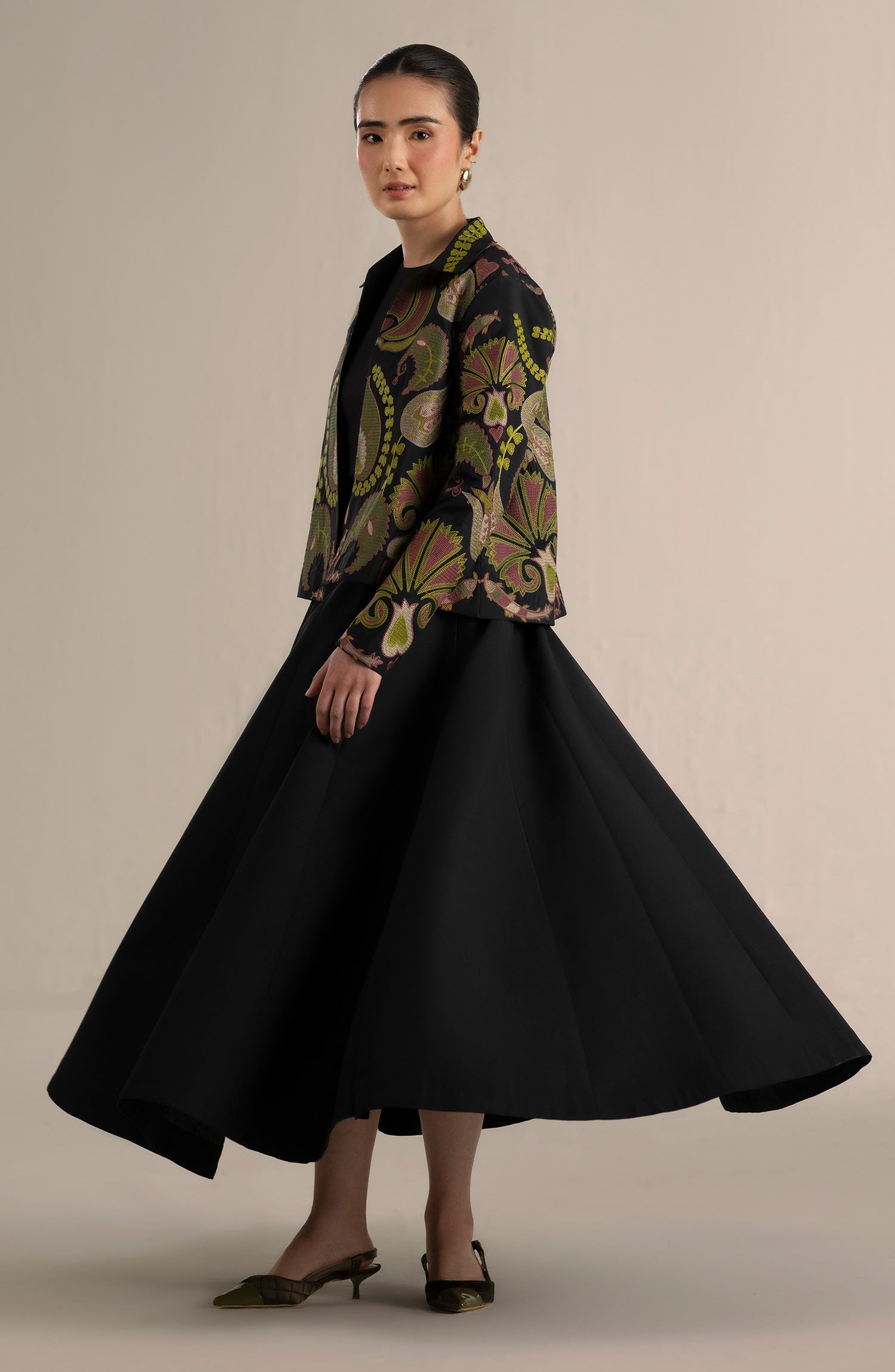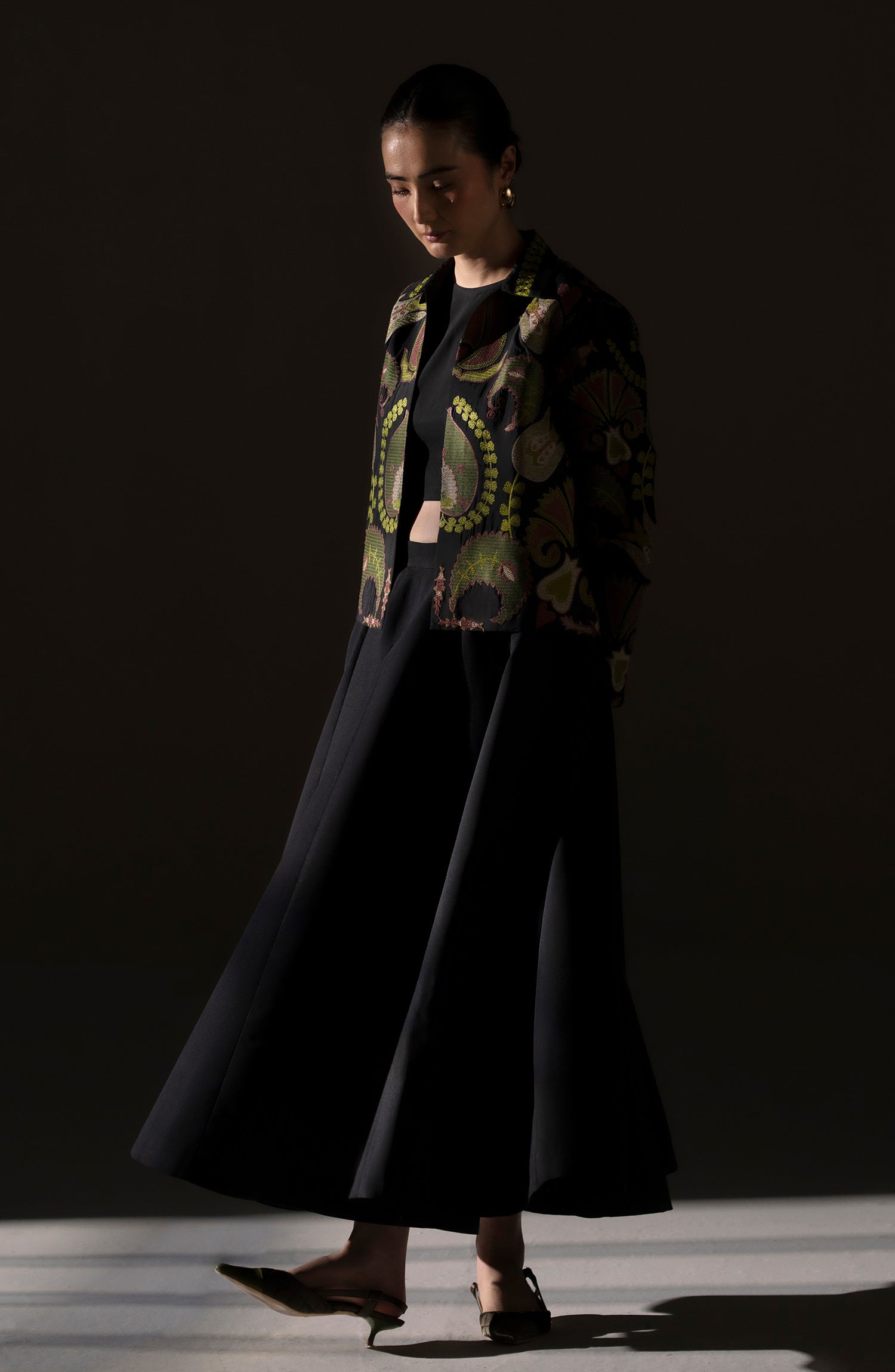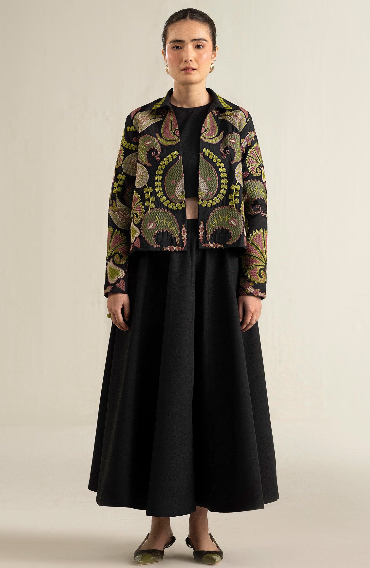 The black embroidered jacket, paired with a crop top and skirt, is a timeless and adaptable piece for summer wardrobe.