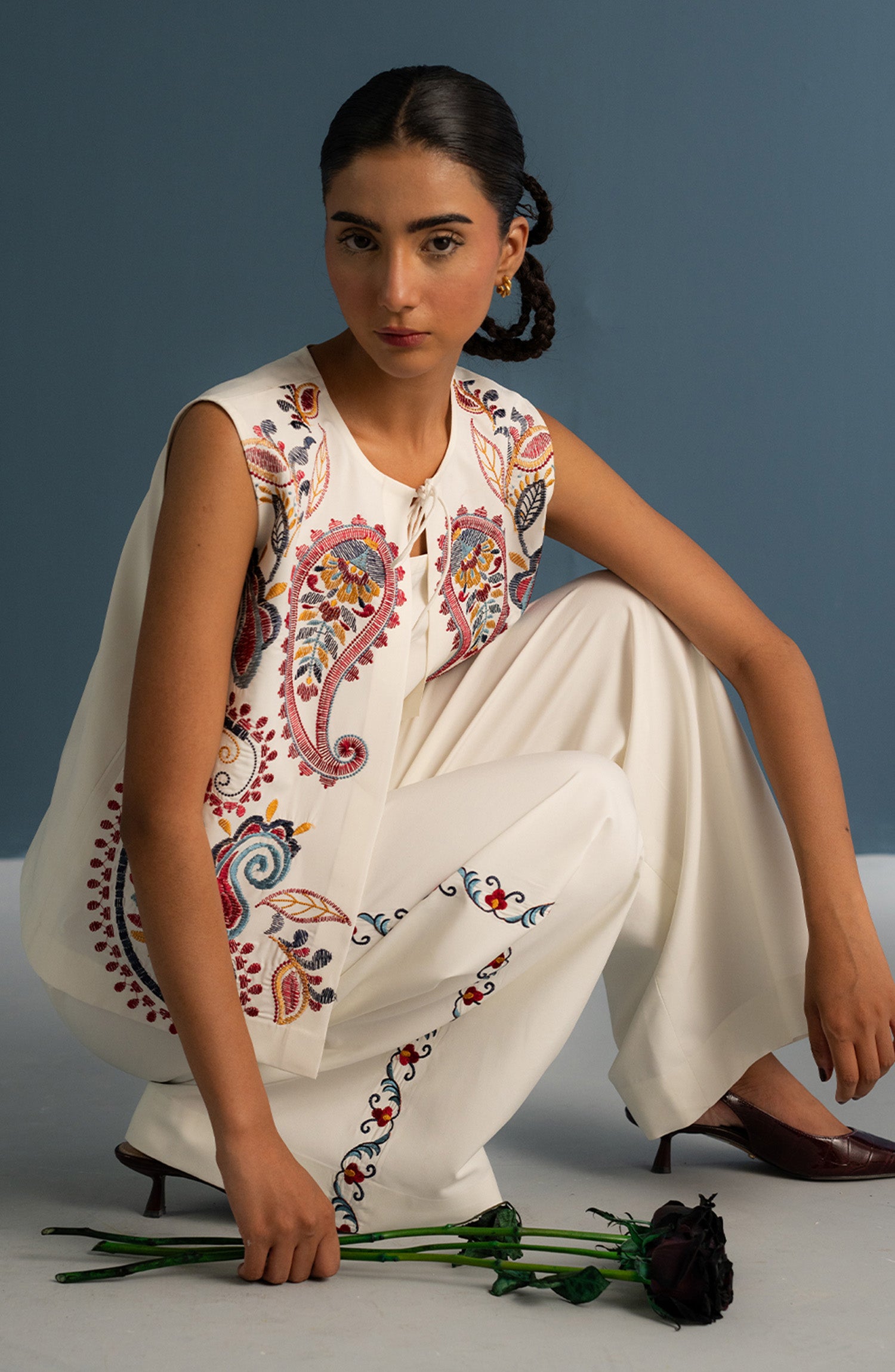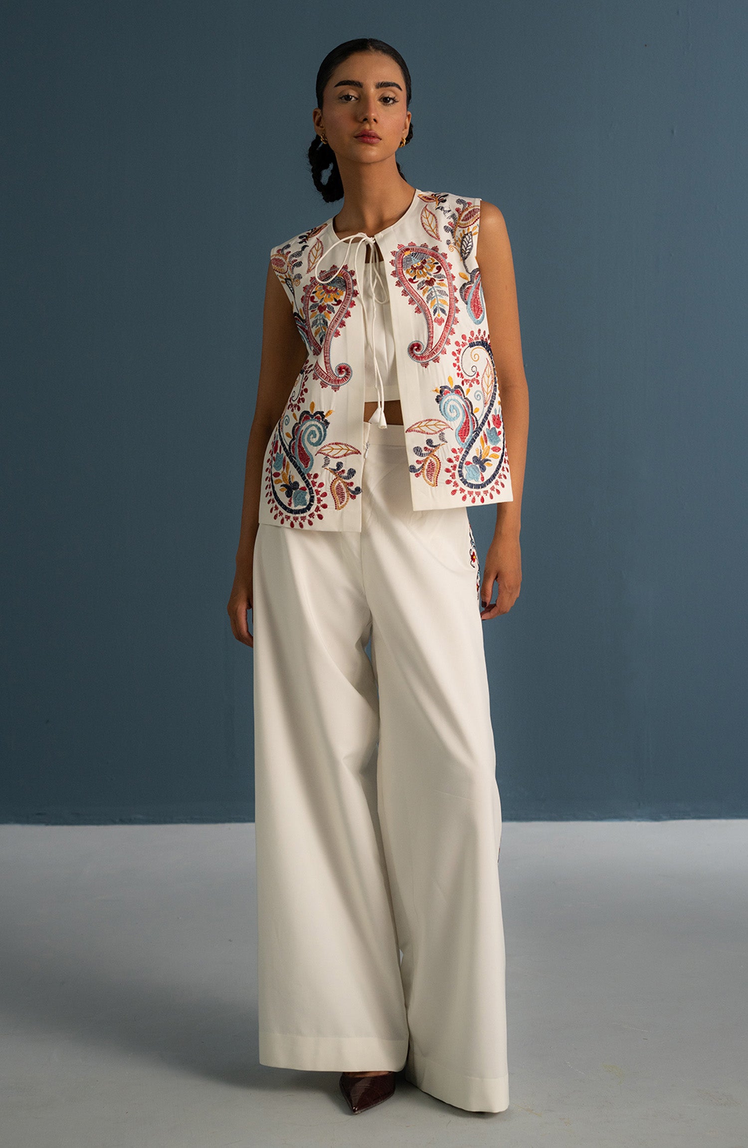 Every look, a love letter to summer. Crisp white meets bold print — tailored pants ground the look, while the statement jacket steals the spotlight with every color and curve. A blend of polish and personality.