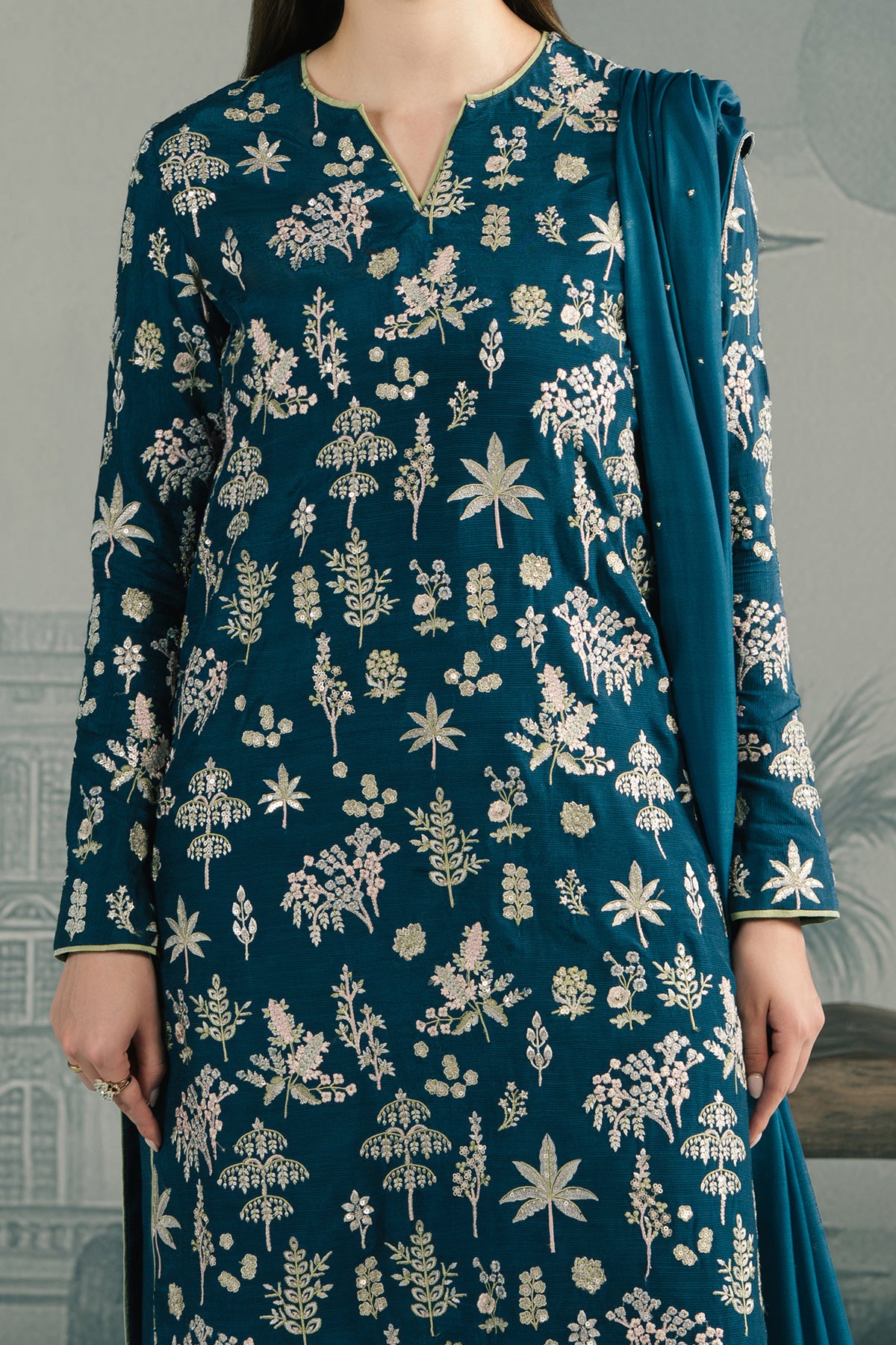 Gracefully crafted embroidered raw silk outfit in deep blue, featuring delicate floral patterns paired with matching embrioded trouser and a coordinating chiffon silk dupatta for an elegant, timeless look.