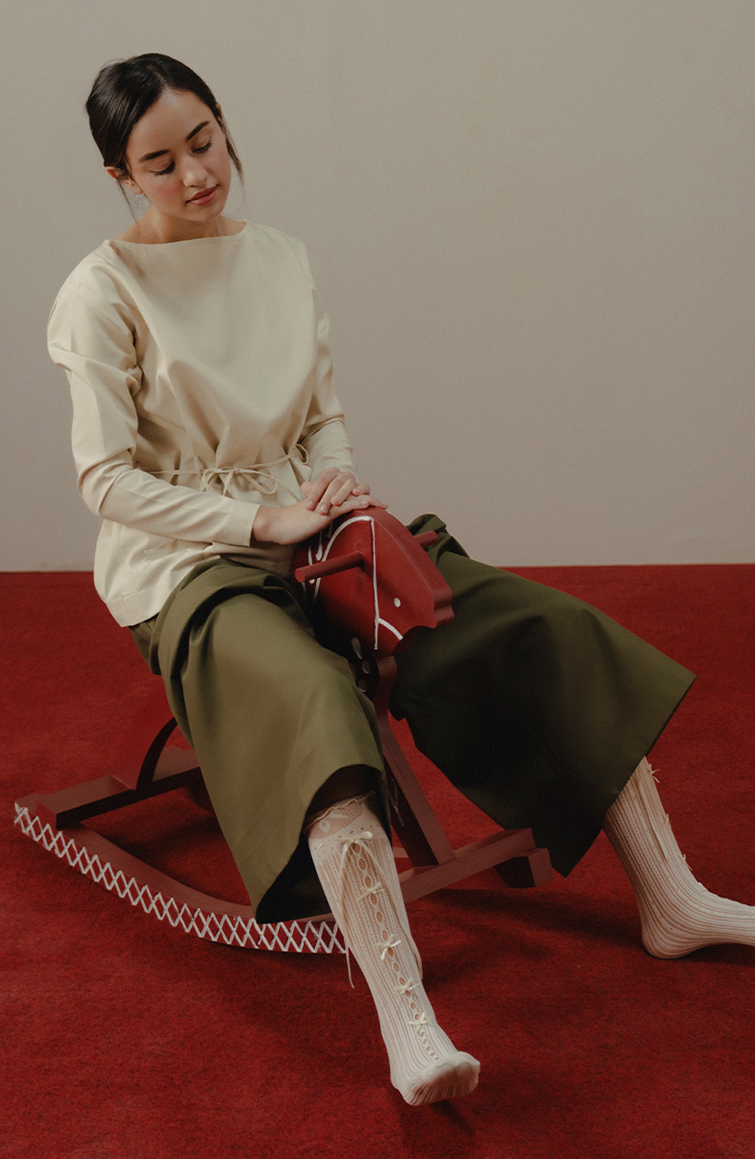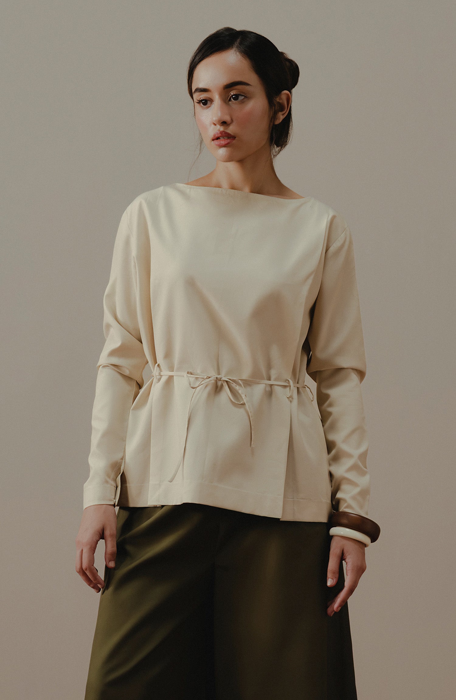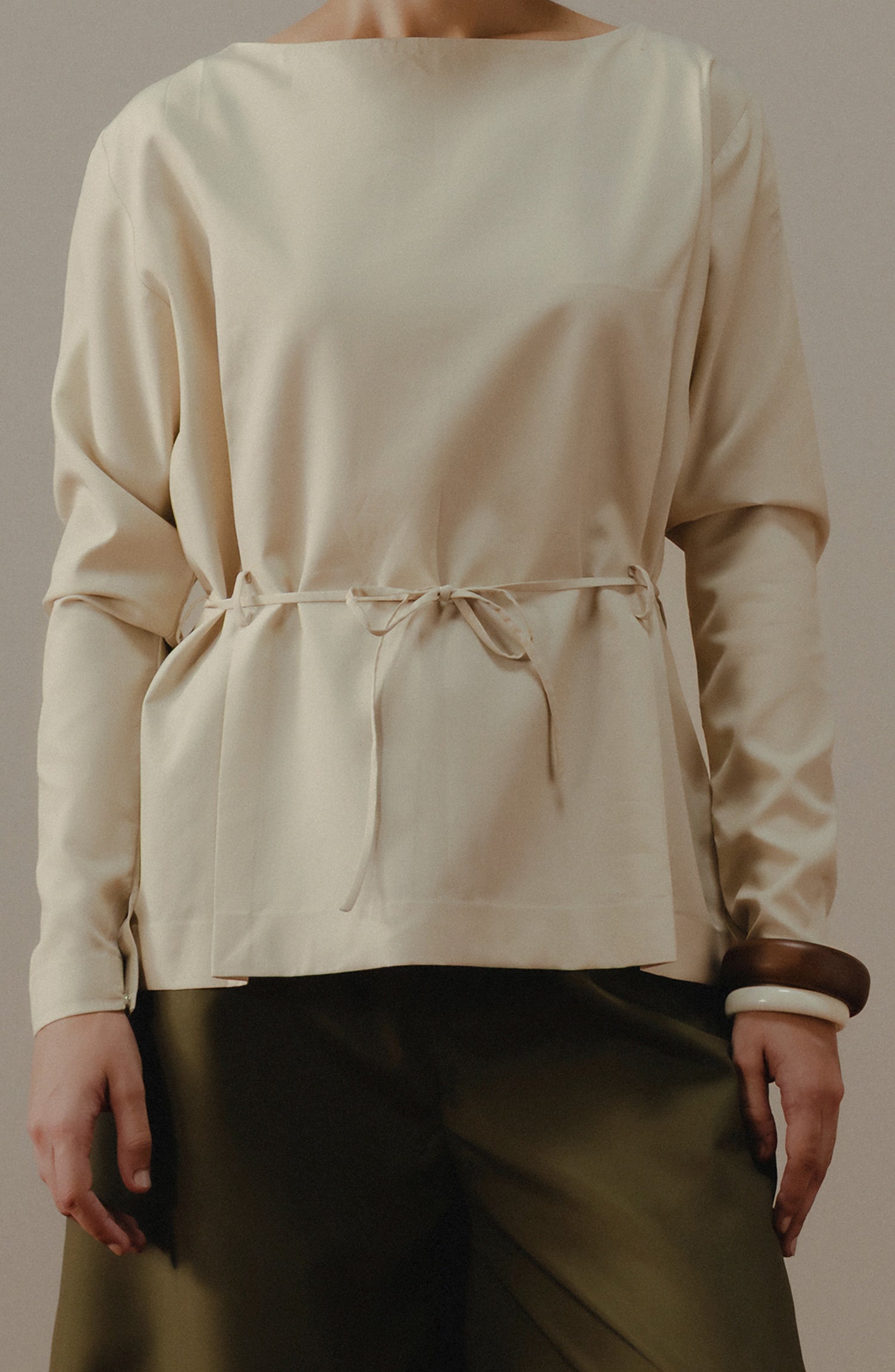 A soft cream long-sleeve top with a cinched waist, adding subtle shape while keeping the silhouette relaxed. Paired with flowy olive wide-leg pants, it strikes the perfect balance between comfort and sophistication.
