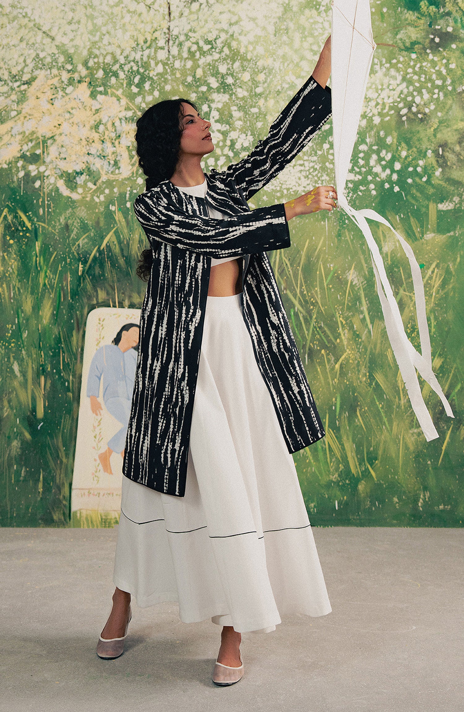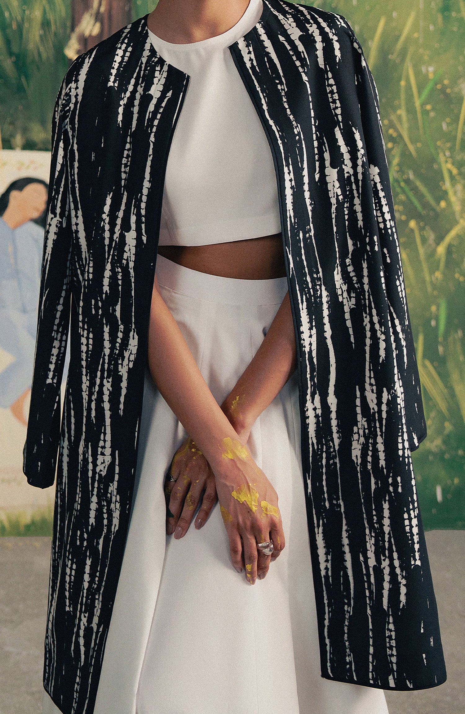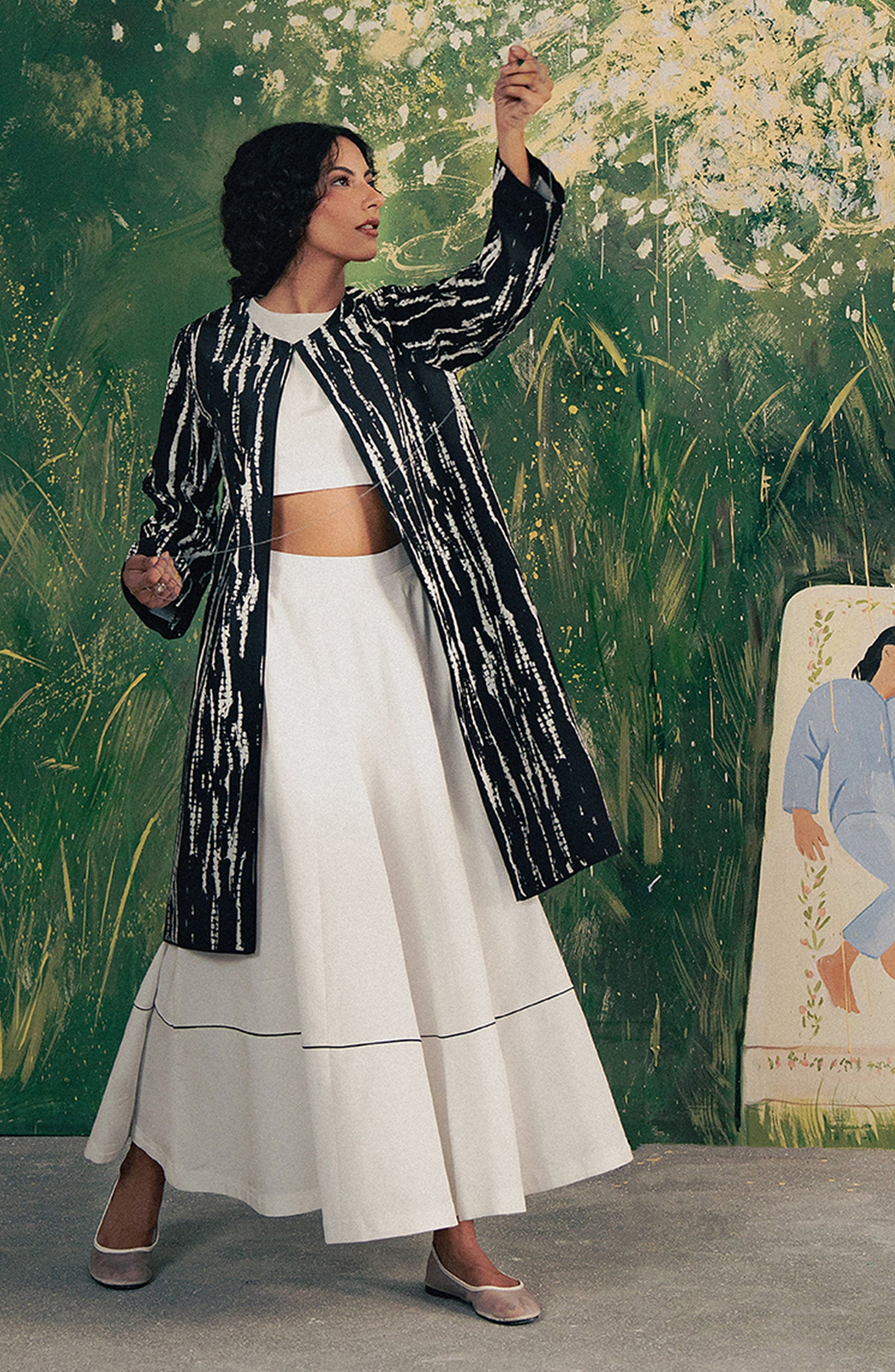 Dramatic and Feminine A bold black overlayer with painterly white strokes paired with a minimal white co-ord — graphic grounded and gracefully modern