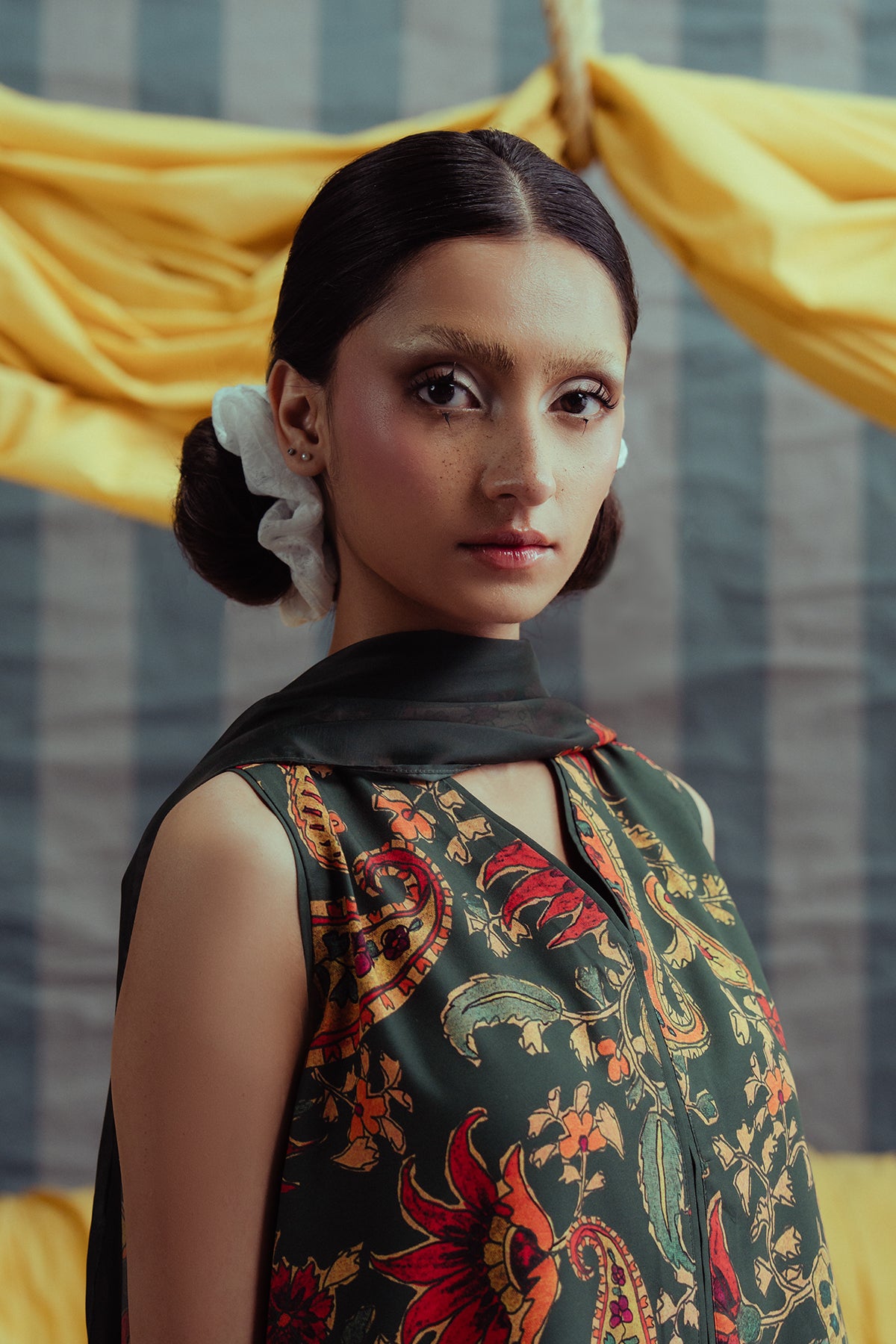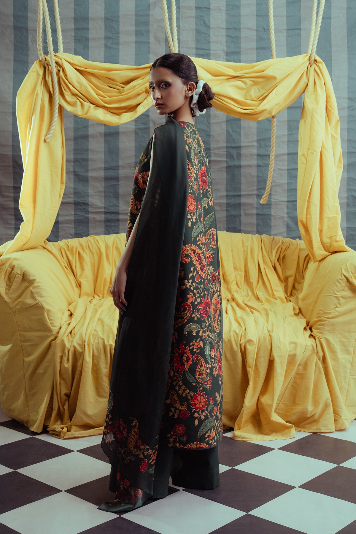 Unveil effortless style with this printed green shirt and trouser set, elevated by a luxurious silk drape and adorned with delicate paisley prints. The rich green tones and flowing silhouette strike the perfect balance between tradition and modern chic.