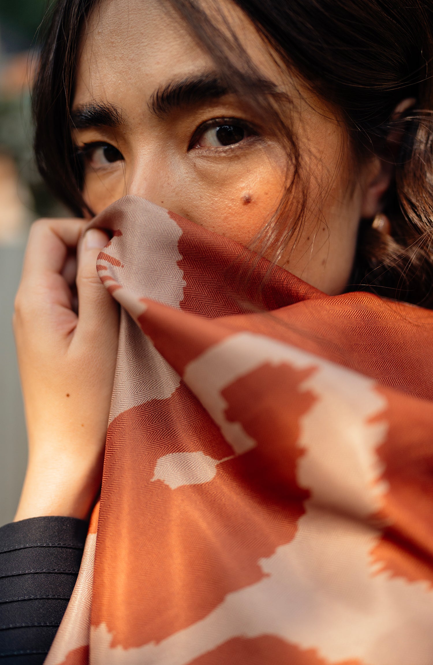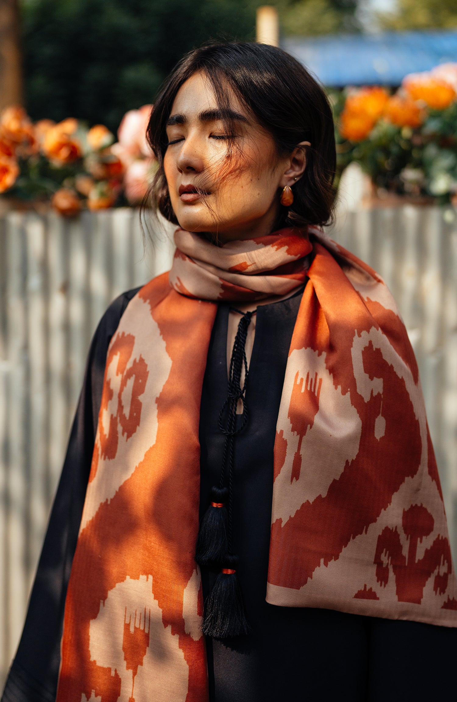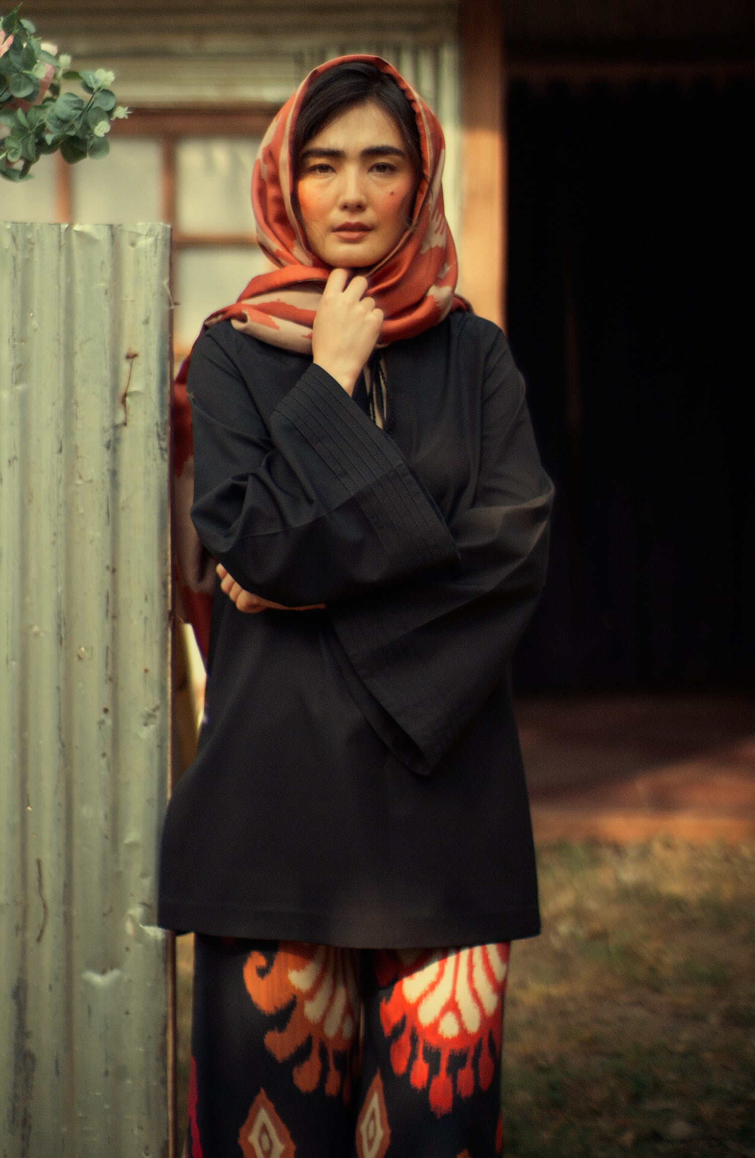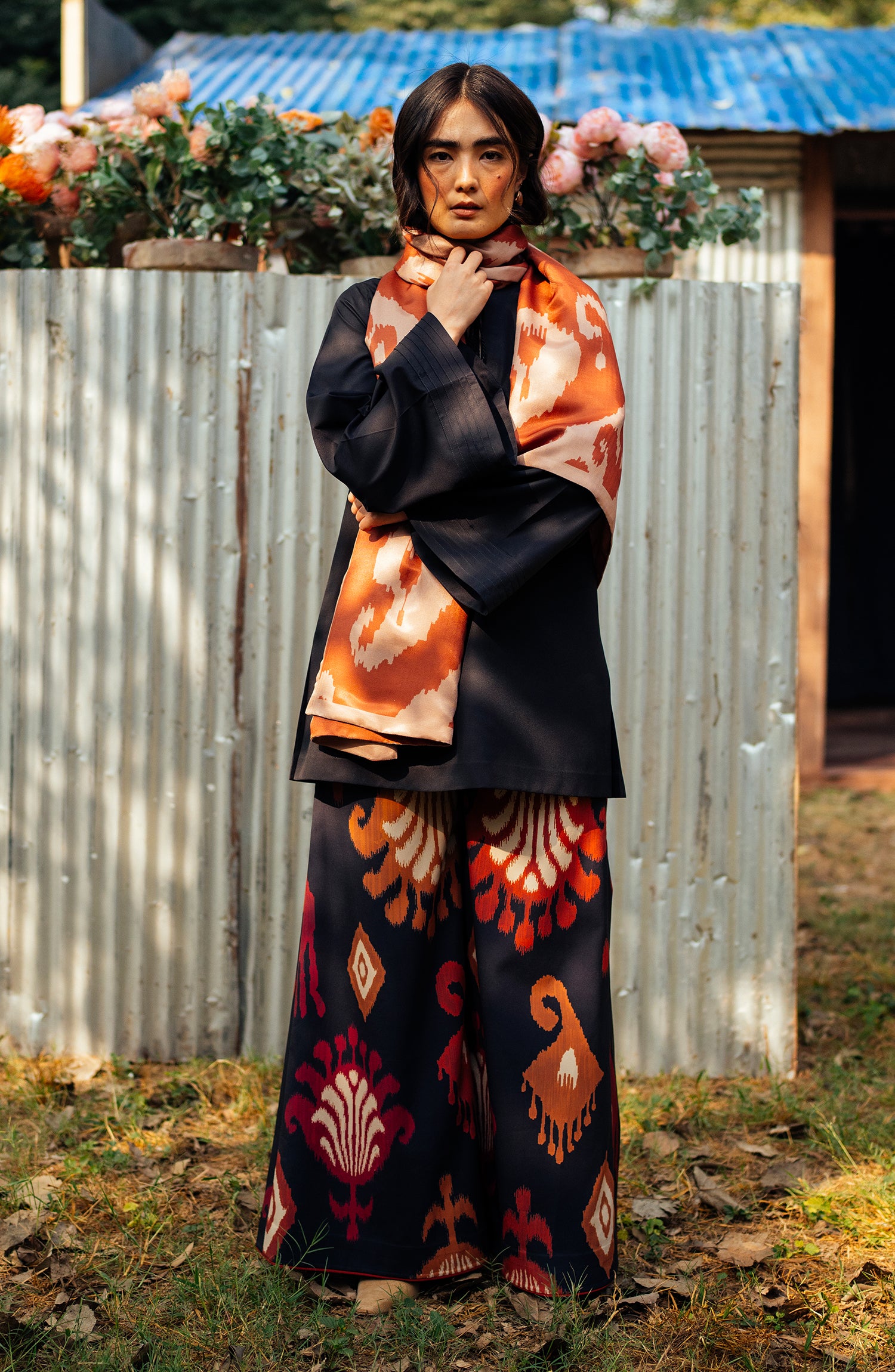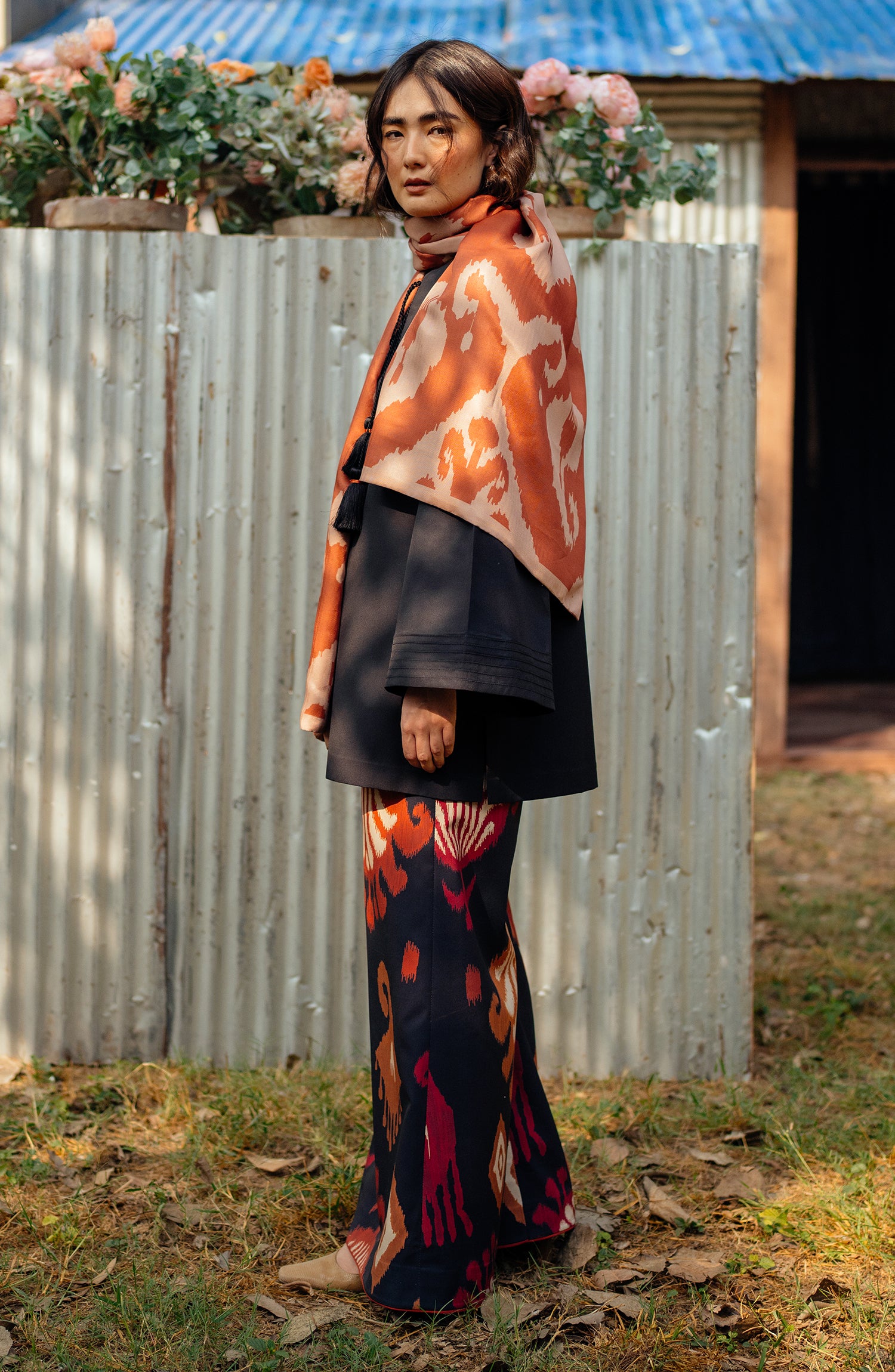 A black canvas wrapped in warm elegance and delicate dori tassel and binding detailing. It can be paired with a printed scarf.