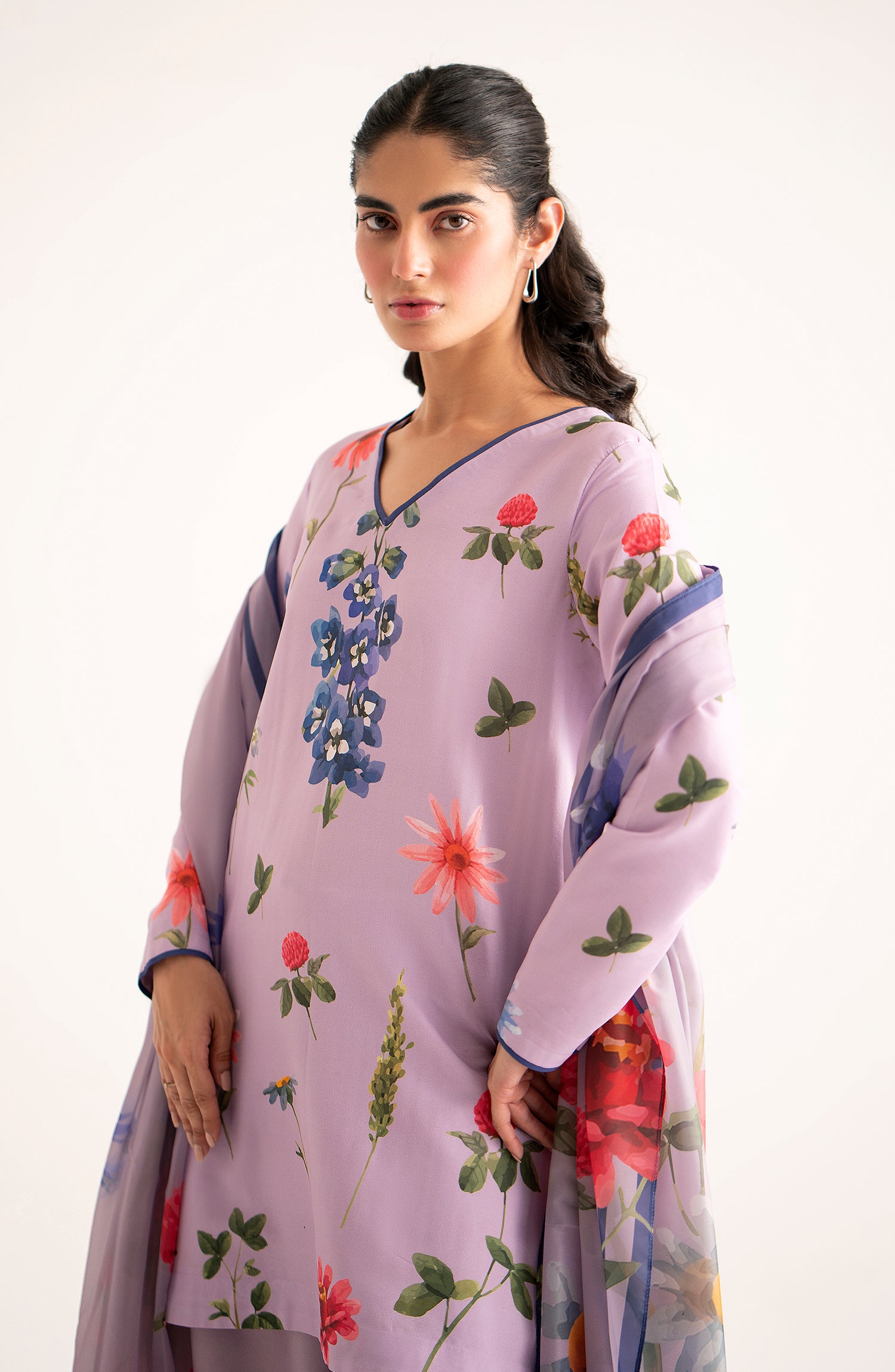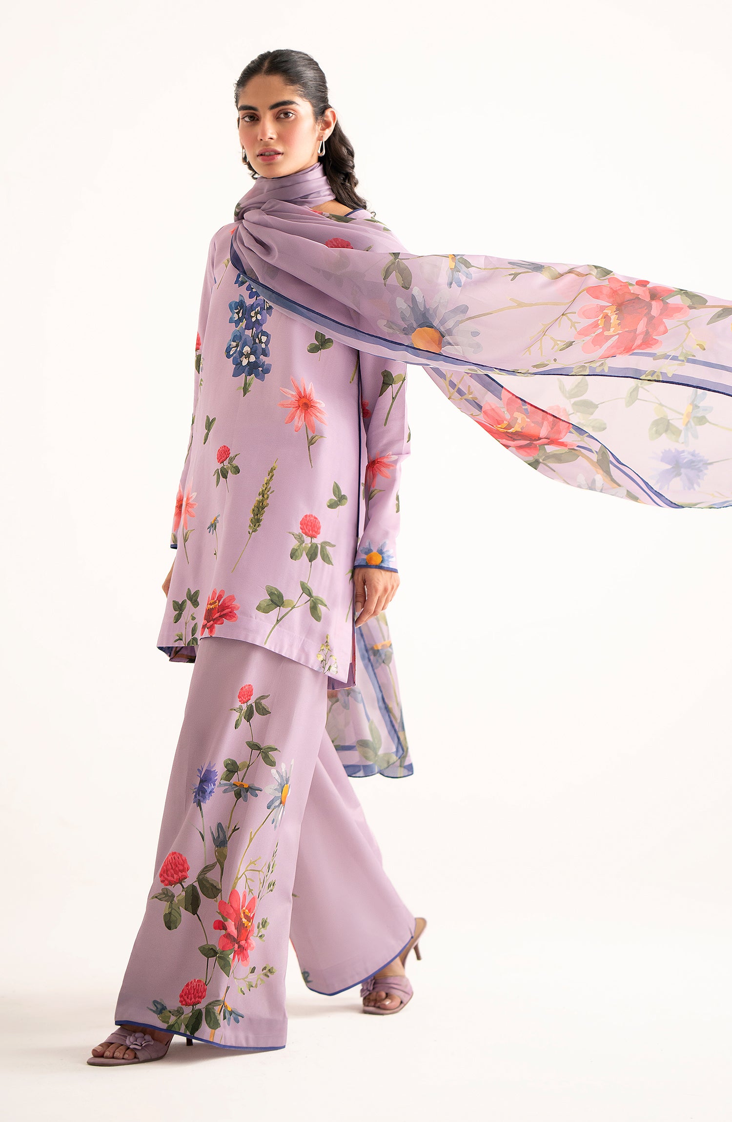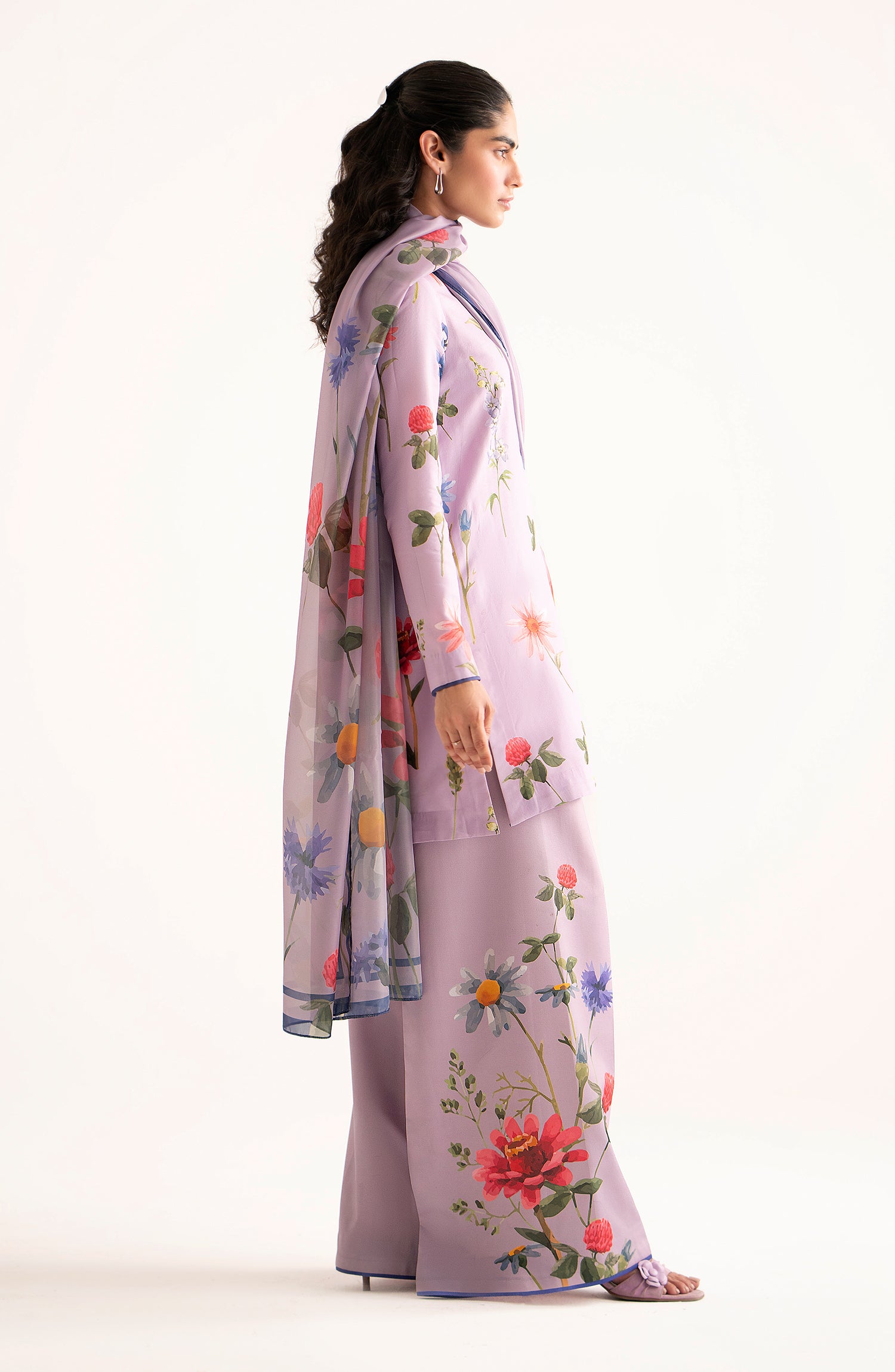 Bring glamour with this naturally lovely lilac mid-length floral shirt and straight pants.
