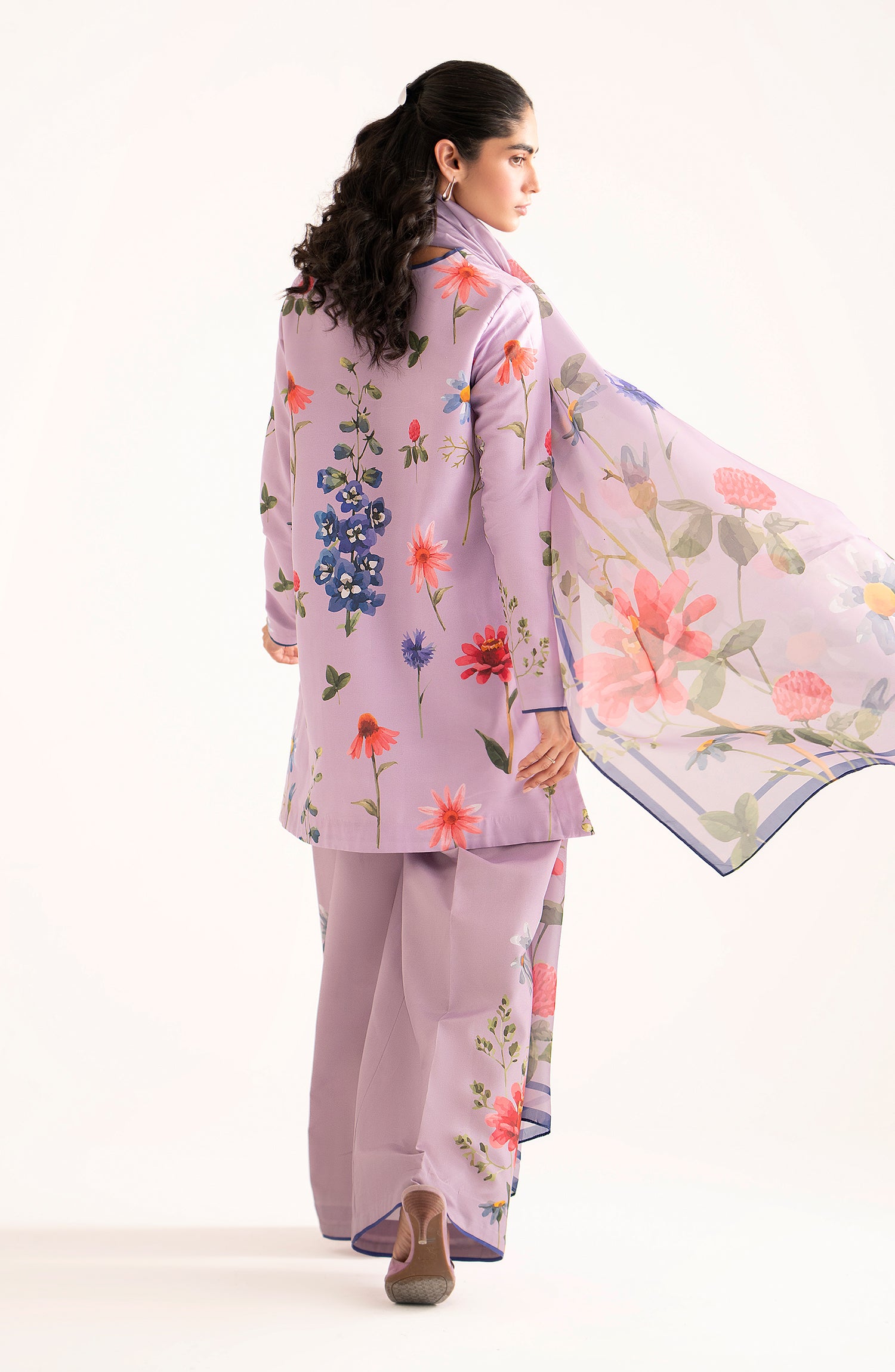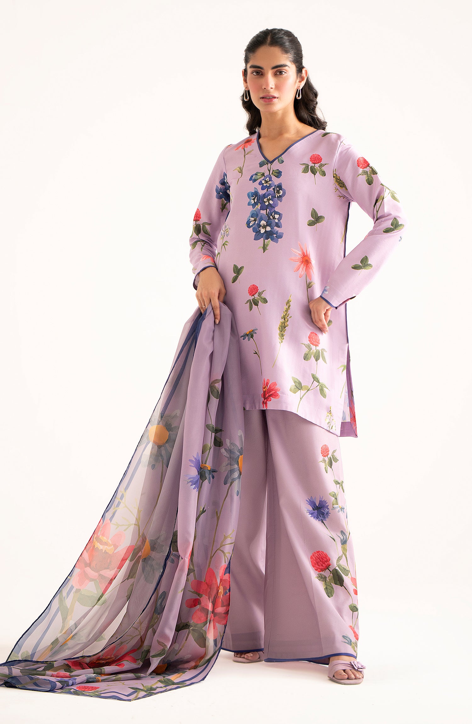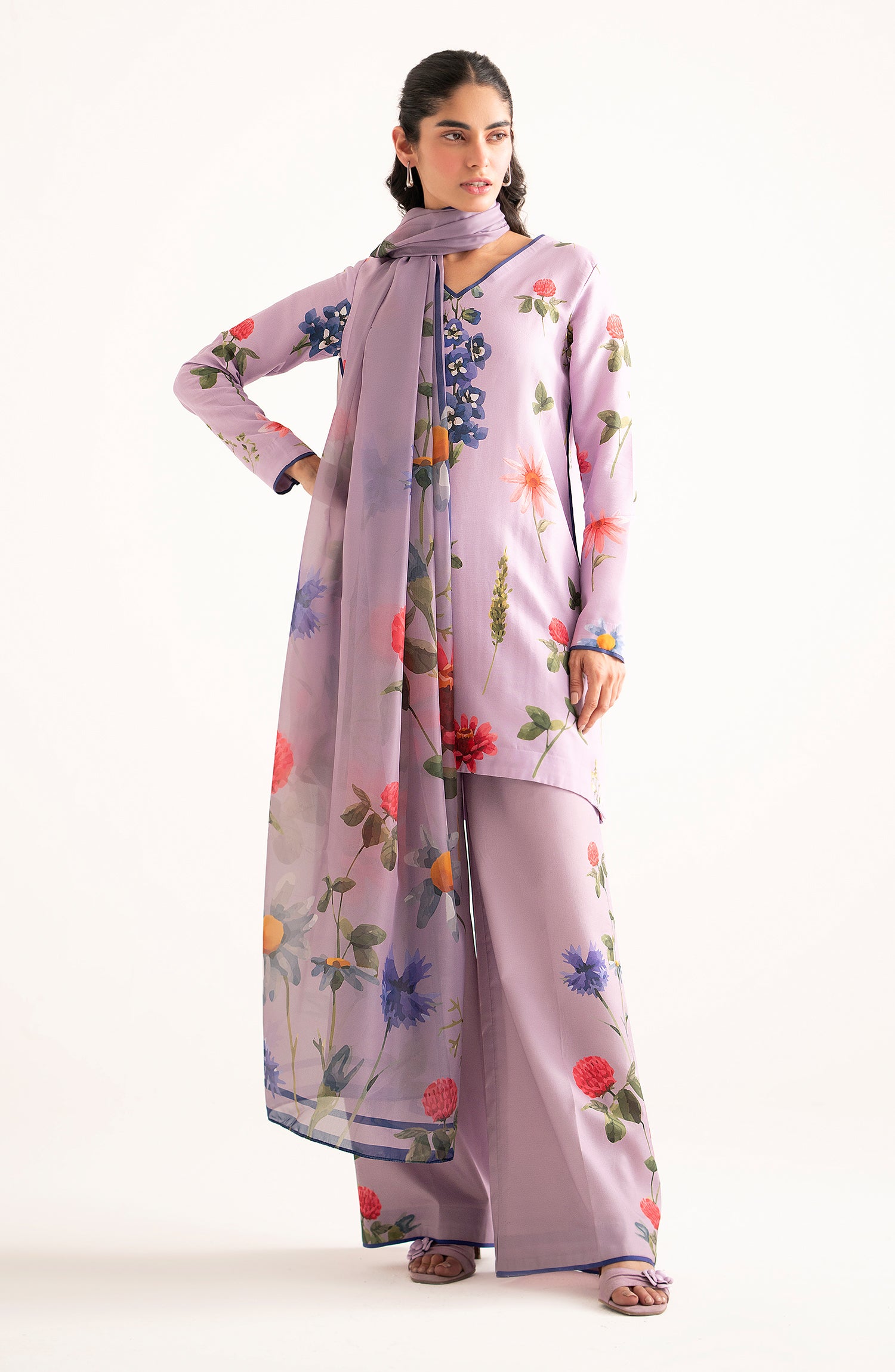 Bring glamour with this naturally lovely lilac mid-length floral shirt and straight pants.