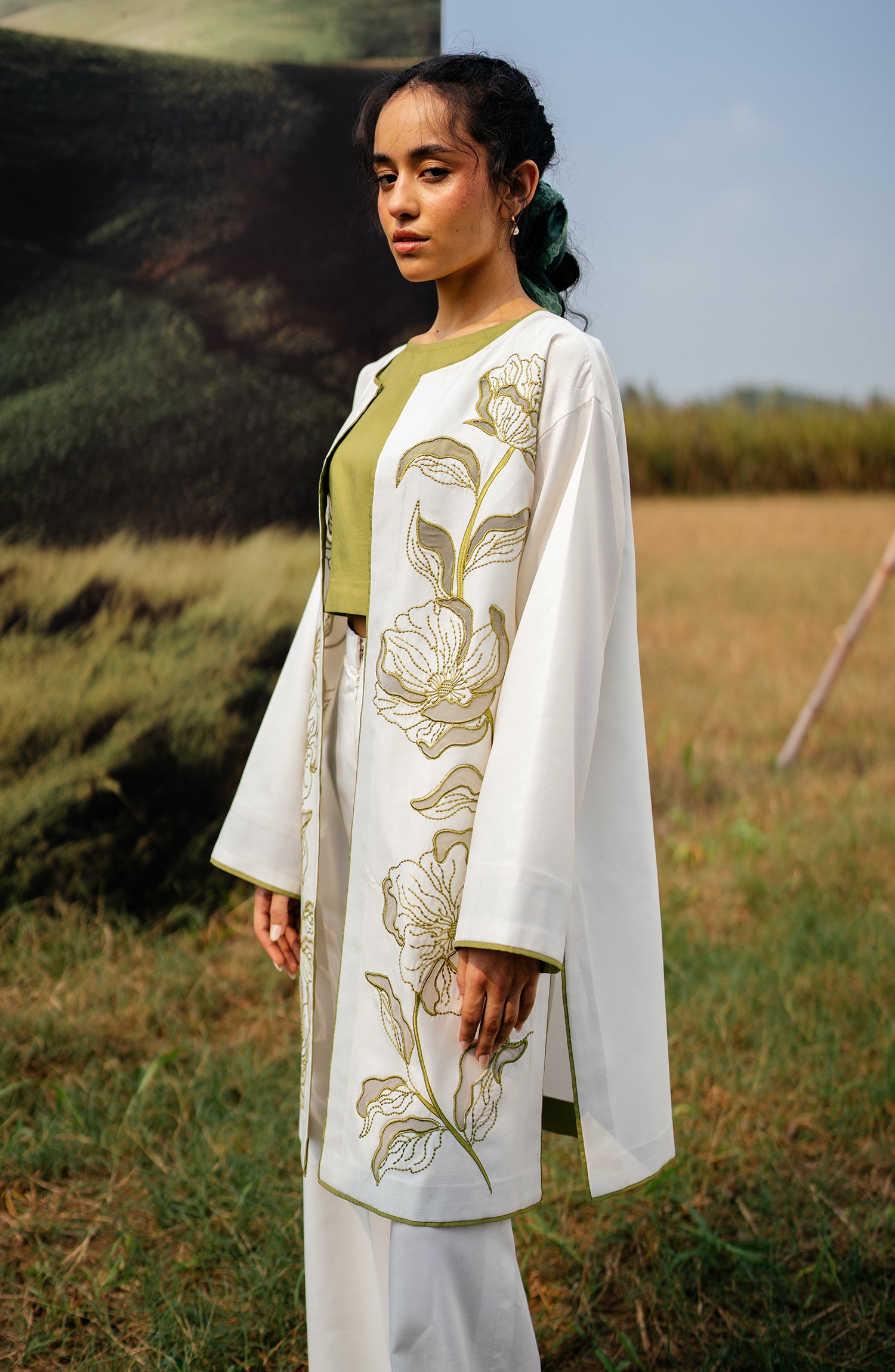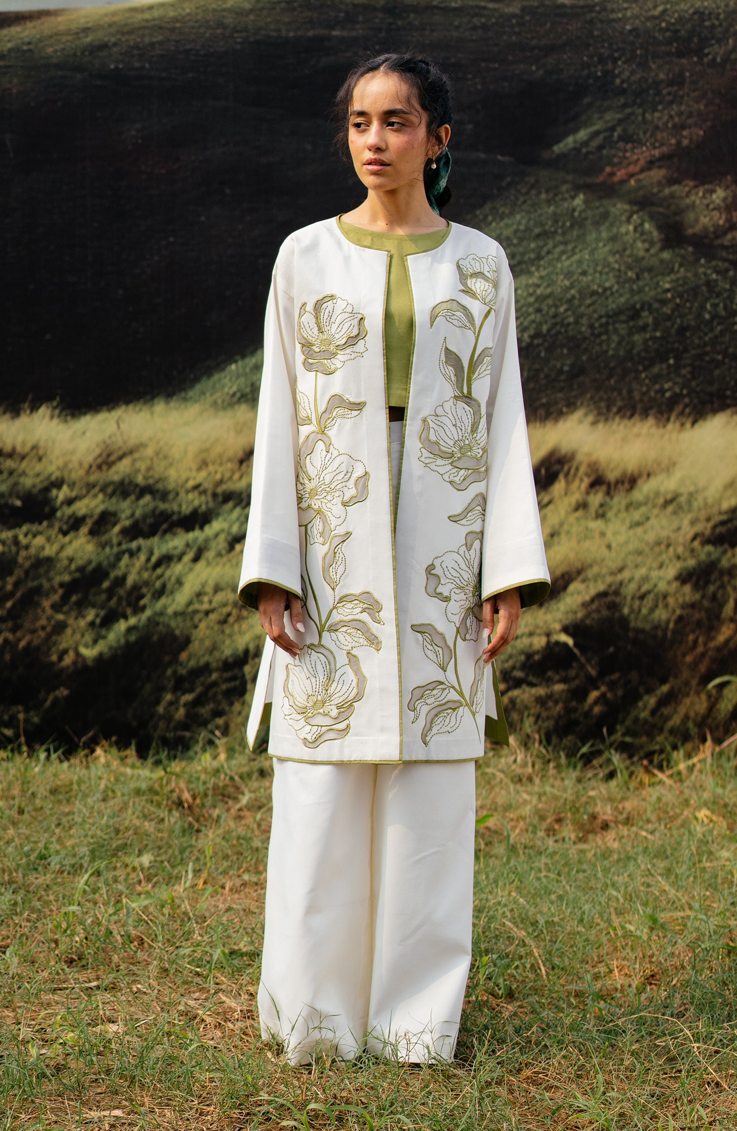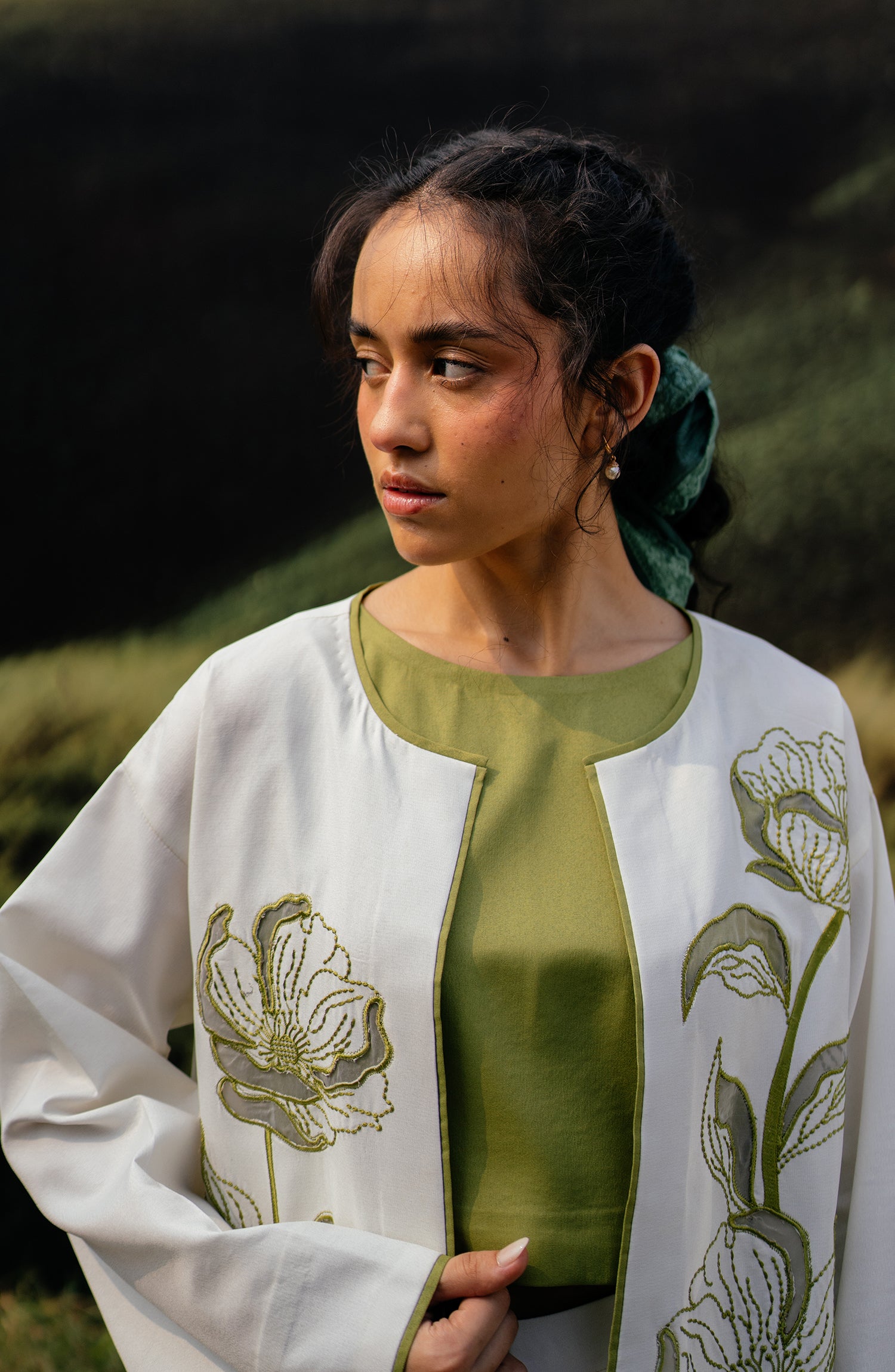 Patterns that bring flair to your festive look with ivory shrug accentuated with apple green embroidery and laser cut details.