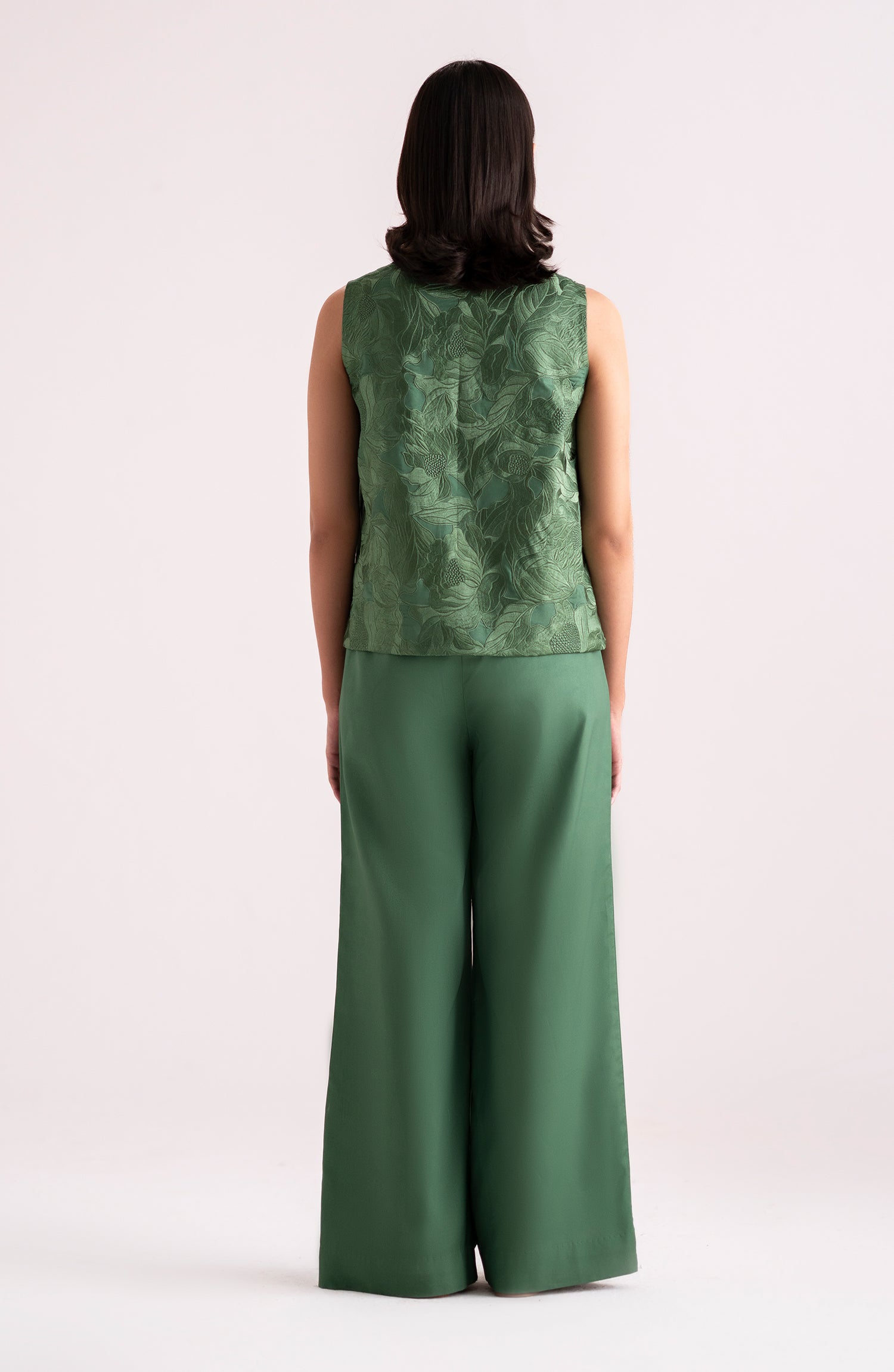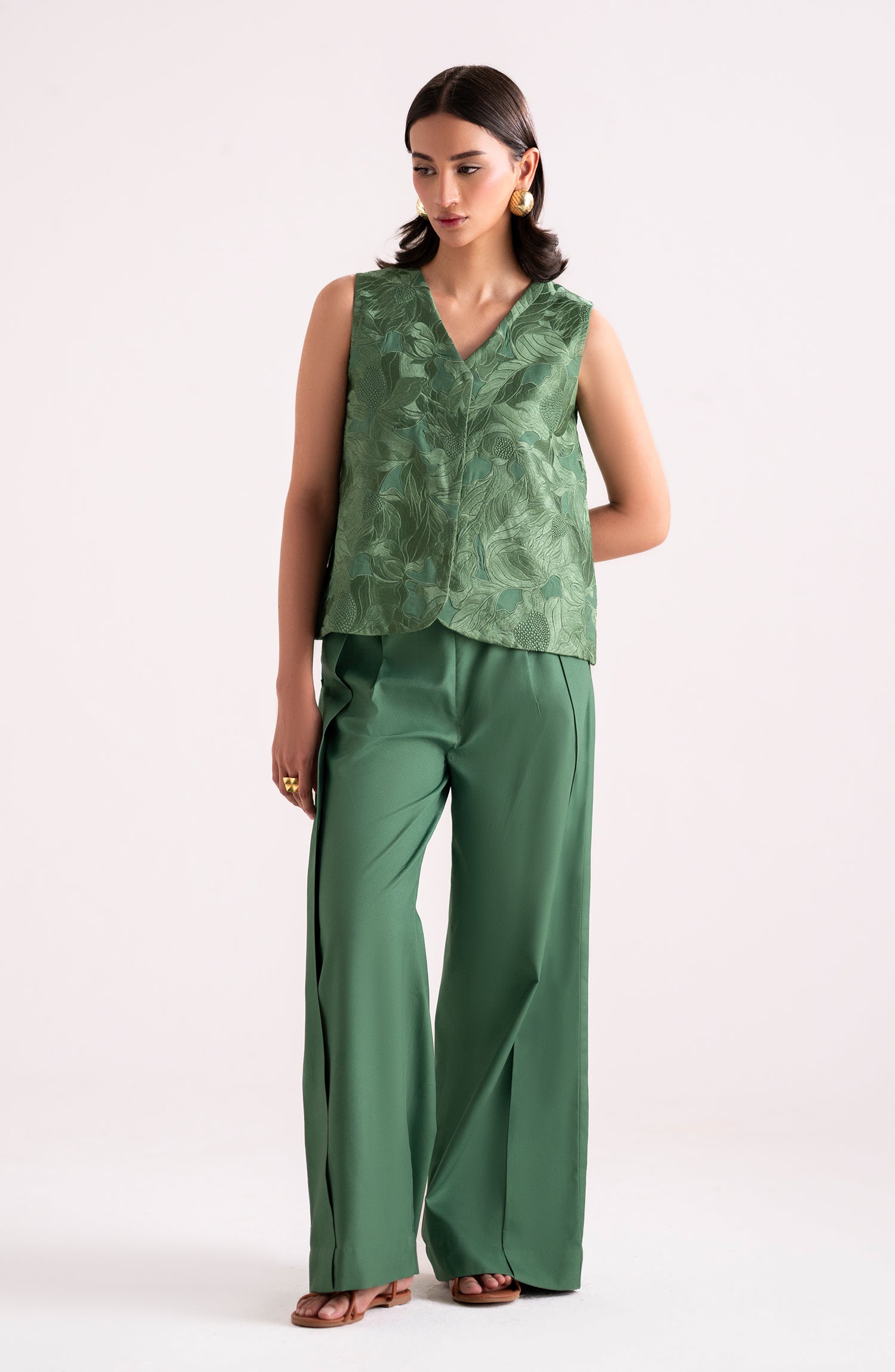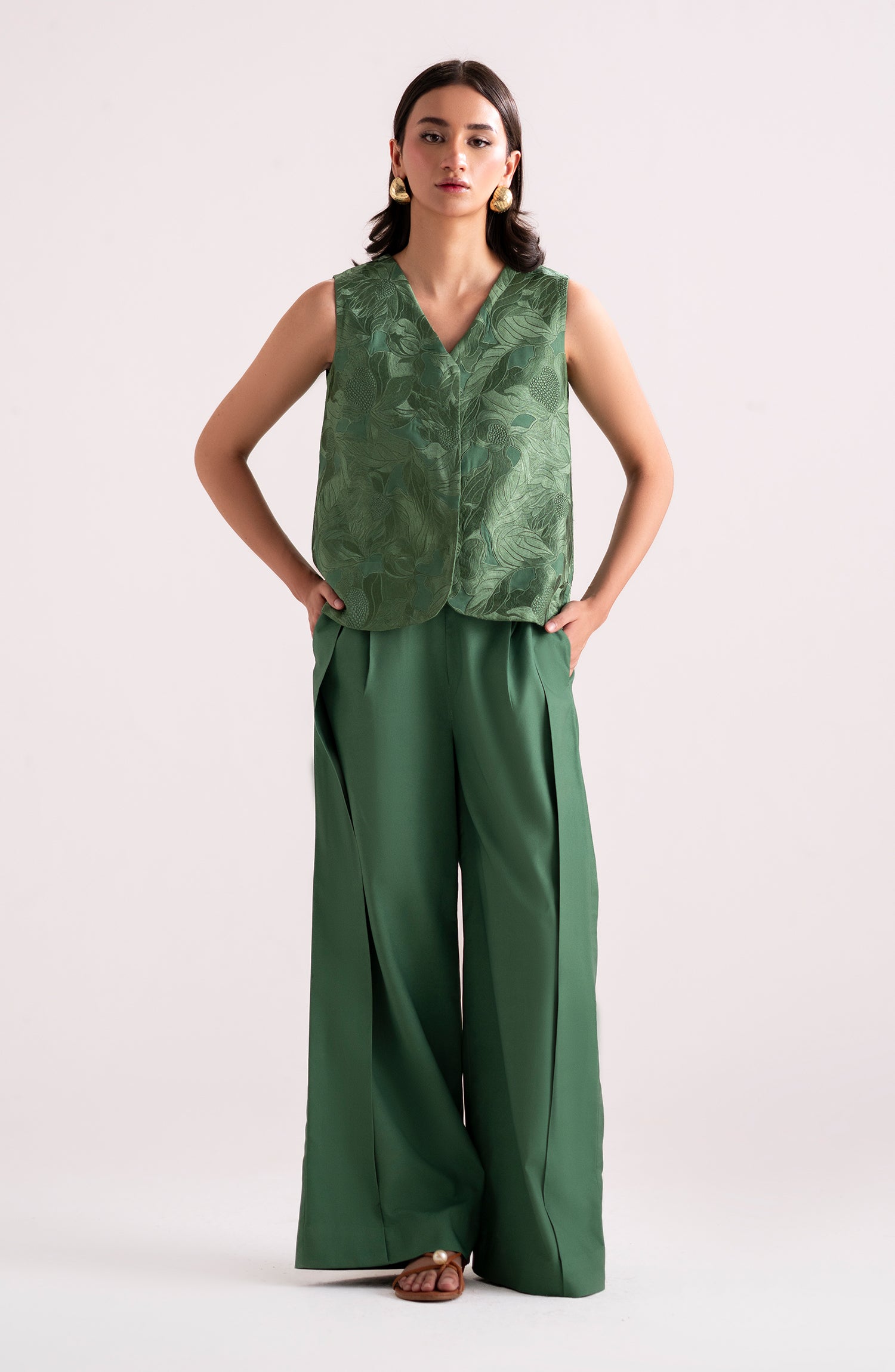 Elevate your style with an emerald green vest featuring intricate threadwork, paired with wide box pleated pants.