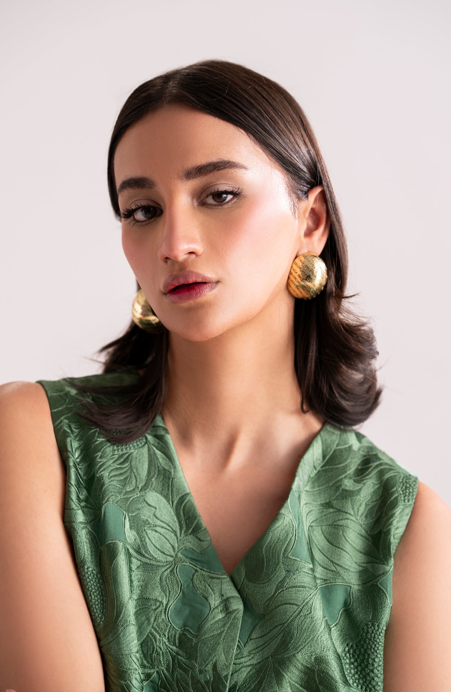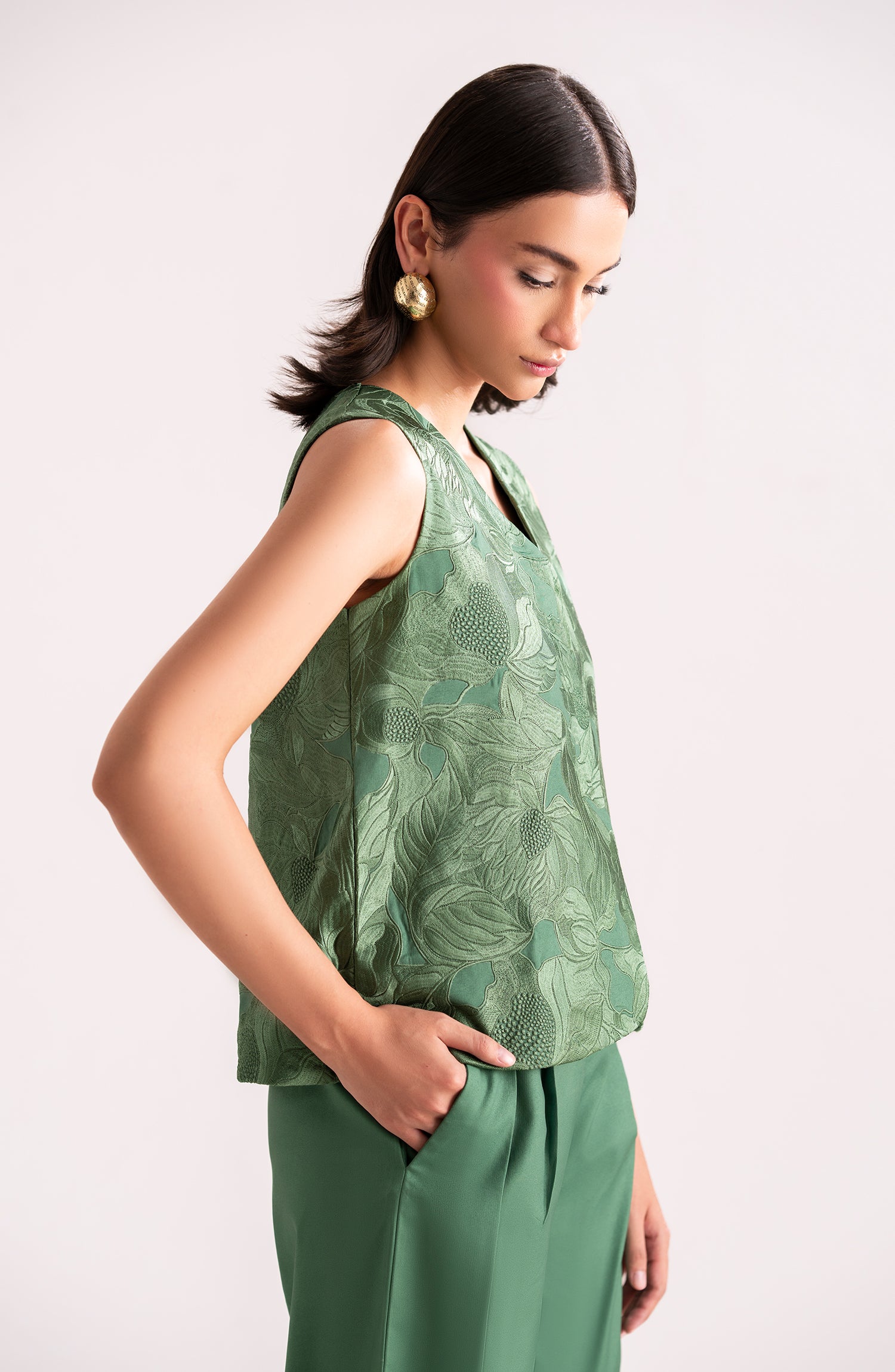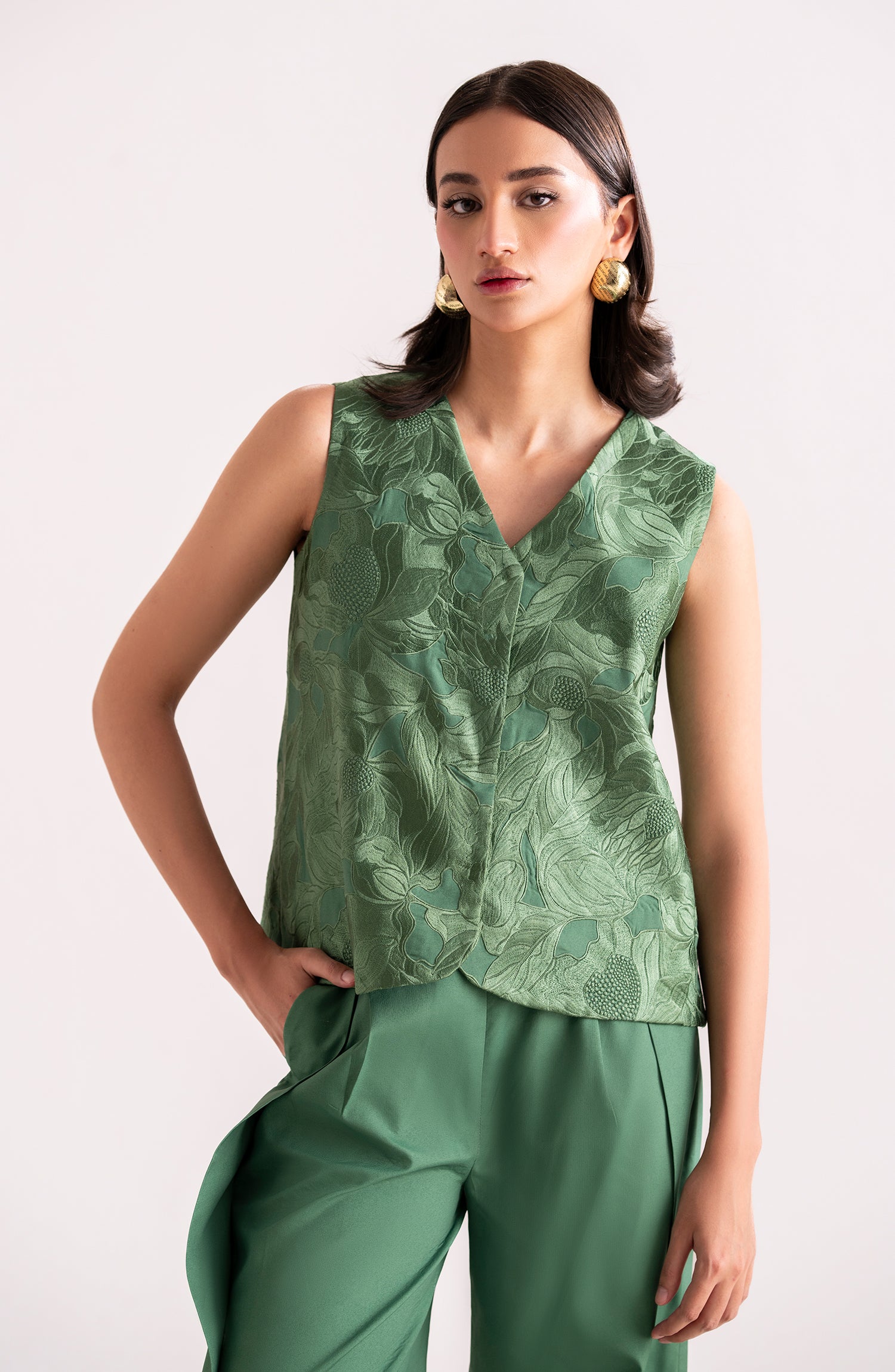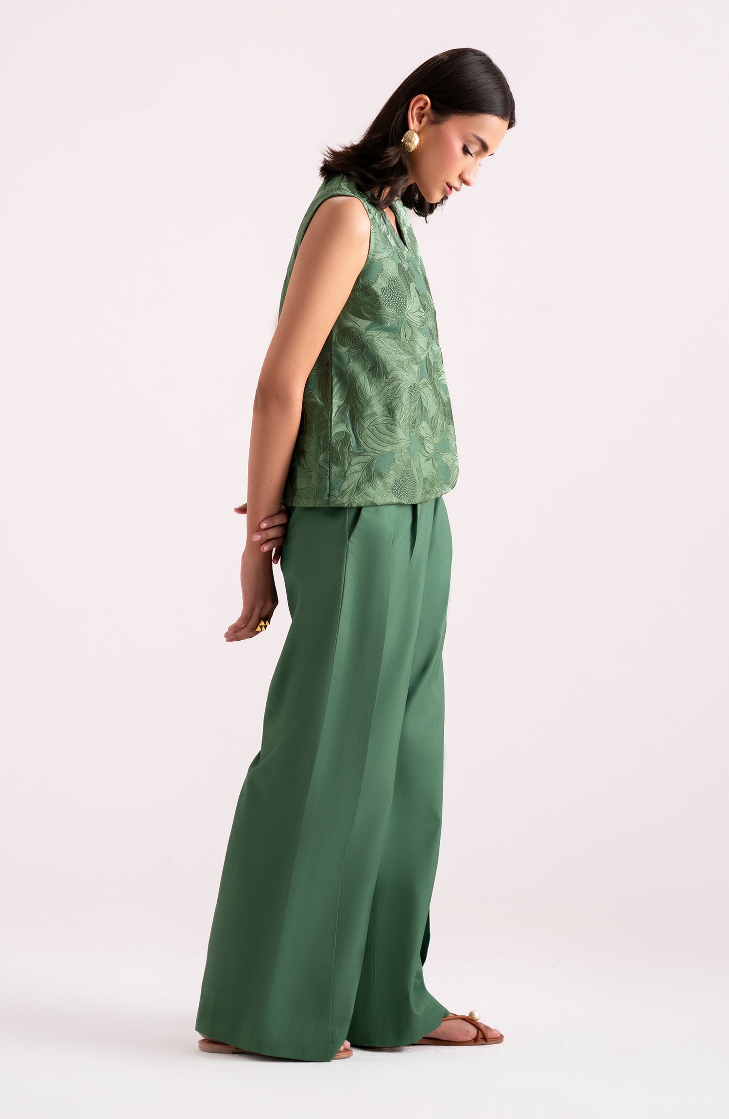 Elevate your style with an emerald green vest featuring intricate threadwork, paired with wide box pleated pants.