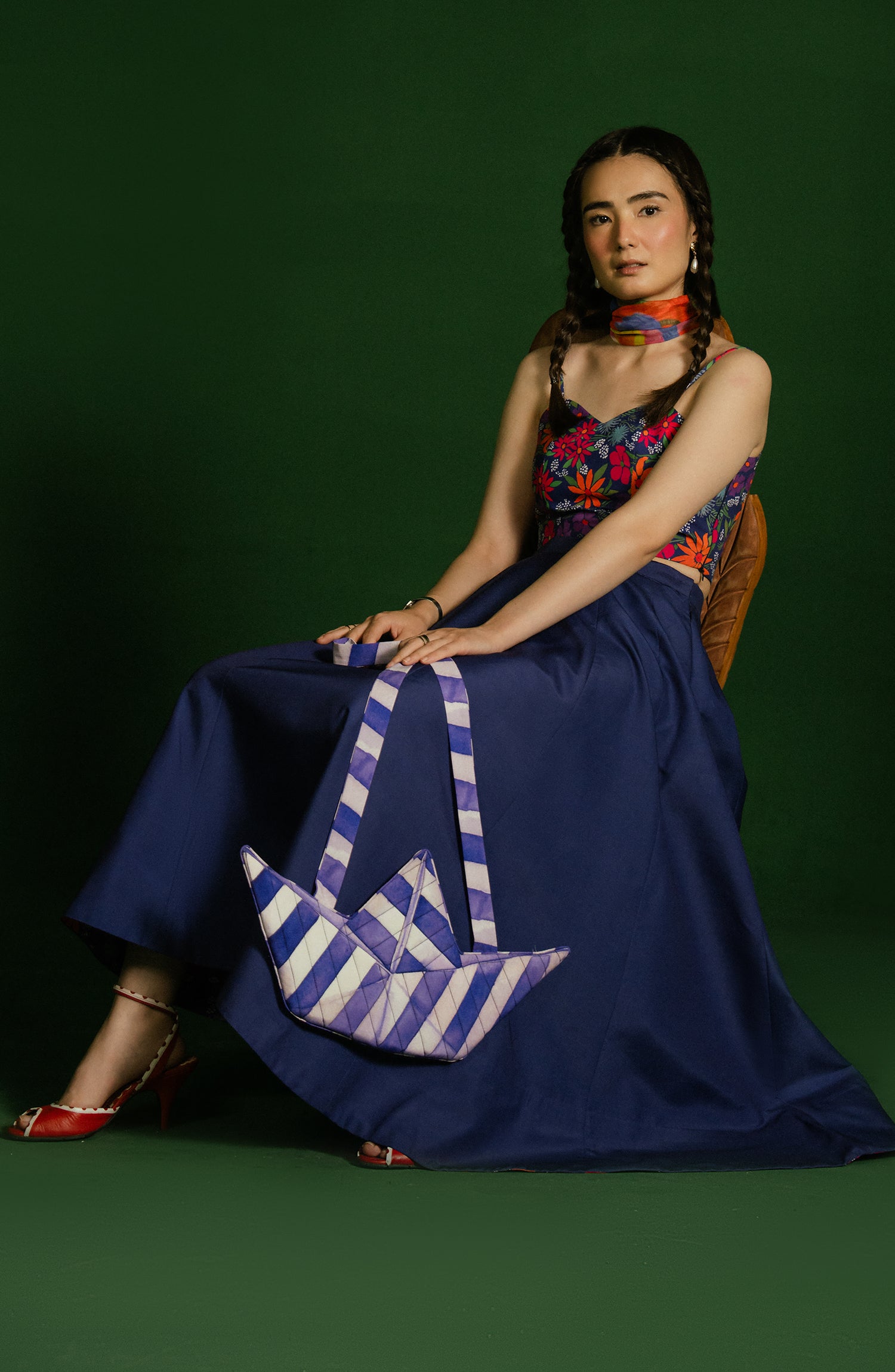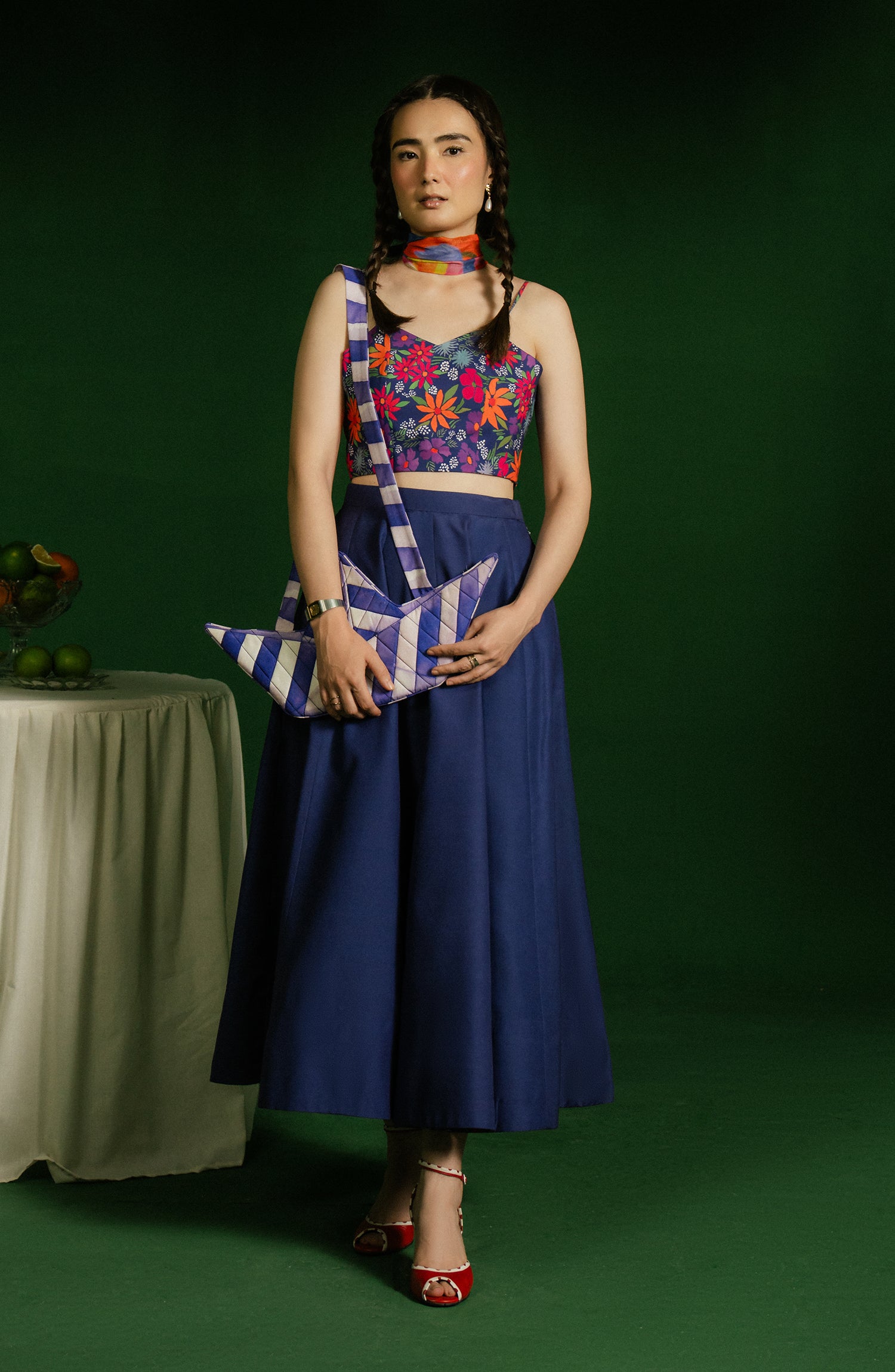 Georgette skirt can be paired with crop top adorned with exquisite floral details.