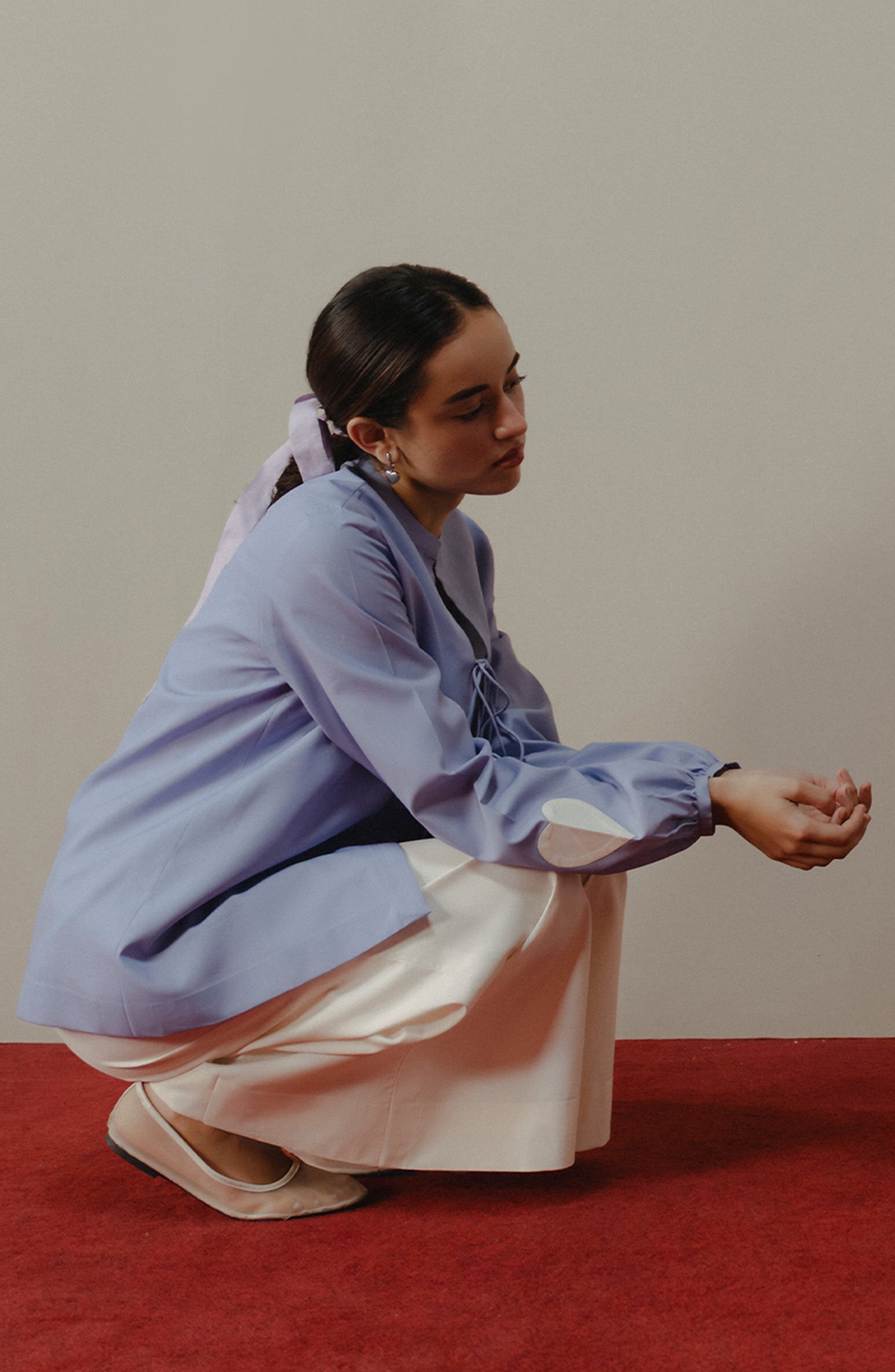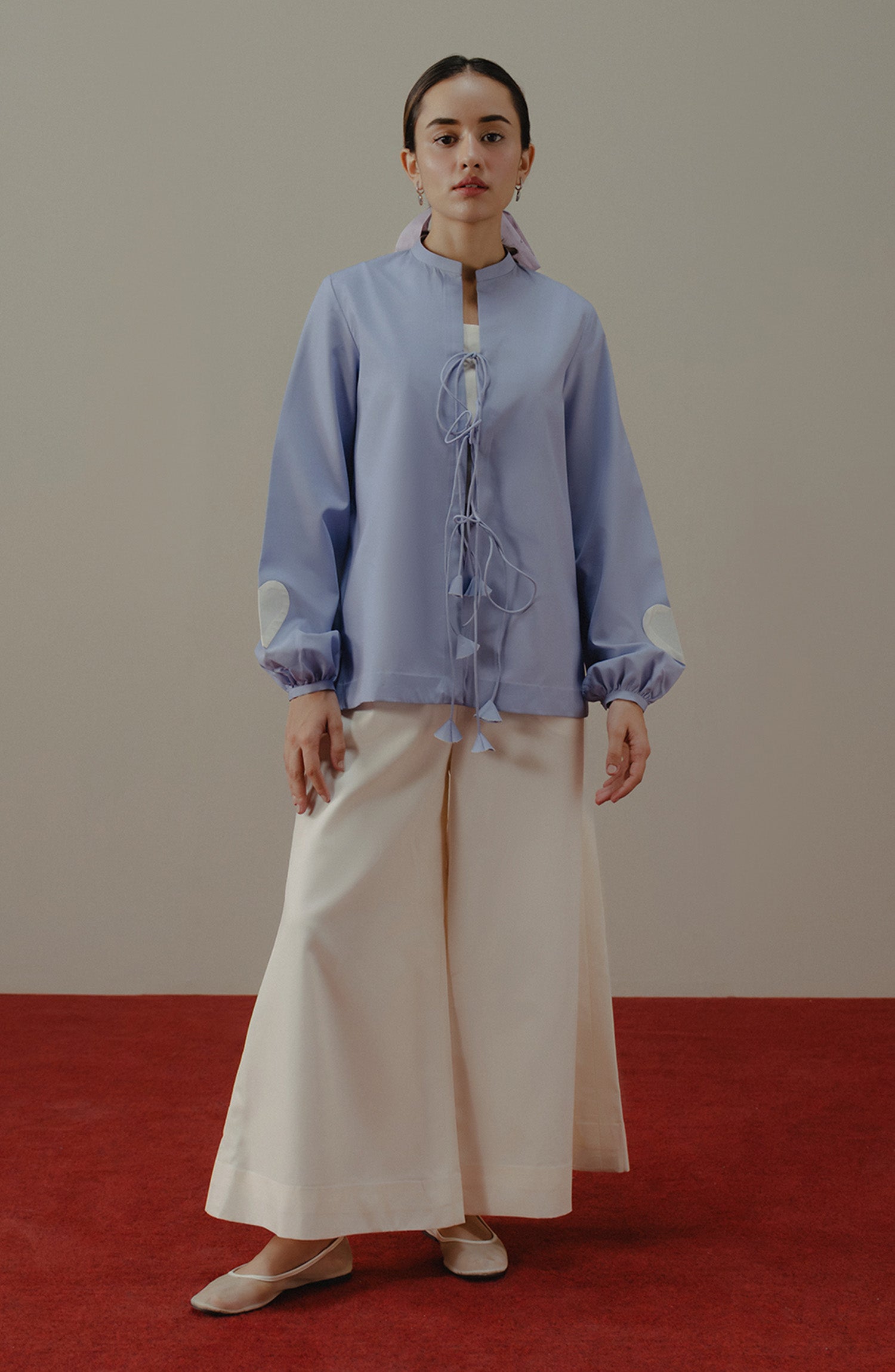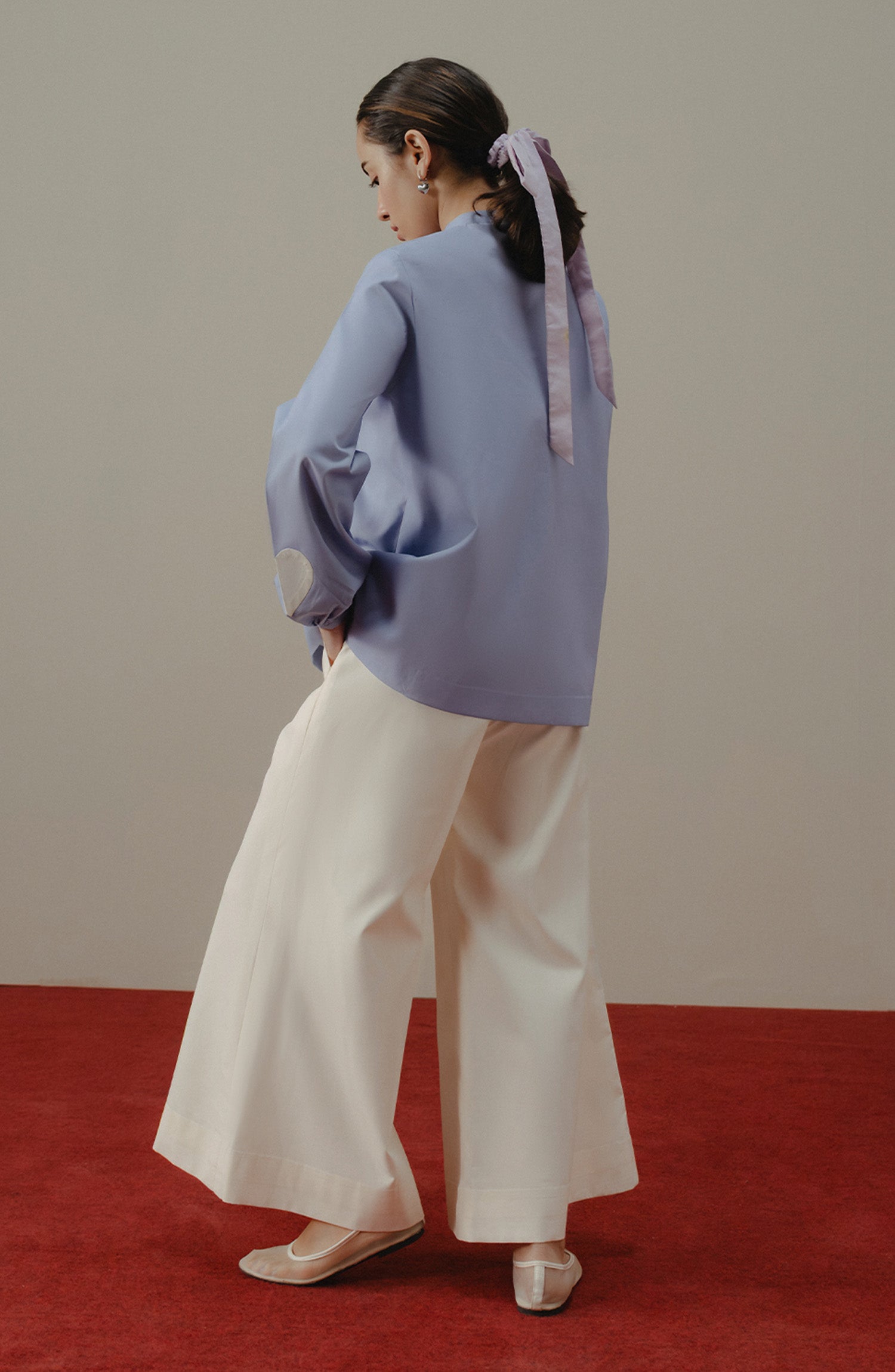 Ice Blue  georgette long-sleeved top with multiple front tie-up bows, elasticated cuffs, and white heart patches on the sleeves, paired with crisp white georgette wide-leg pants for a breezy, modern appeal.