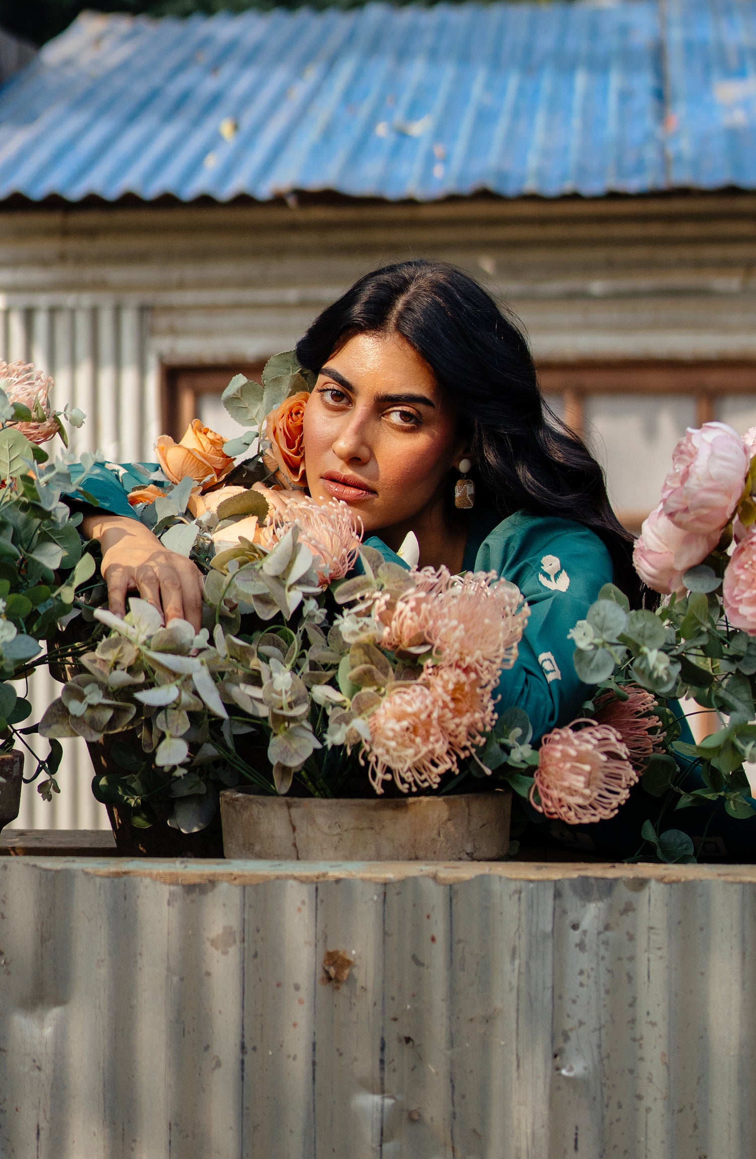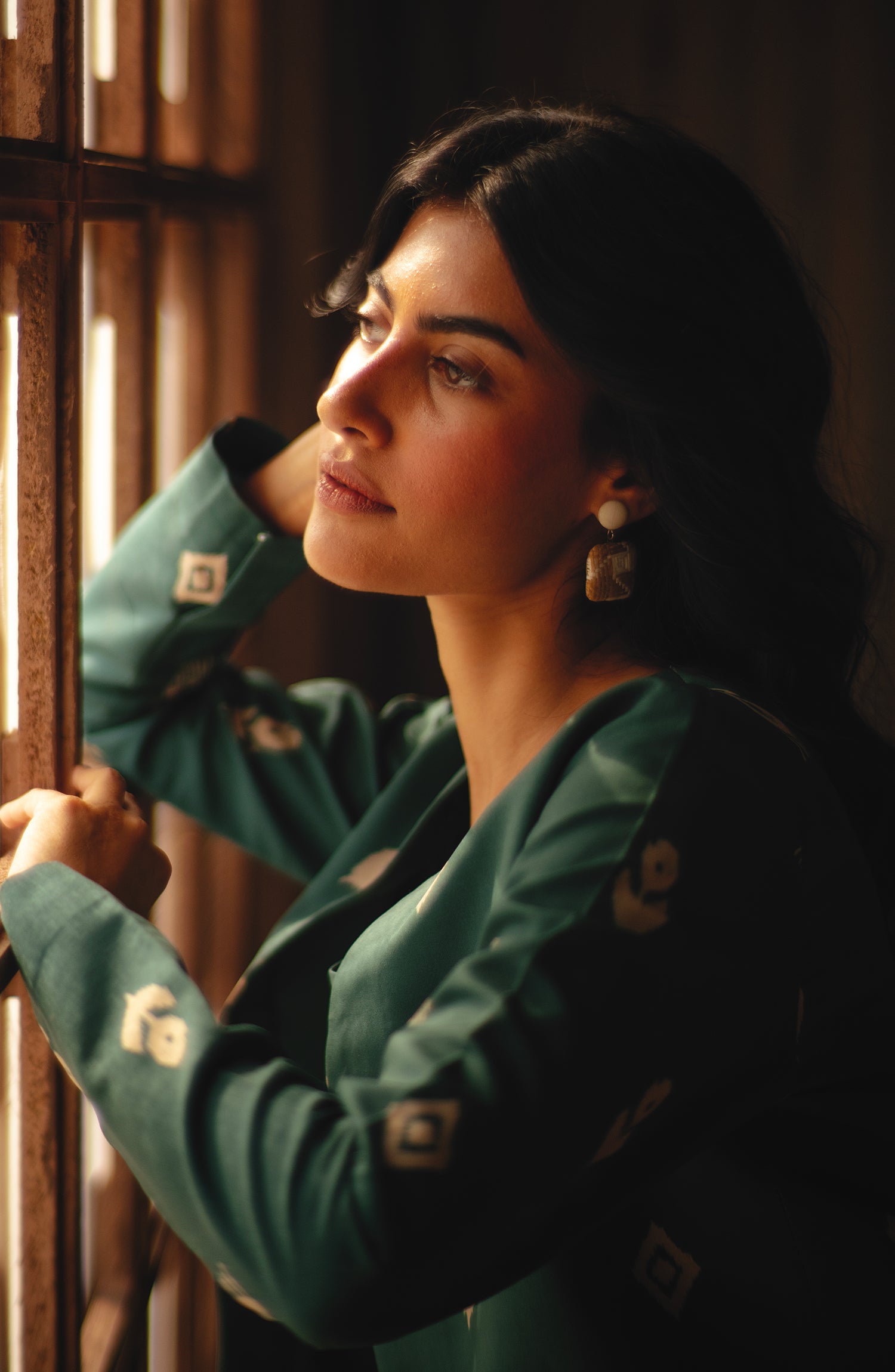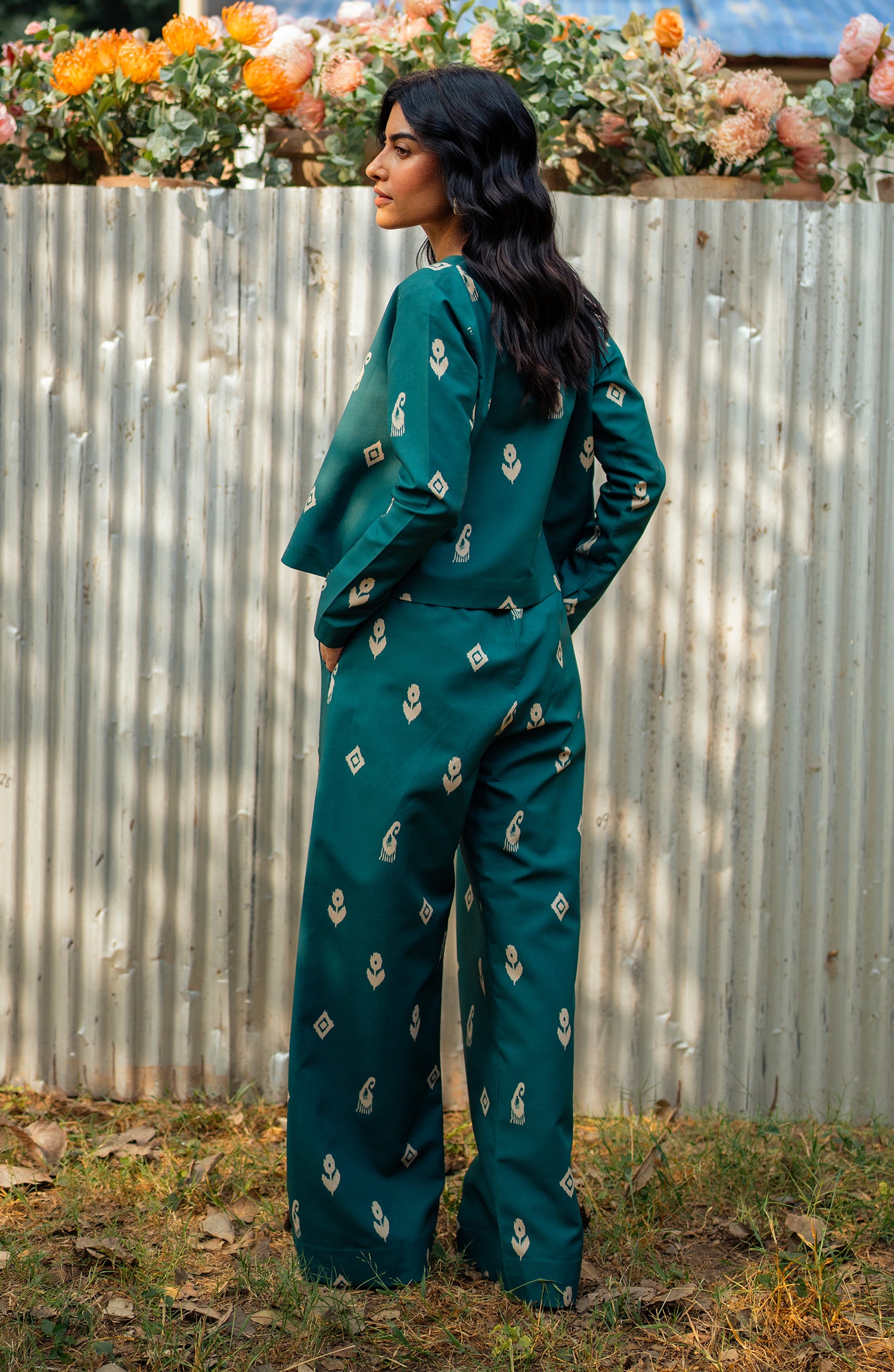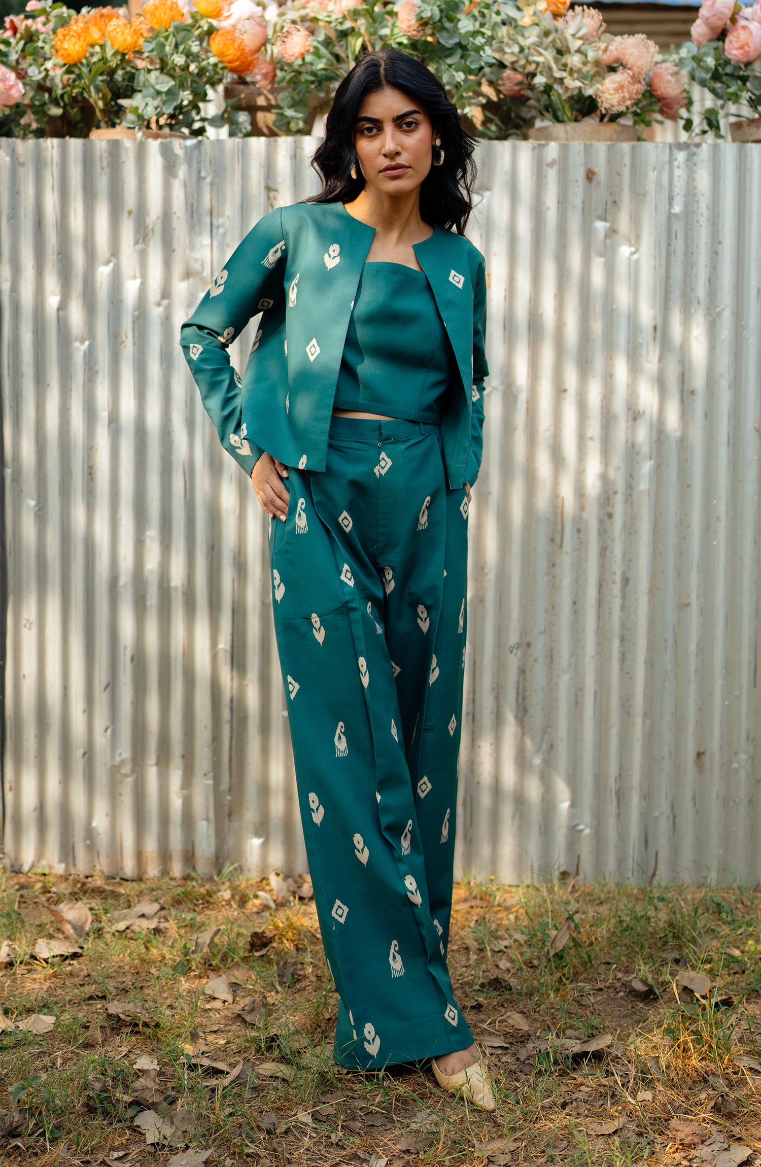 This teal green short jacket and pants combination features an effortlessly stylish design. It can be paired with a crop top.