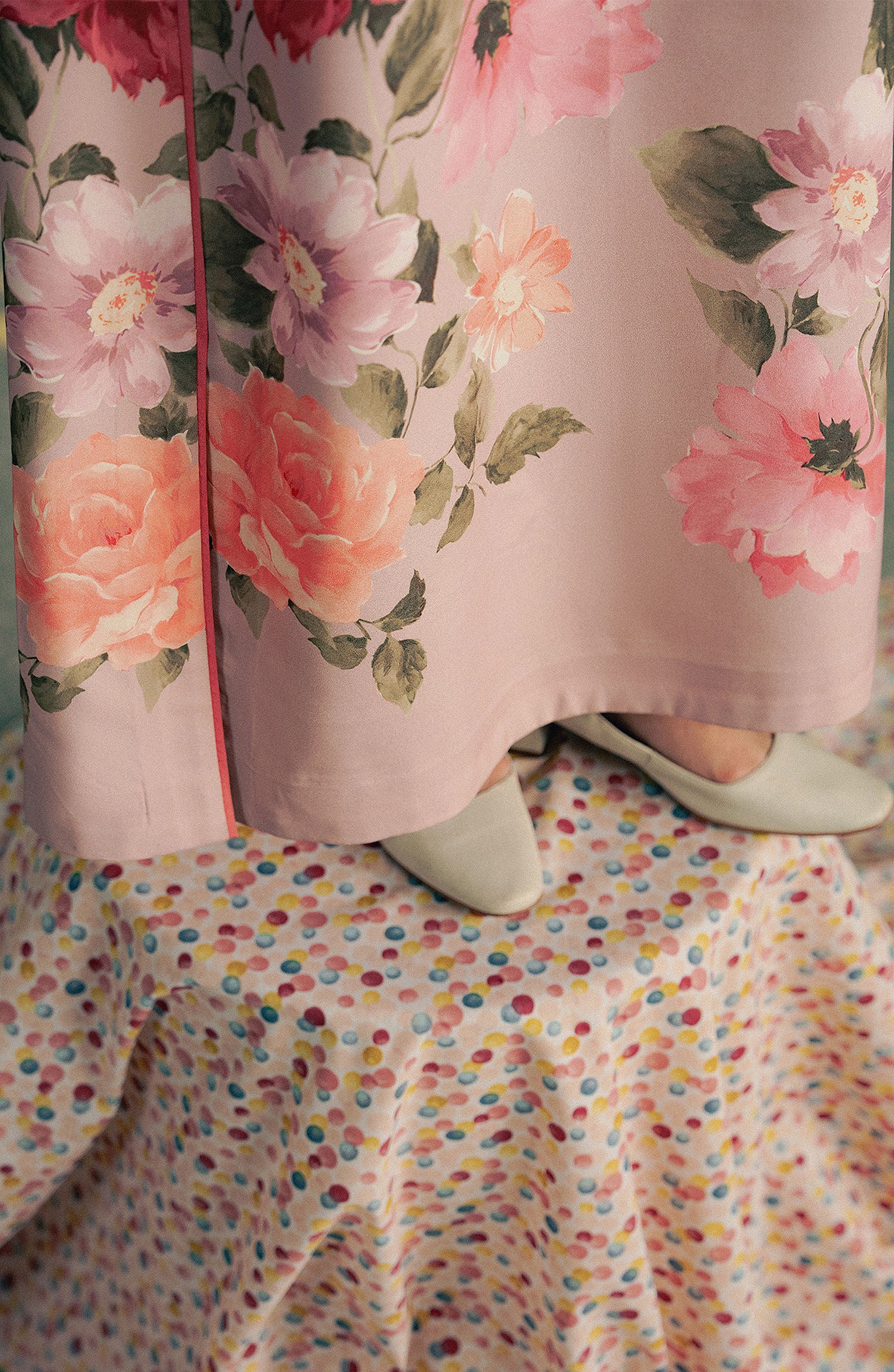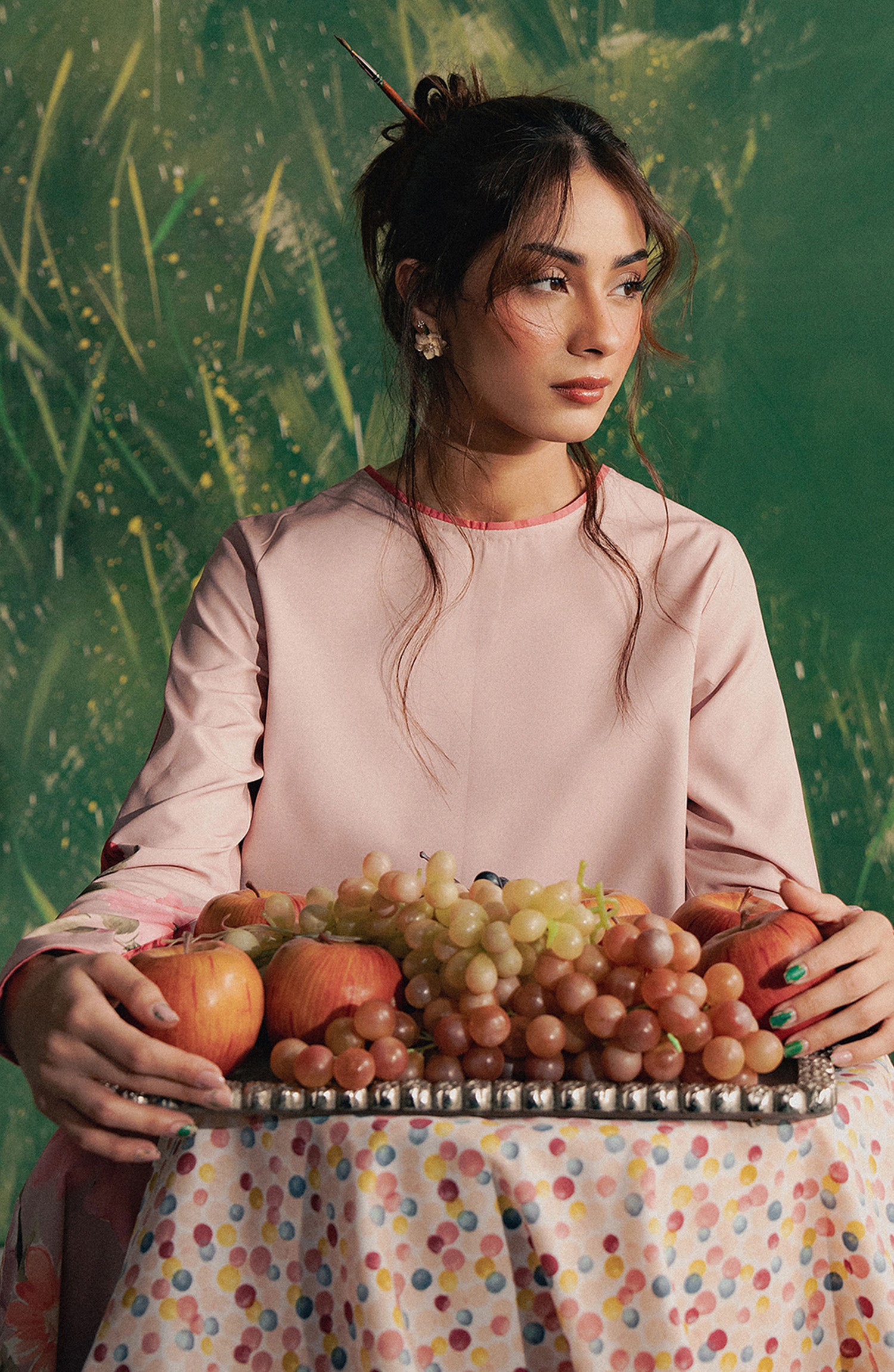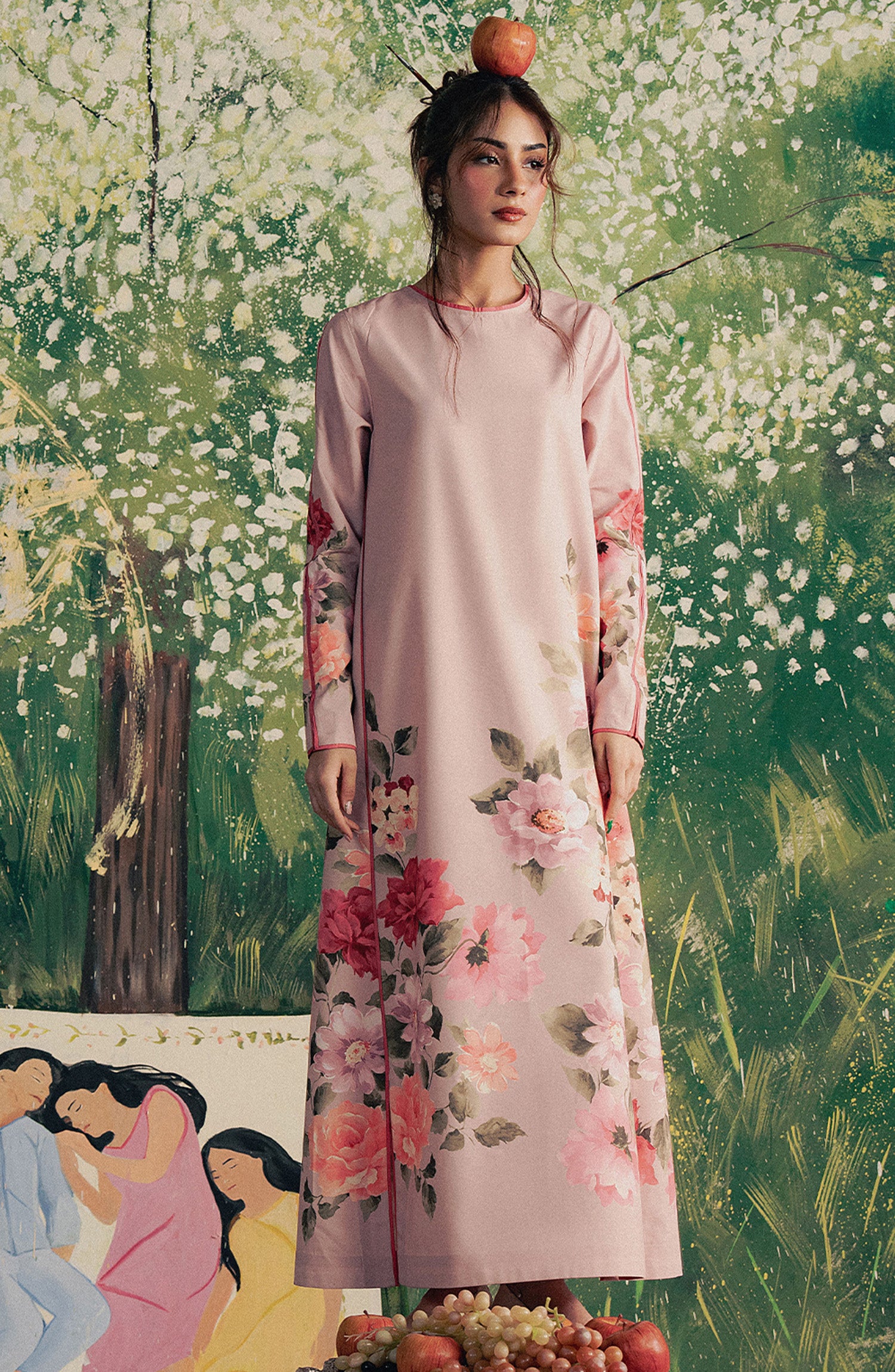 Ethereal textures A blush pink tunic brought to life with bold floral placement — elegance in every petal.