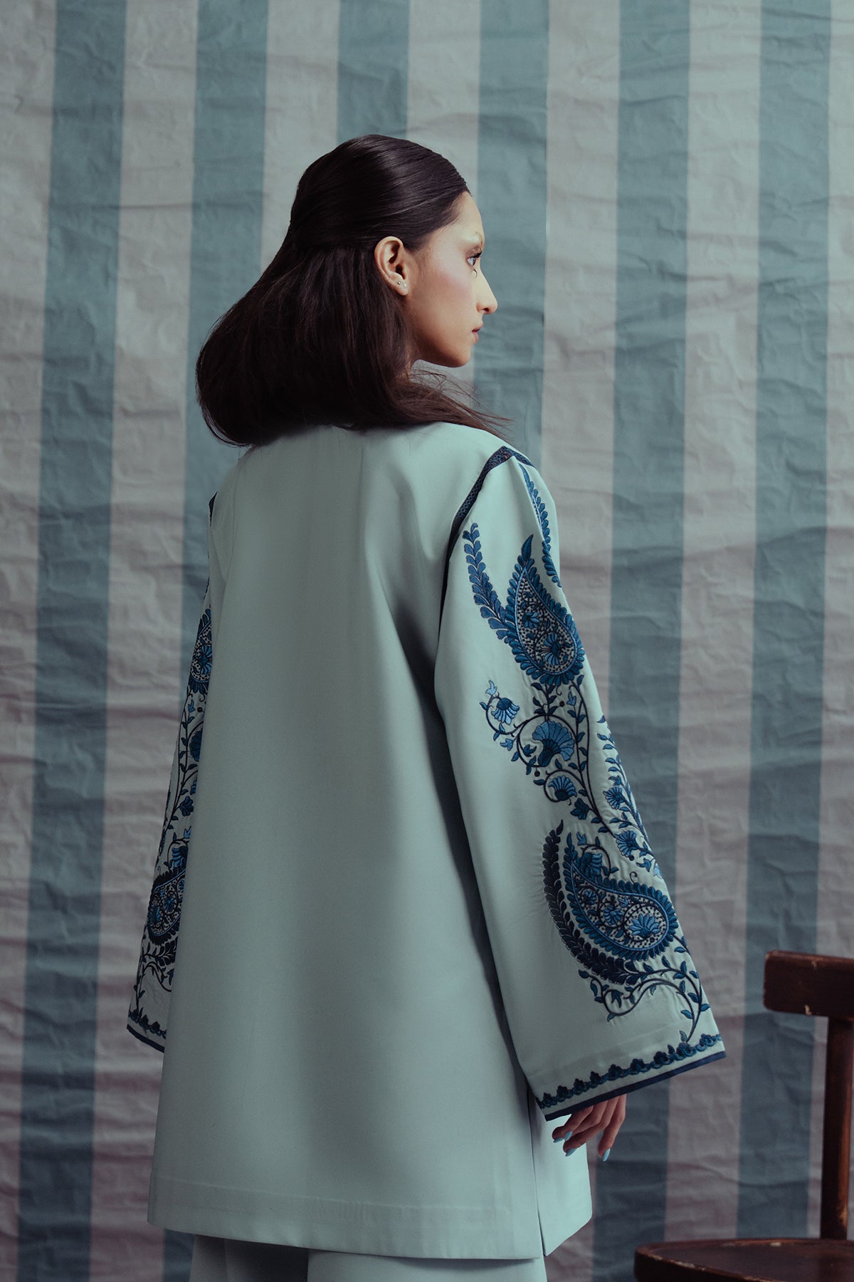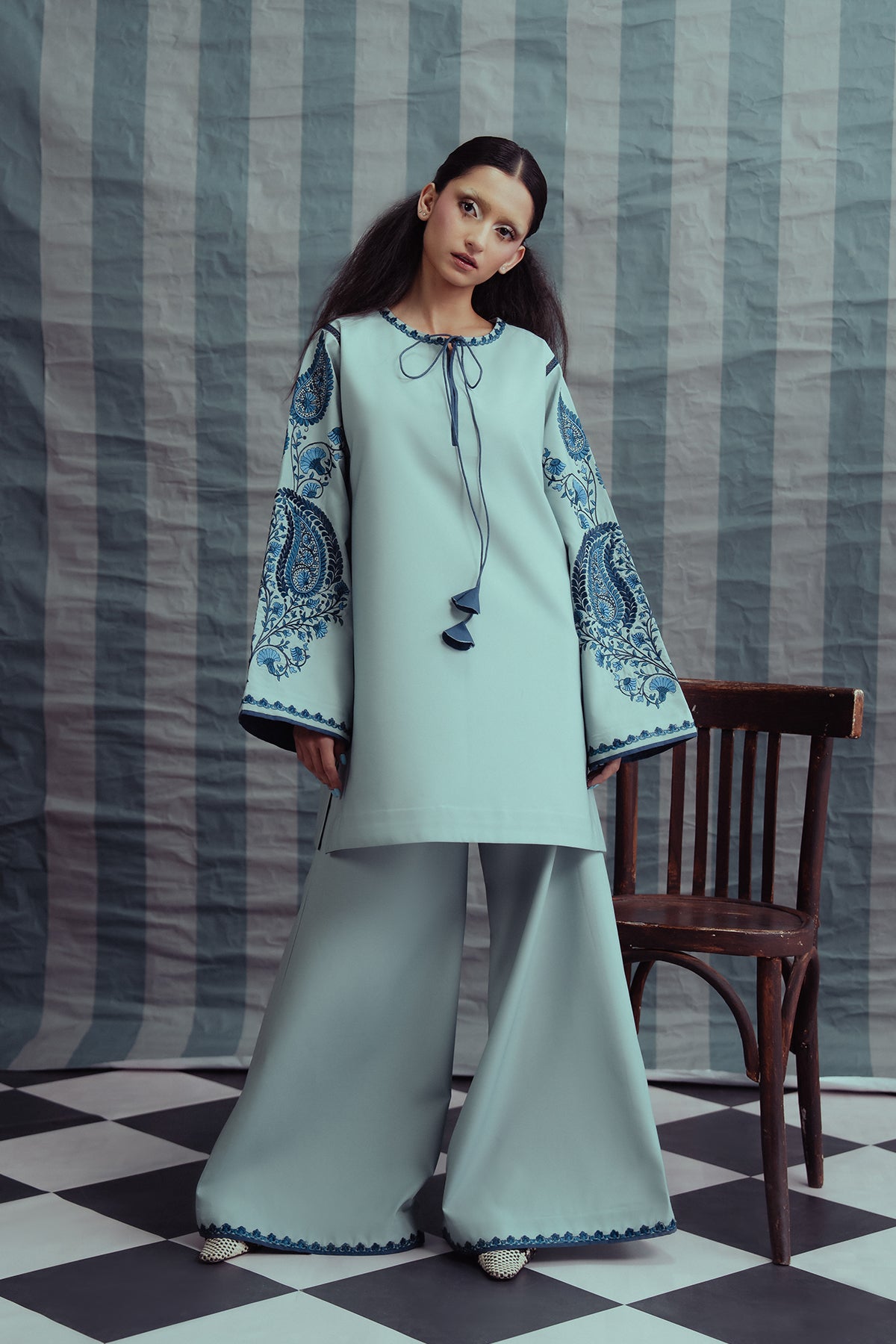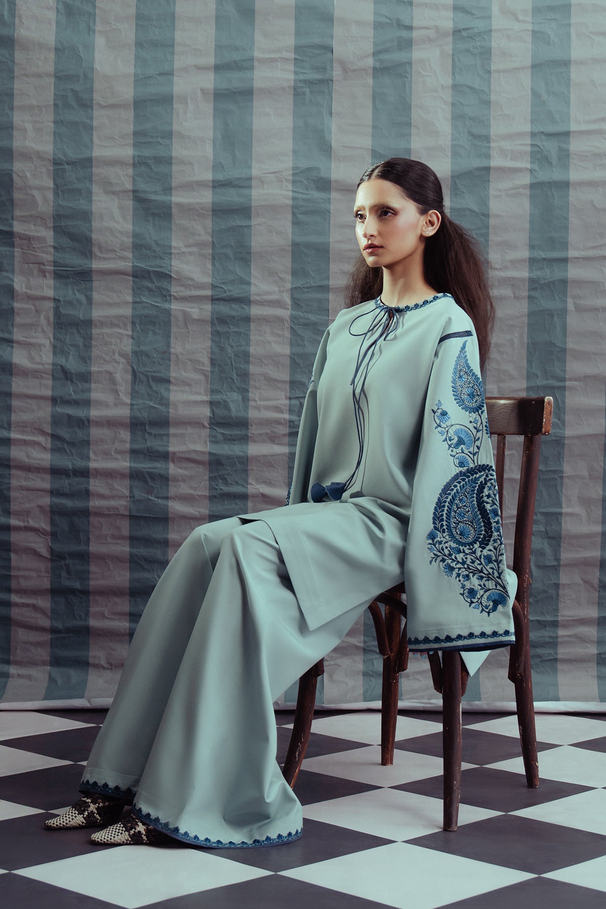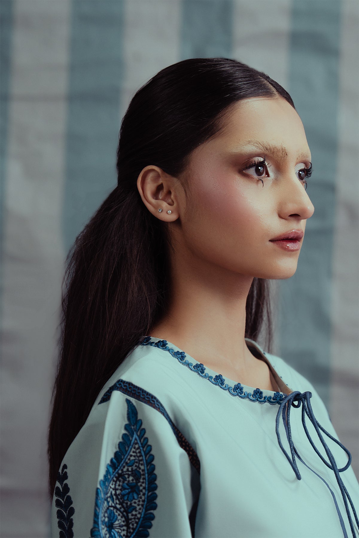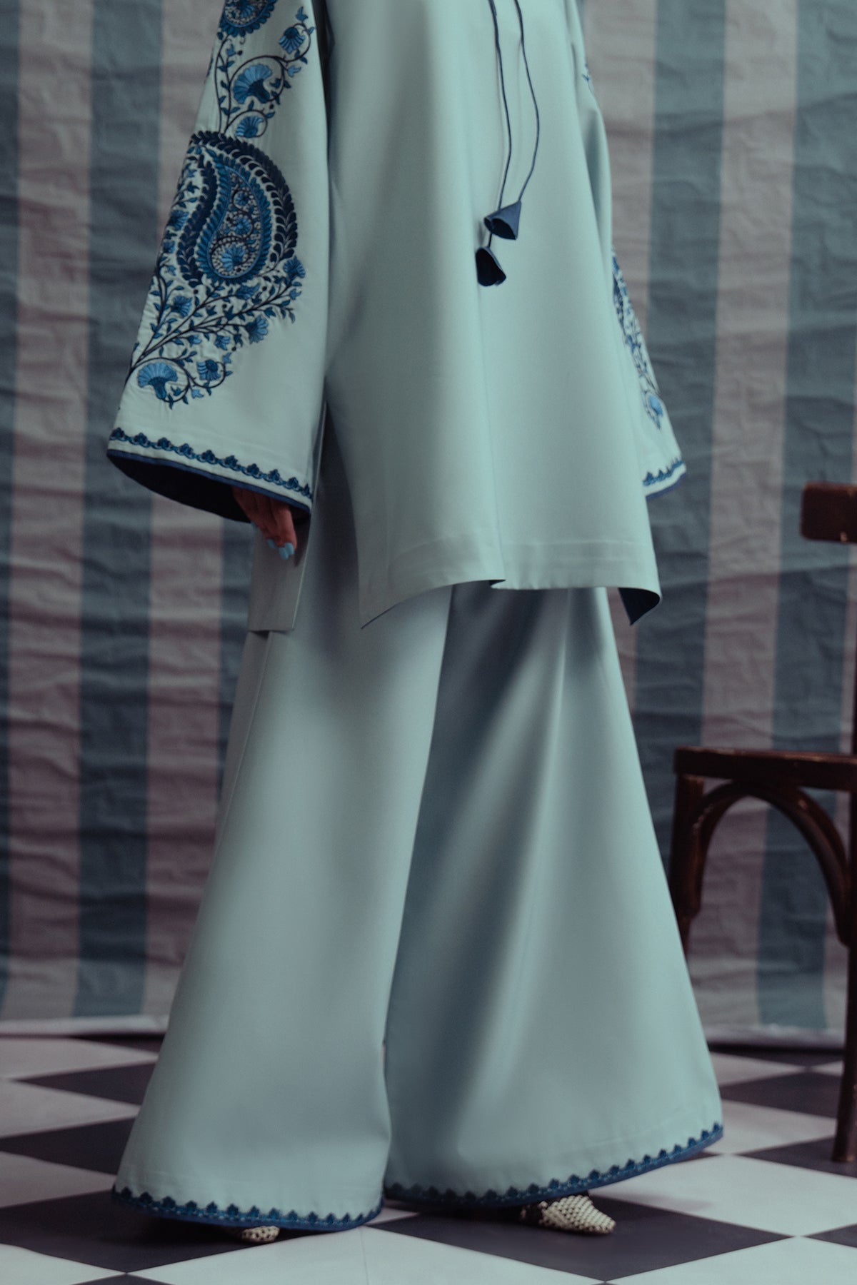A soft powder blue canvas is elevated with bold, baroque-inspired embroidery in deep cobalt on the sleeves, creating a dramatic contrast. The voluminous sleeves and wide-legged trousers lend a sculptural silhouette, while delicate tassel detailing at the neckline adds a playful and feminine touch.