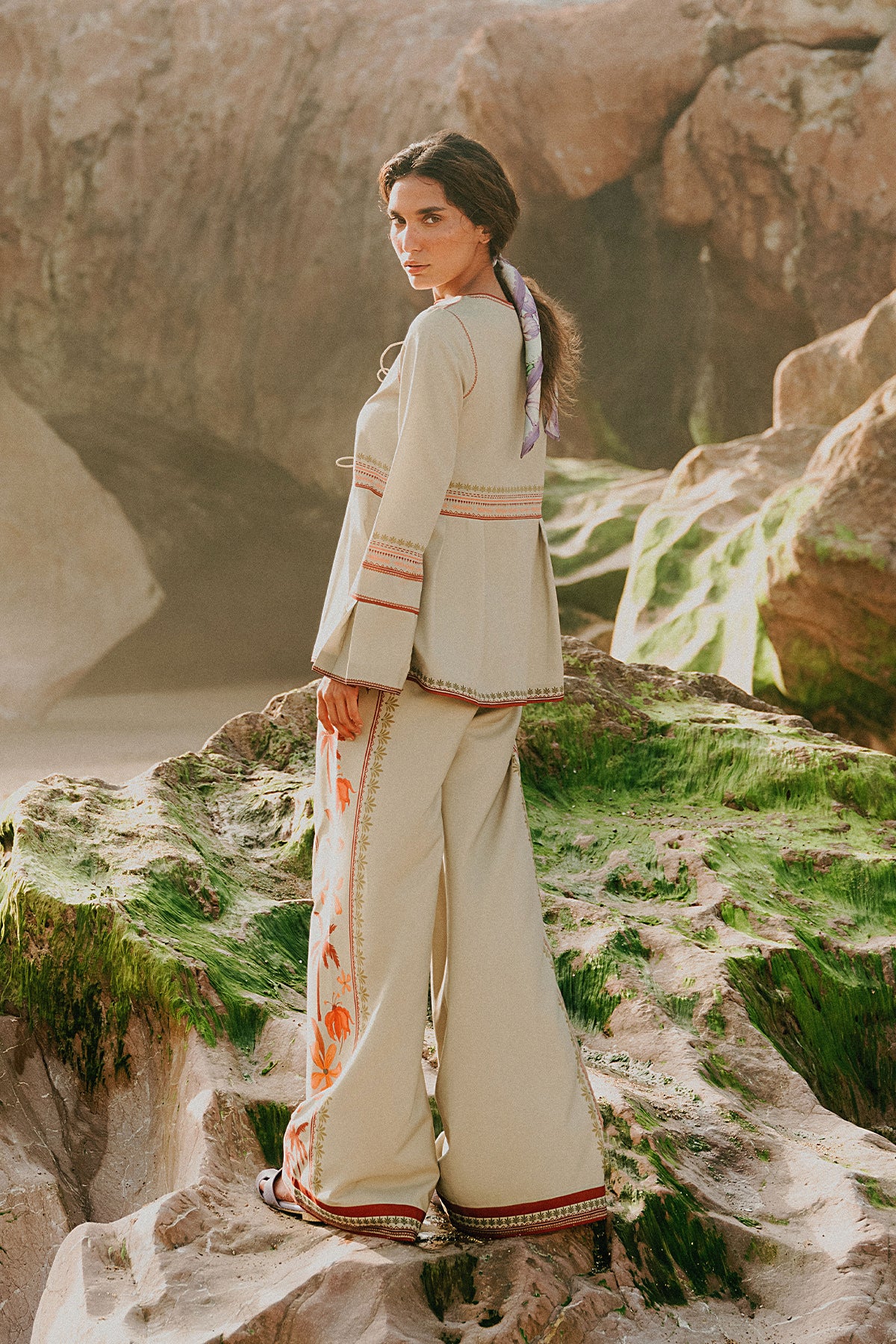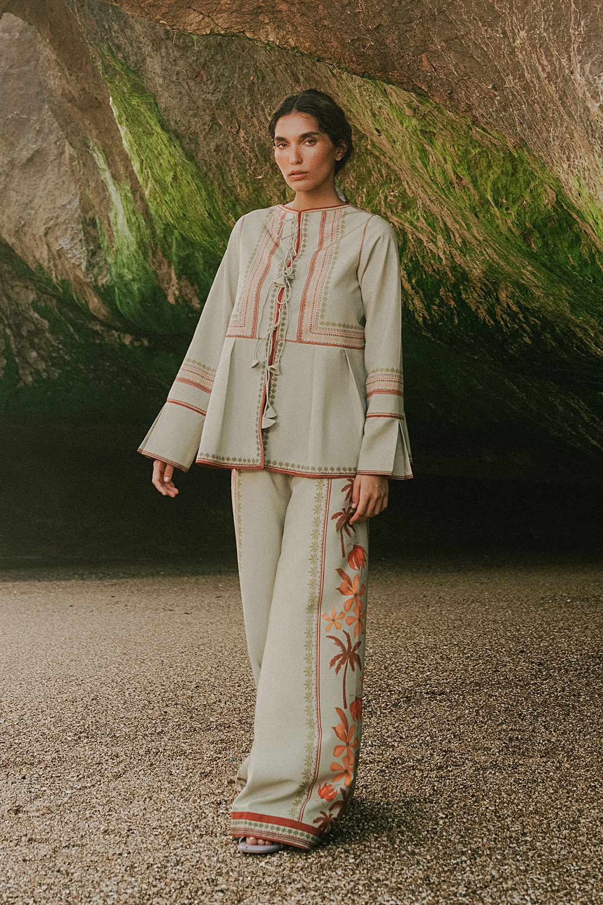 A pistachio green georgette co-ord set adorned with intricate prints and detailing.