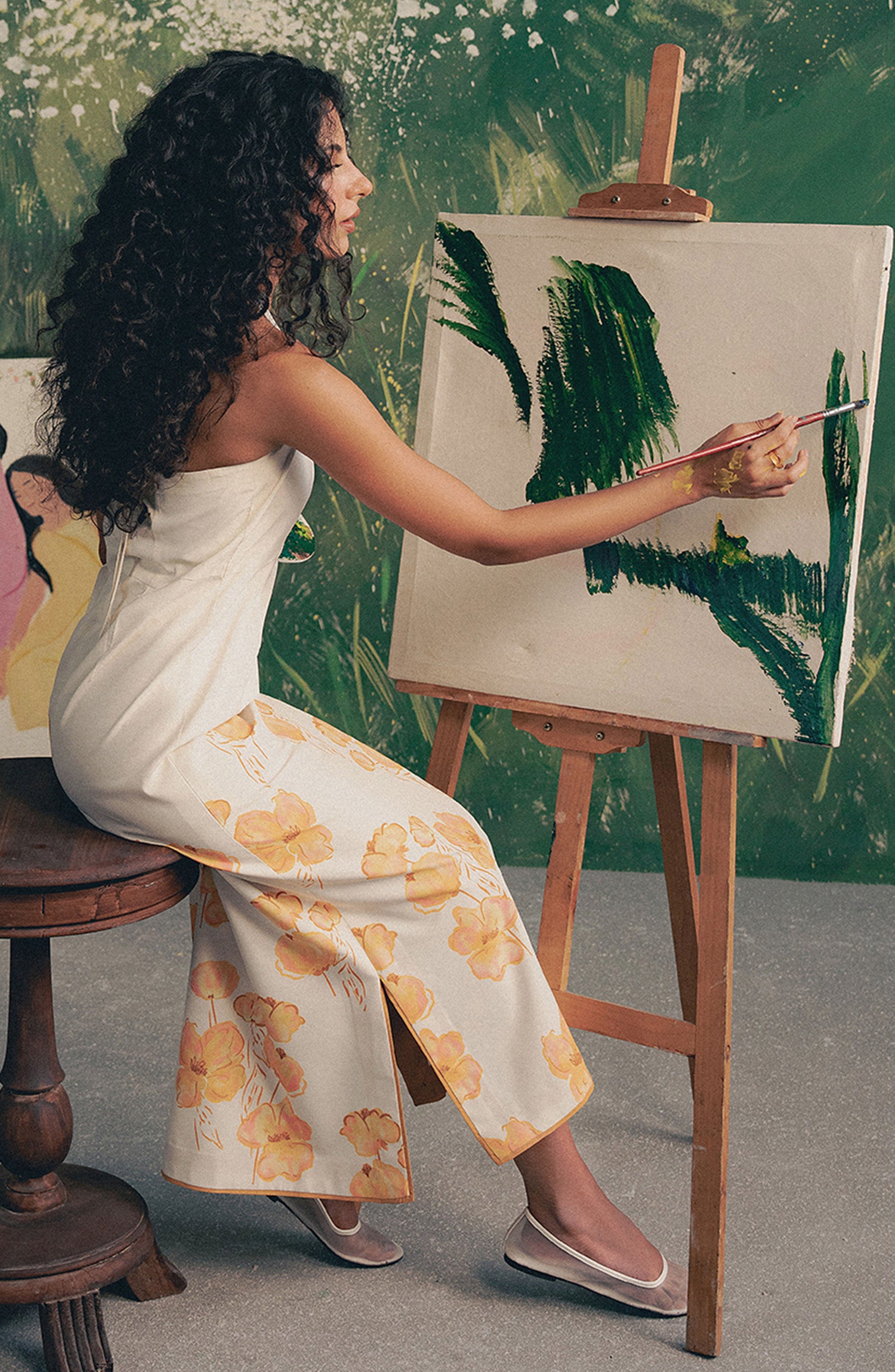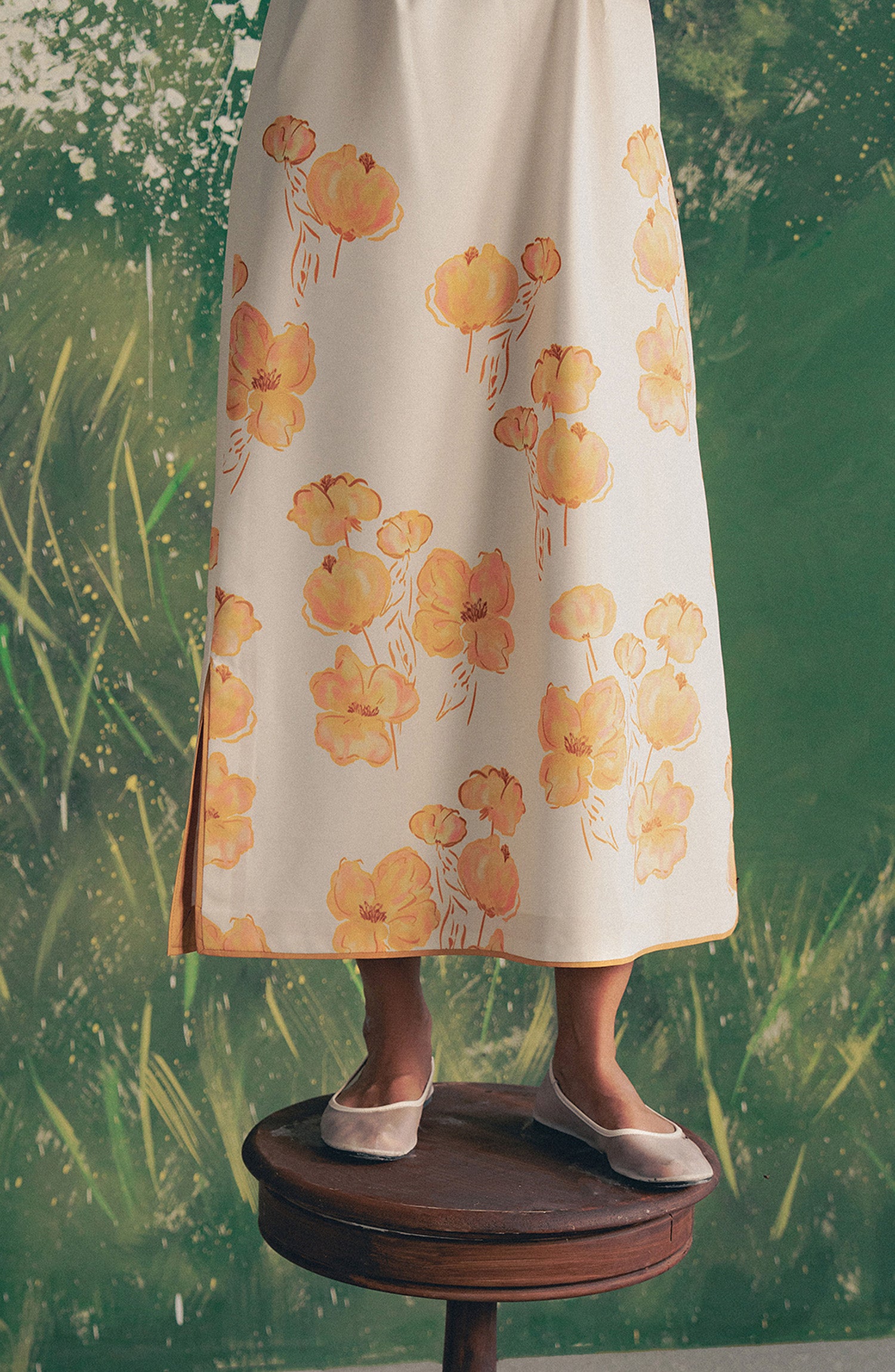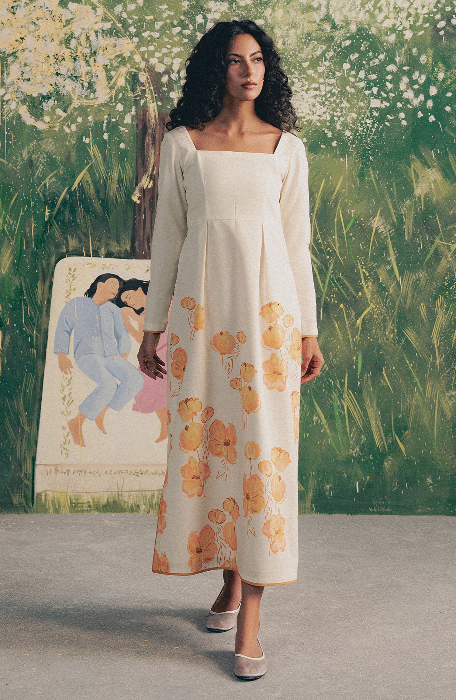 Orbiting her own power. A square-neck frock in soft ivory with sunny florals.