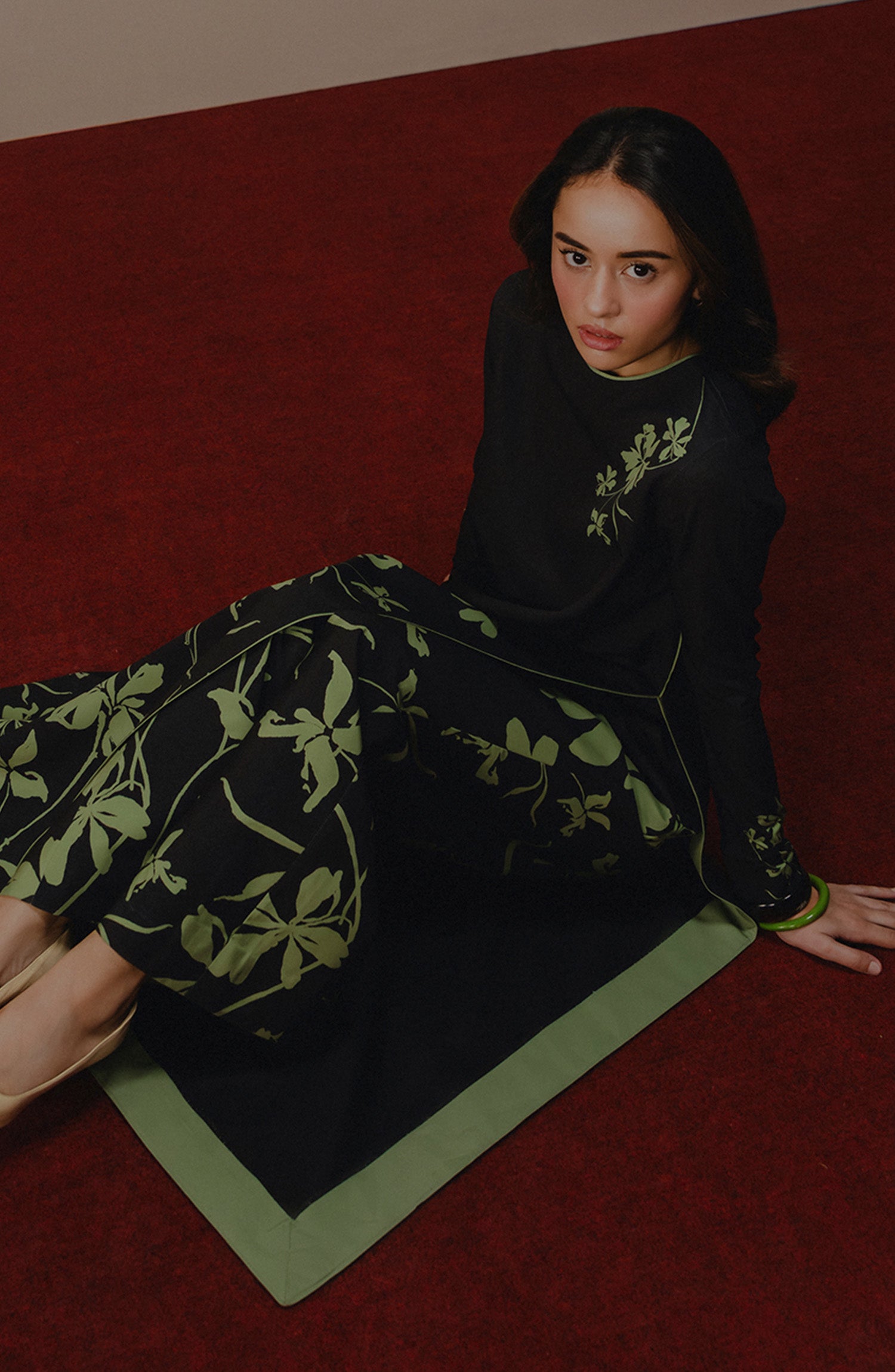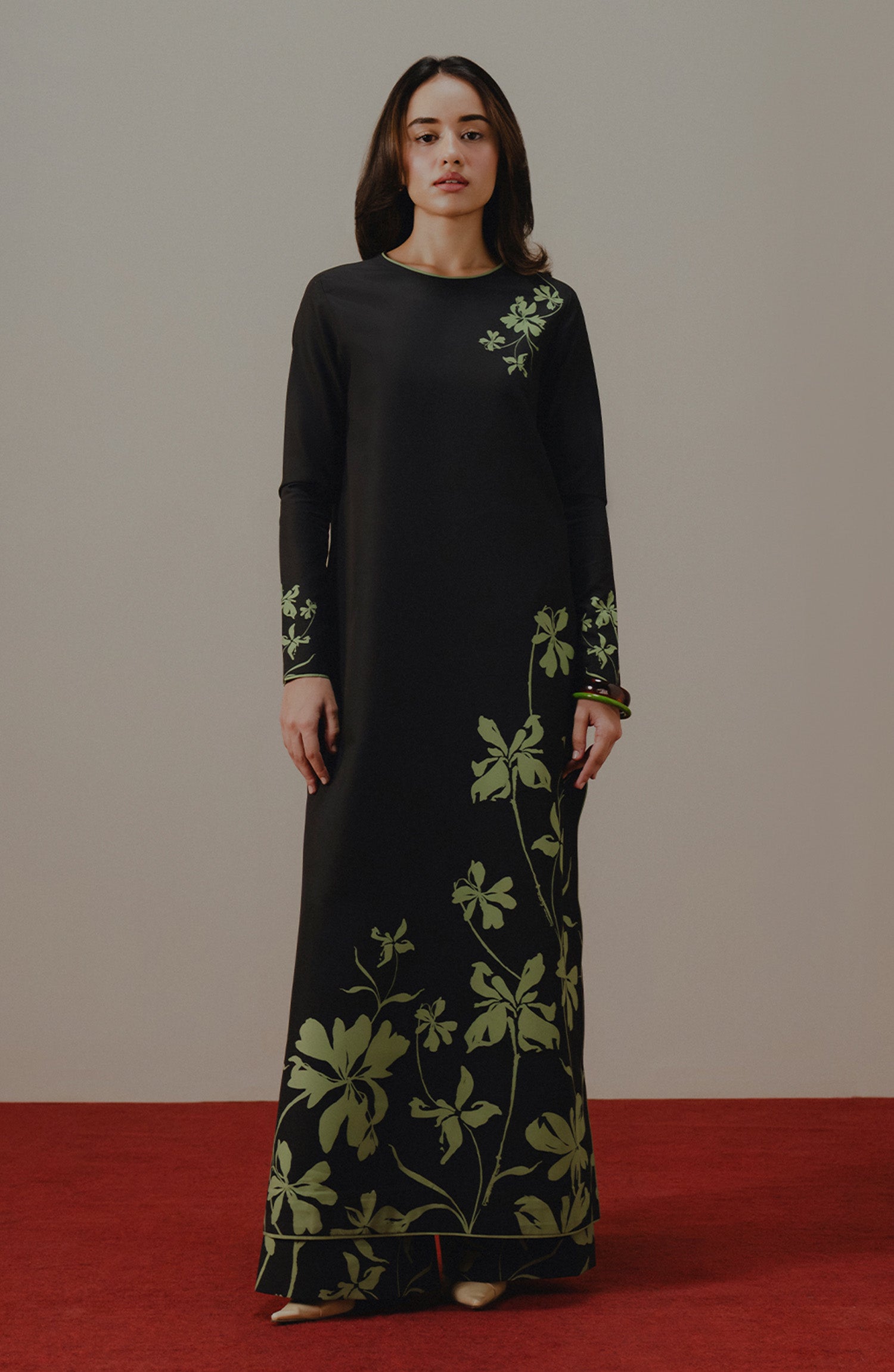 This long black dress with a straight silhouette, adorned with leafy green prints concentrated along the hem and subtly extending upward. The design creates a graceful, nature-inspired contrast