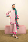 This blush-pink set blooms with bright florals along the sleeves, hem, and neckline—each stitch a springtime flourish. Paired with embroidered trousers and aqua green dupatta in garden tones, the look stays soft, tonal, and delicately balanced.