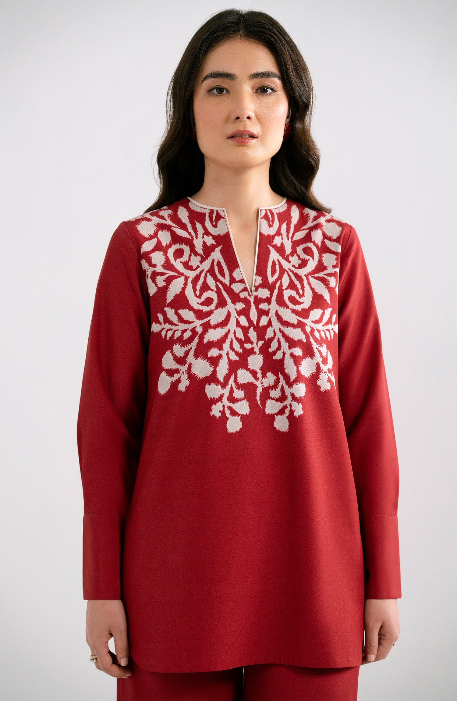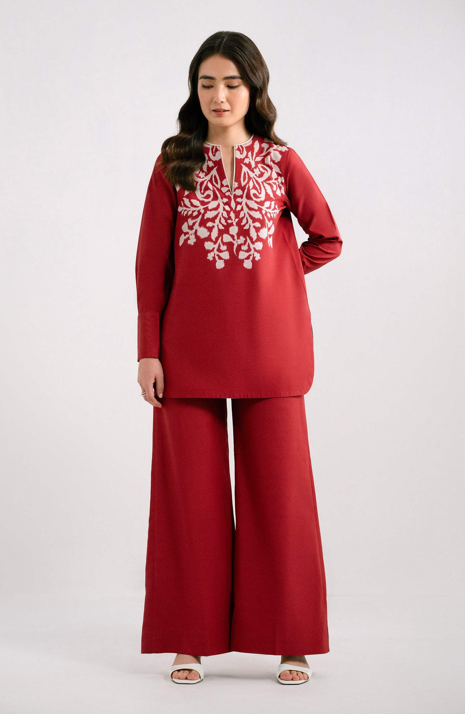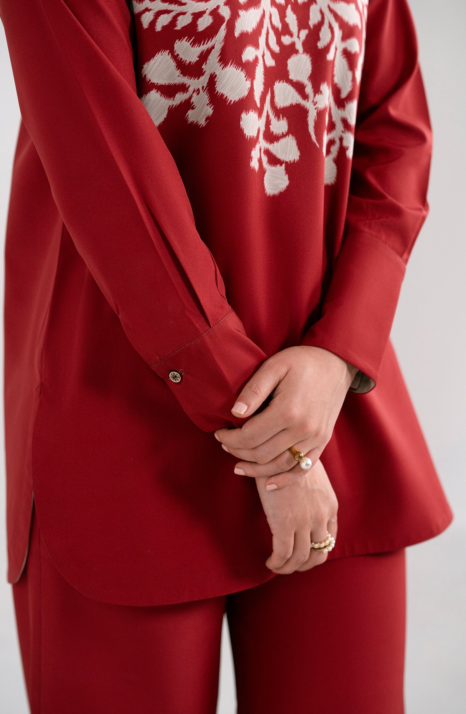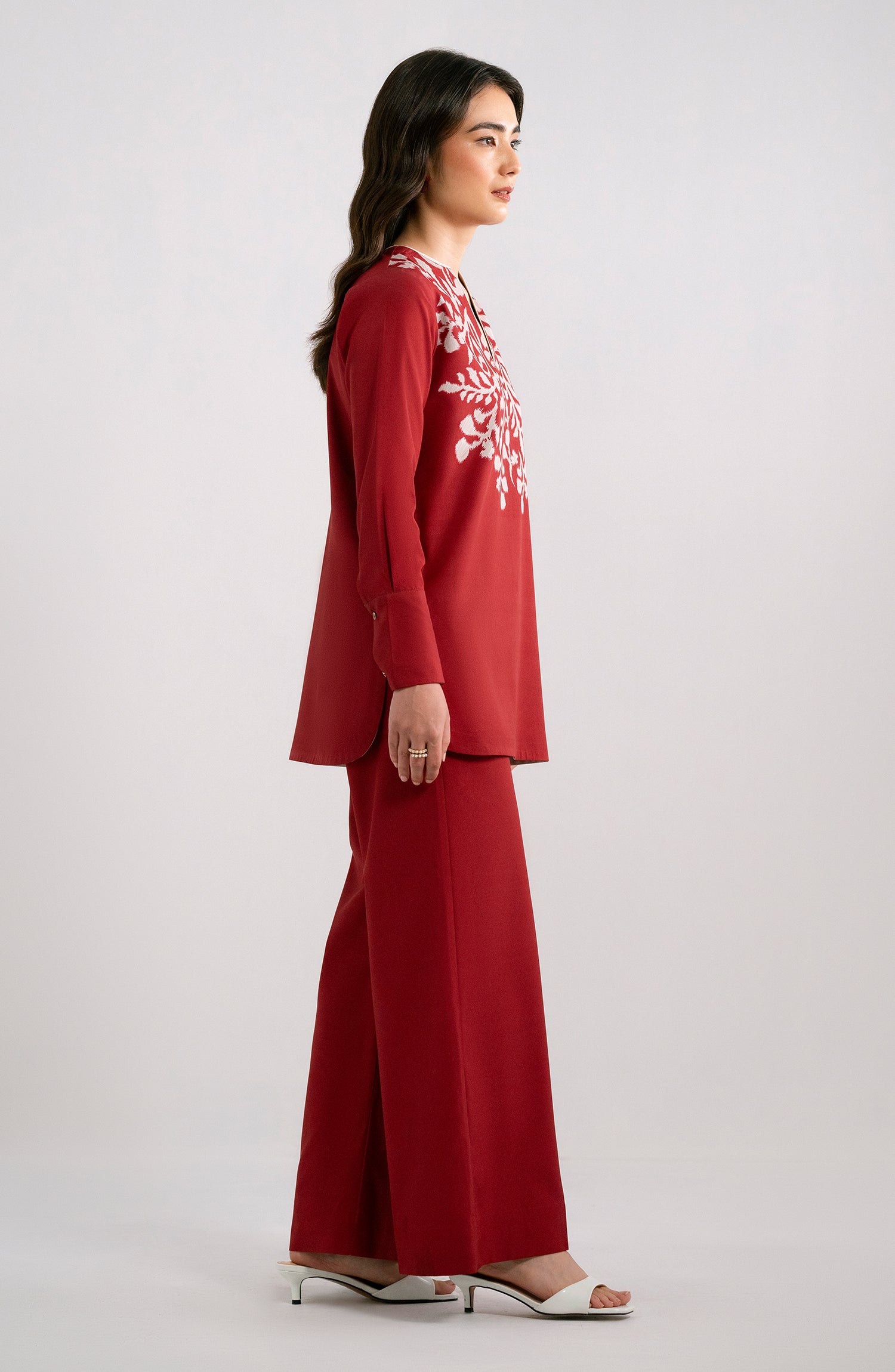 Drenched in crimson, this cord set features cuffed sleeves and striking binding details