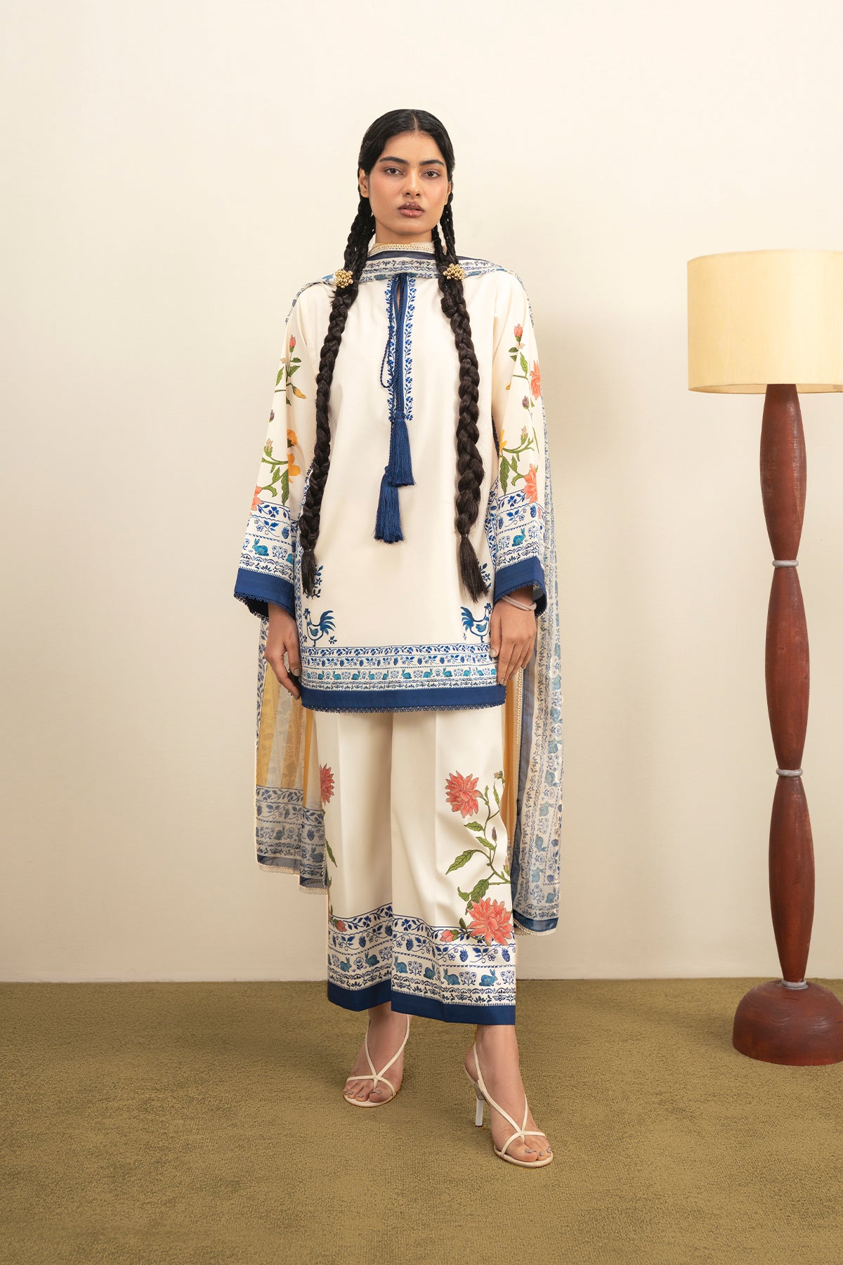 This cream-toned set unfolds in soft symmetry, where blue embroidery and floral bursts bloom along the hem and sleeves. The matching dupatta drapes in painterly rhythm, echoing the palette’s garden hues—refined, tonal, and quietly radiant.
