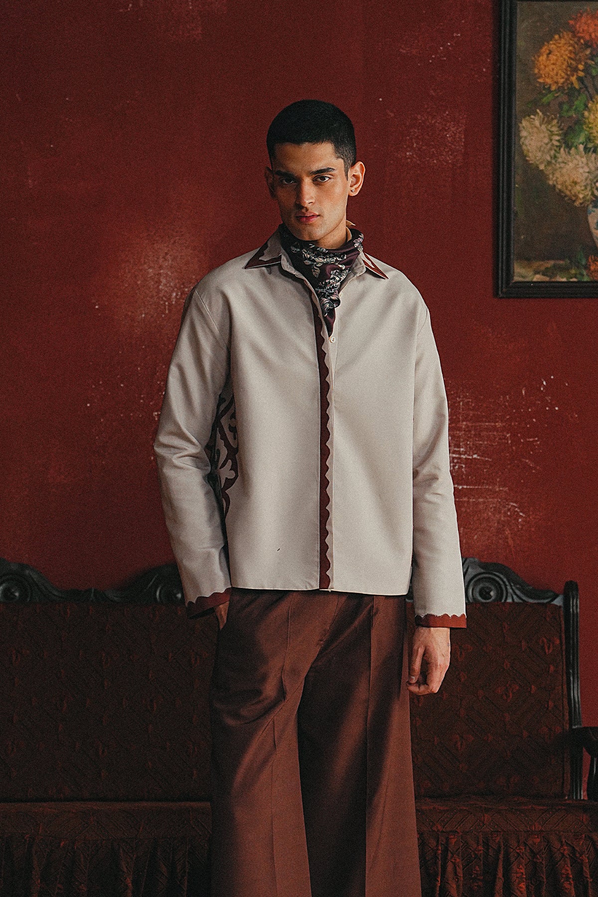 A soft winter shacket with sculpted maroon motifs tracing the sides — minimal in form, artful in detail.