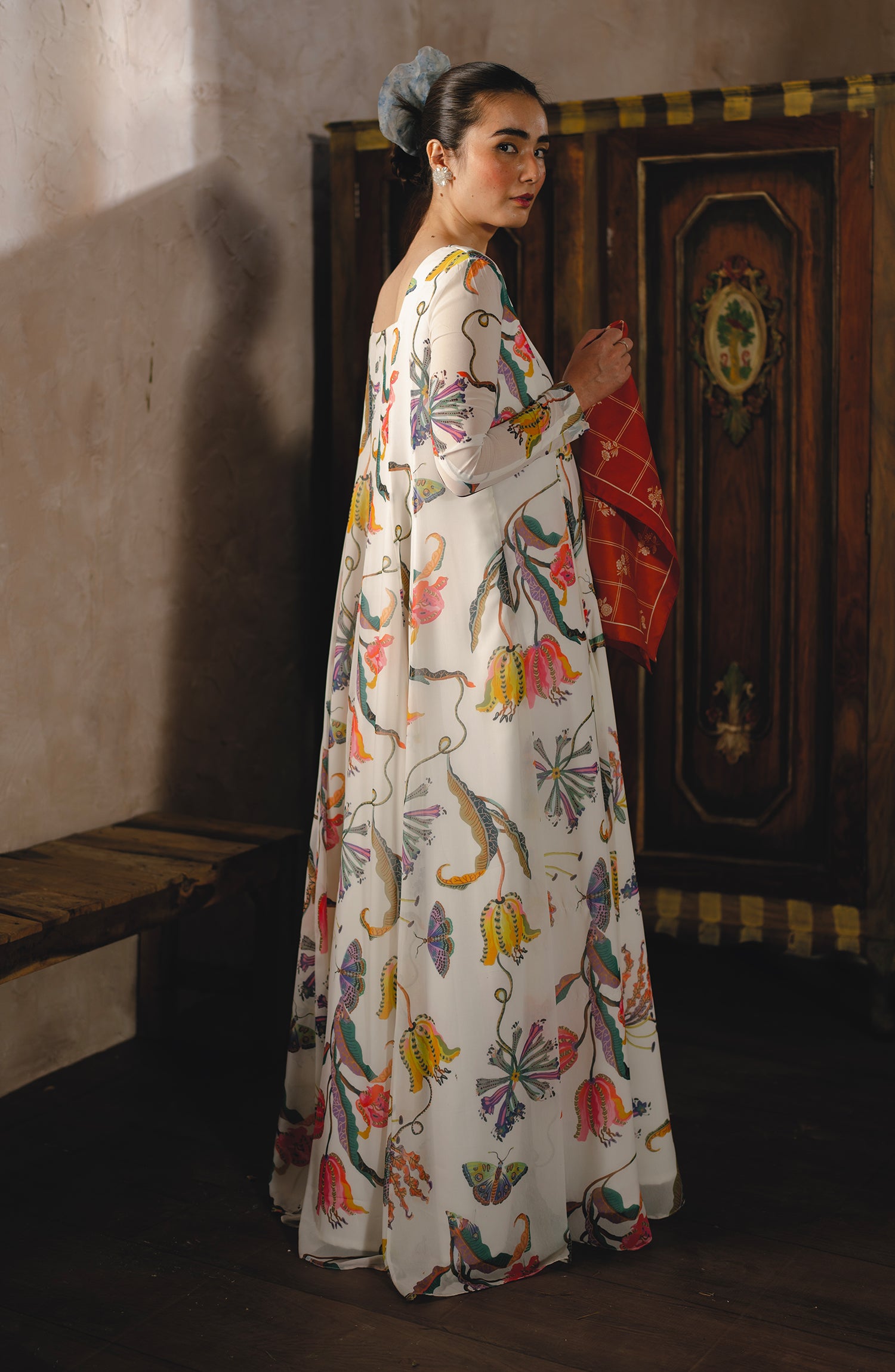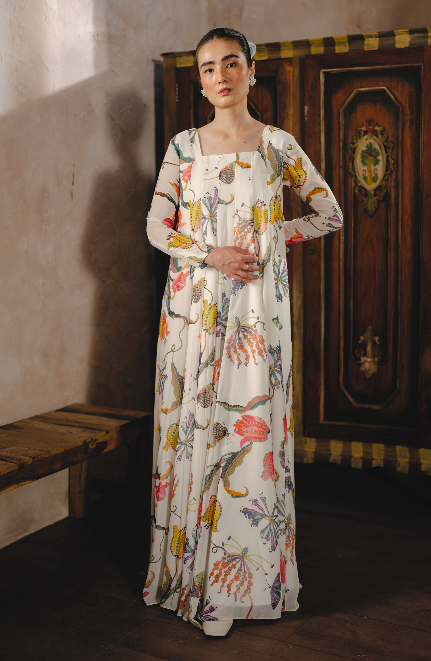 Vibrance reimagined in a chiffon flared long dress, where elegance meets movement.