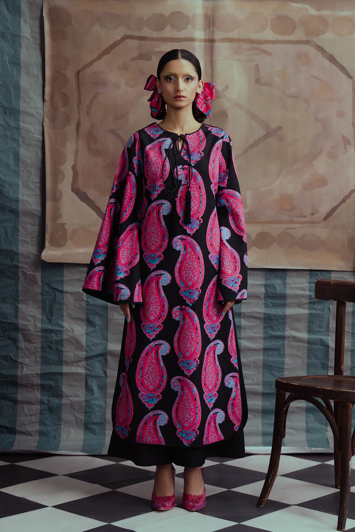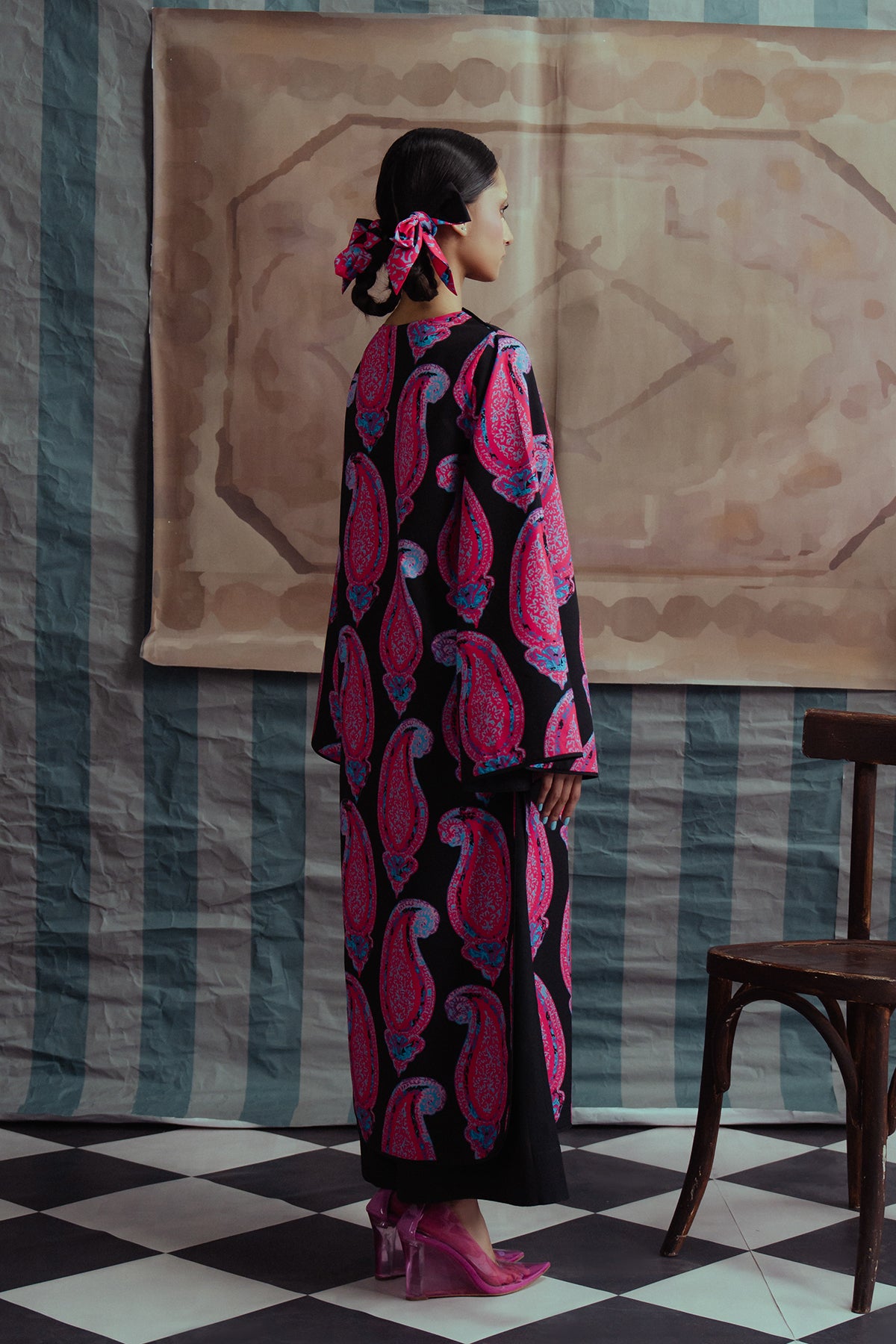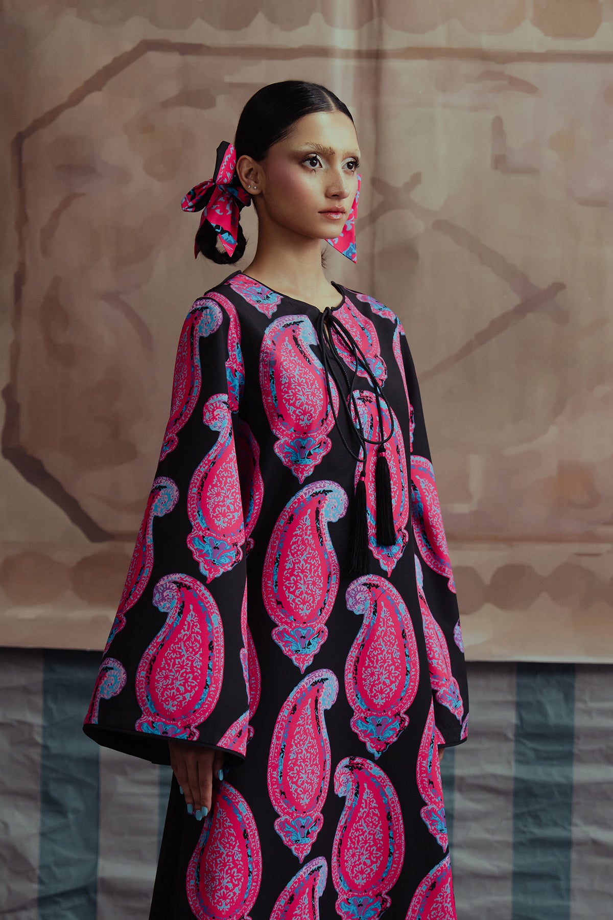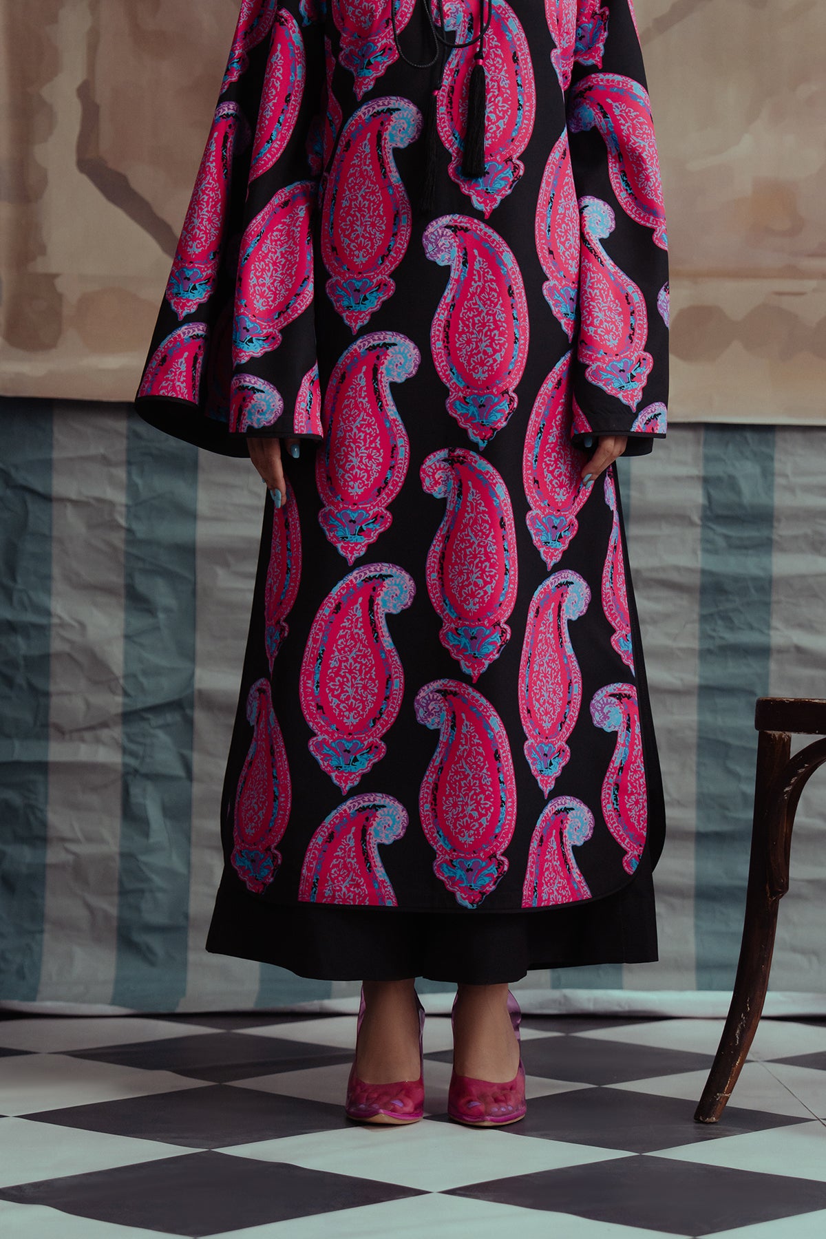 From classic black to colorful finesse , this completes the story. Black long shirt adorned with intricate paisley prints. The rich detailing adds a splash of color and finesse to the timeless elegance of black, making it a standout piece for both everyday grace and special occasions.