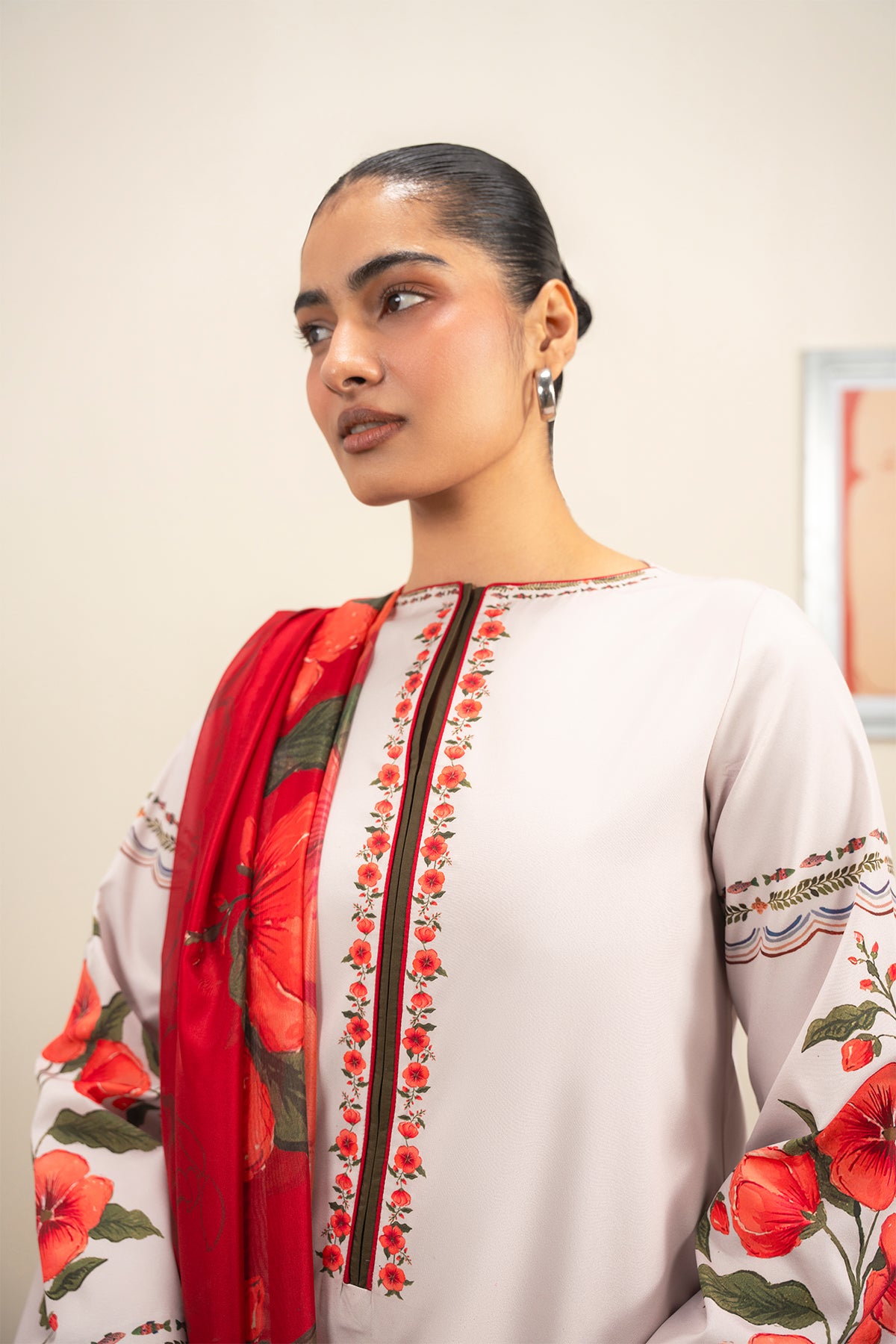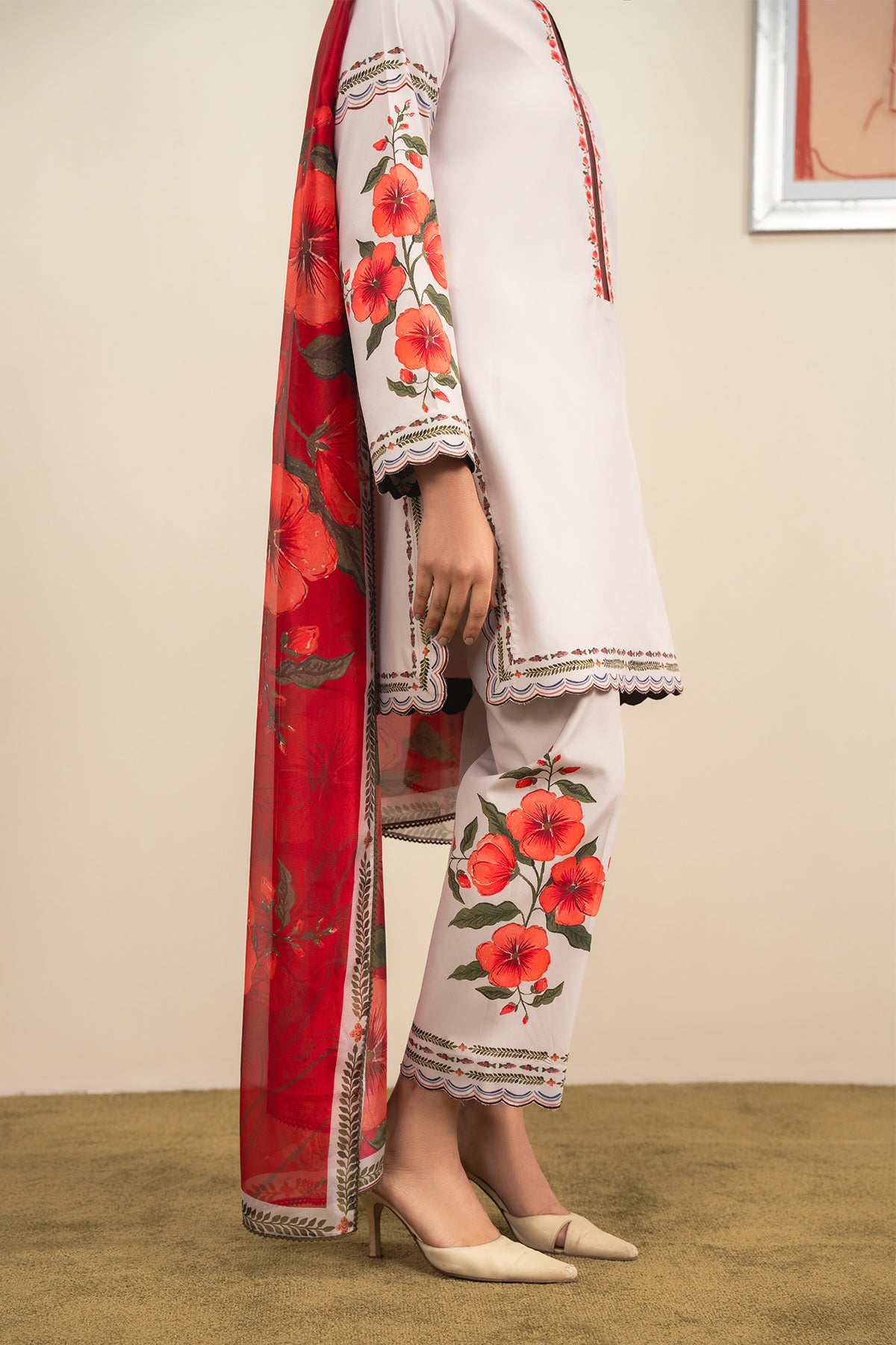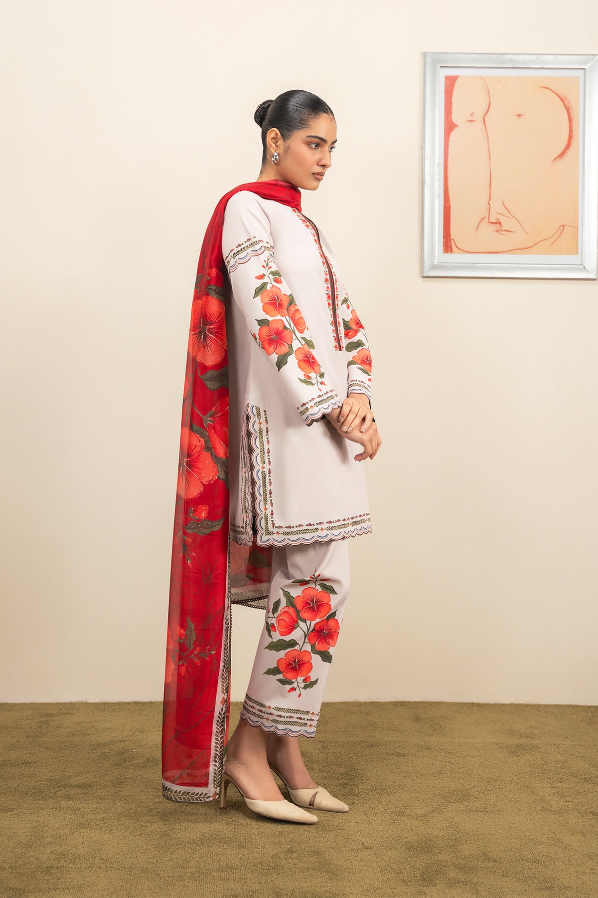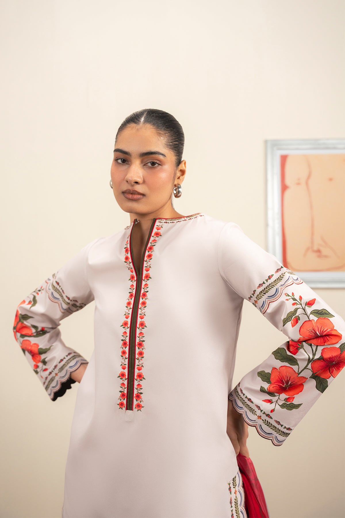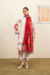 This ivory set carries a blush of boldness—florals gather along the sleeves and trouser cuffs in painterly rhythm. A contrasting red dupatta drapes with bold contrast, keeping the look tonal, balanced, and softly radiant.