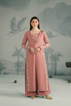 A blush raw silk long shirt, featuring a deep neckline with an embroidered inset bodice, delicately framed with ivory floral threadwork running along the panels and sleeves. Paired with wide-legged trouser in matching silk, the ensemble is completed with soft, flowing layers that balance structure with fluidity.
