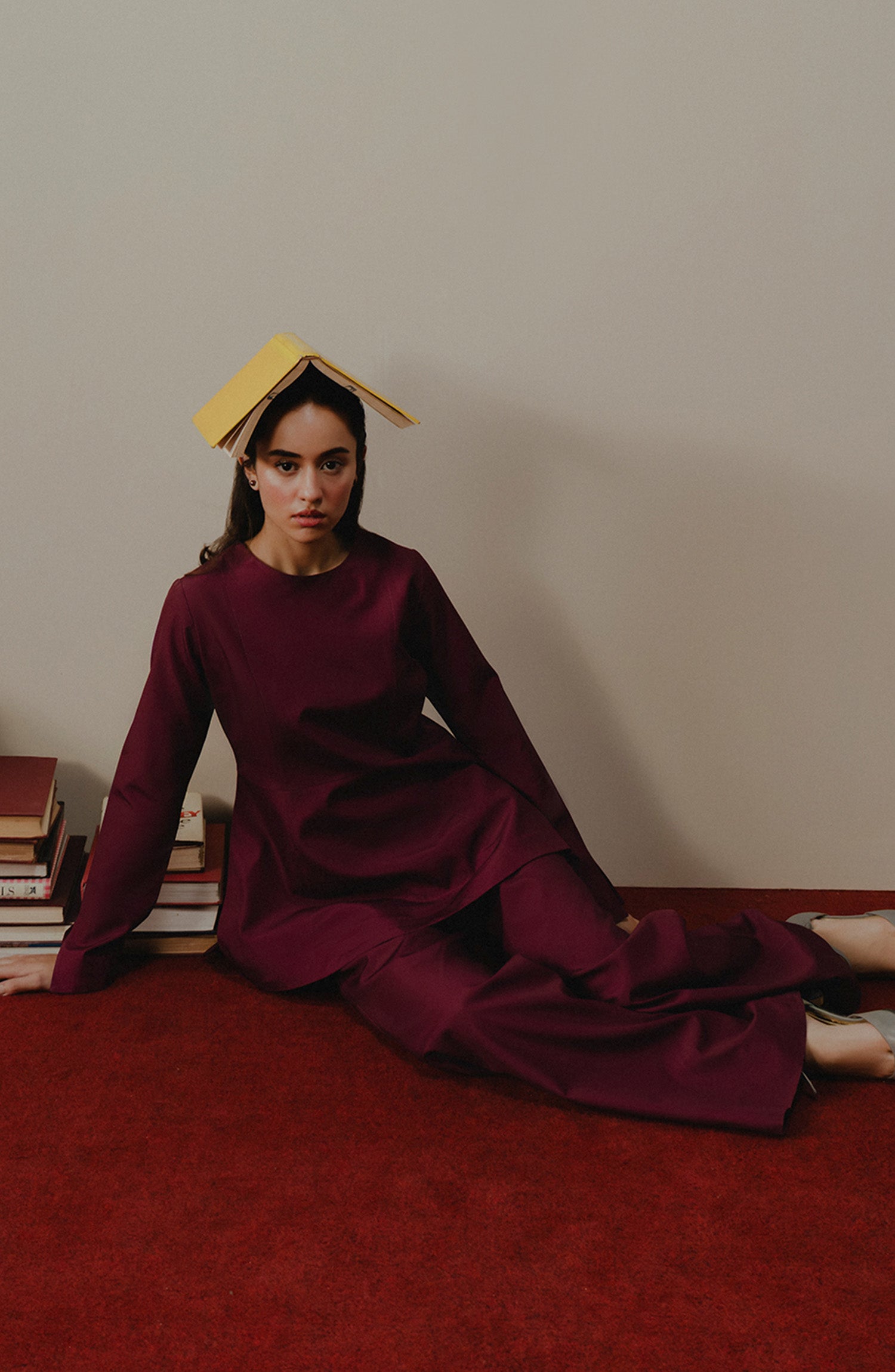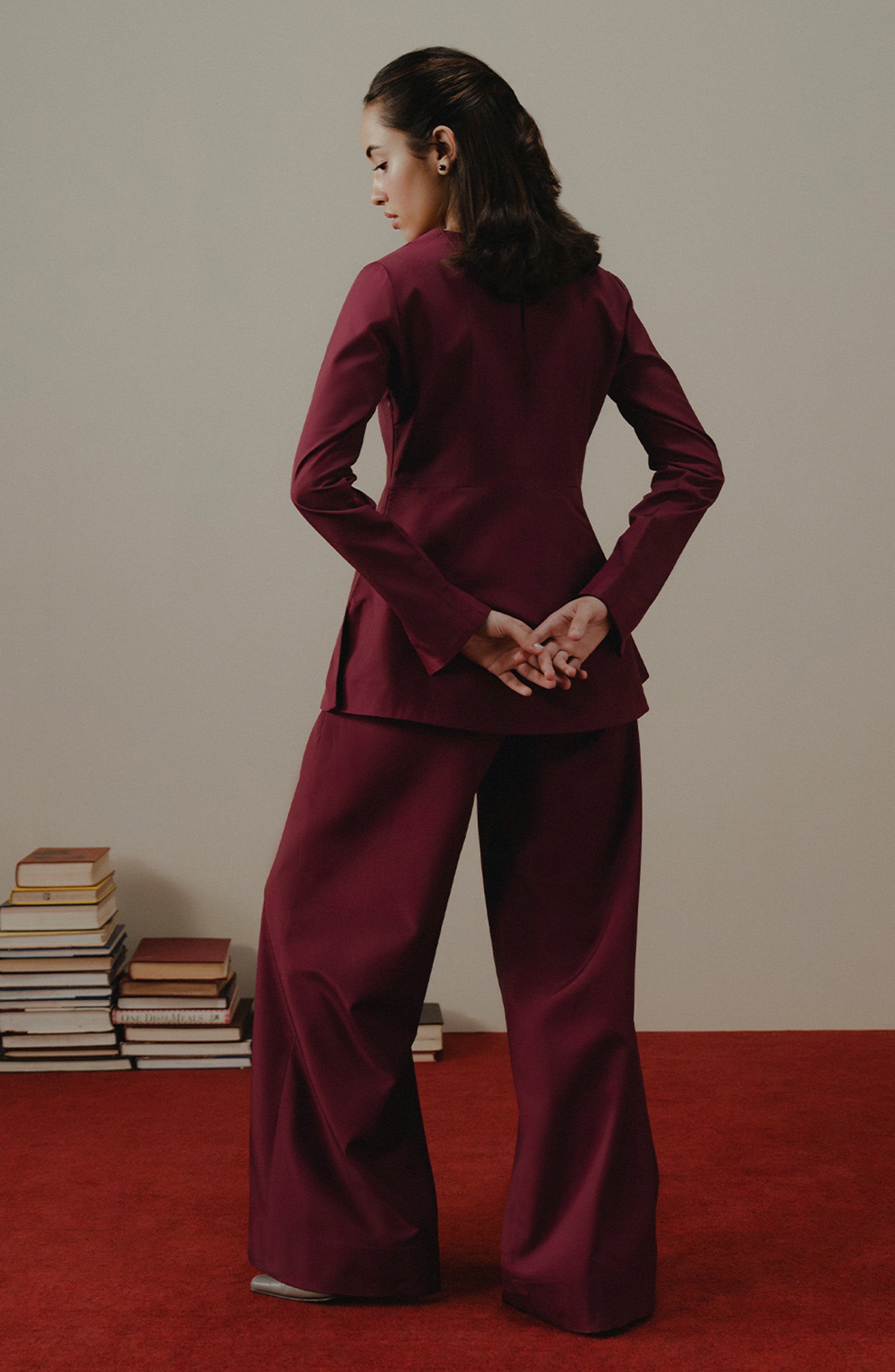 Rich in deep wine hues, this co-ord set brings understated elegance to everyday dressing.The long-sleeve tailored top features clean lines and a relaxed fit, paired with wide-leg trouser for effortless flow.