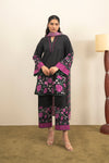 Striking a moody elegance defines this black set where violet and blush florals bloom in painterly arcs along the sleeves and hem. The matching dupatta strikes a bold harmony—green and purple stripes frame a cascade of pink and violet floralsand paired with cuffed trousers echo the palette’s dusky romance—tonal, poised, and softly dramatic.
