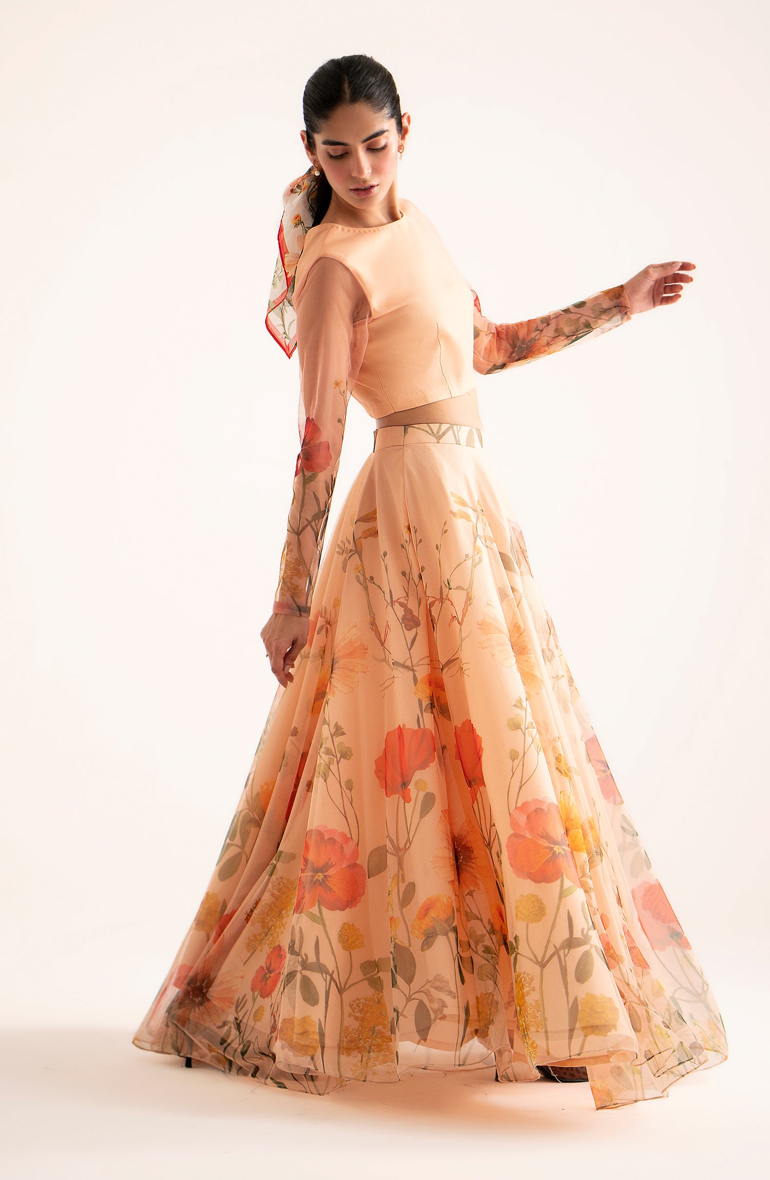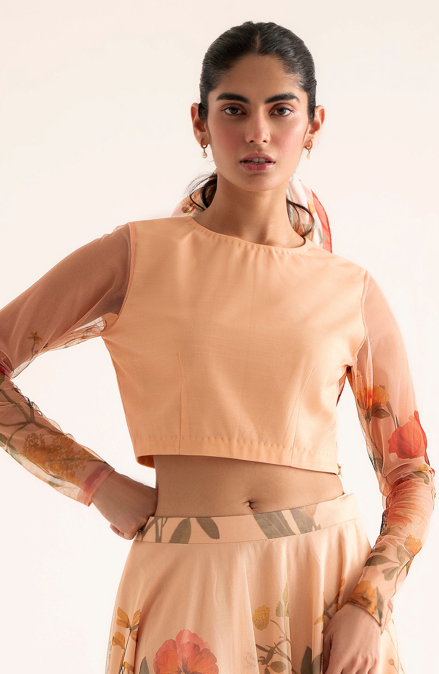 Delight in subtle hues and enchanting florals with a peach crop top, can be paired with a flared net skirt.