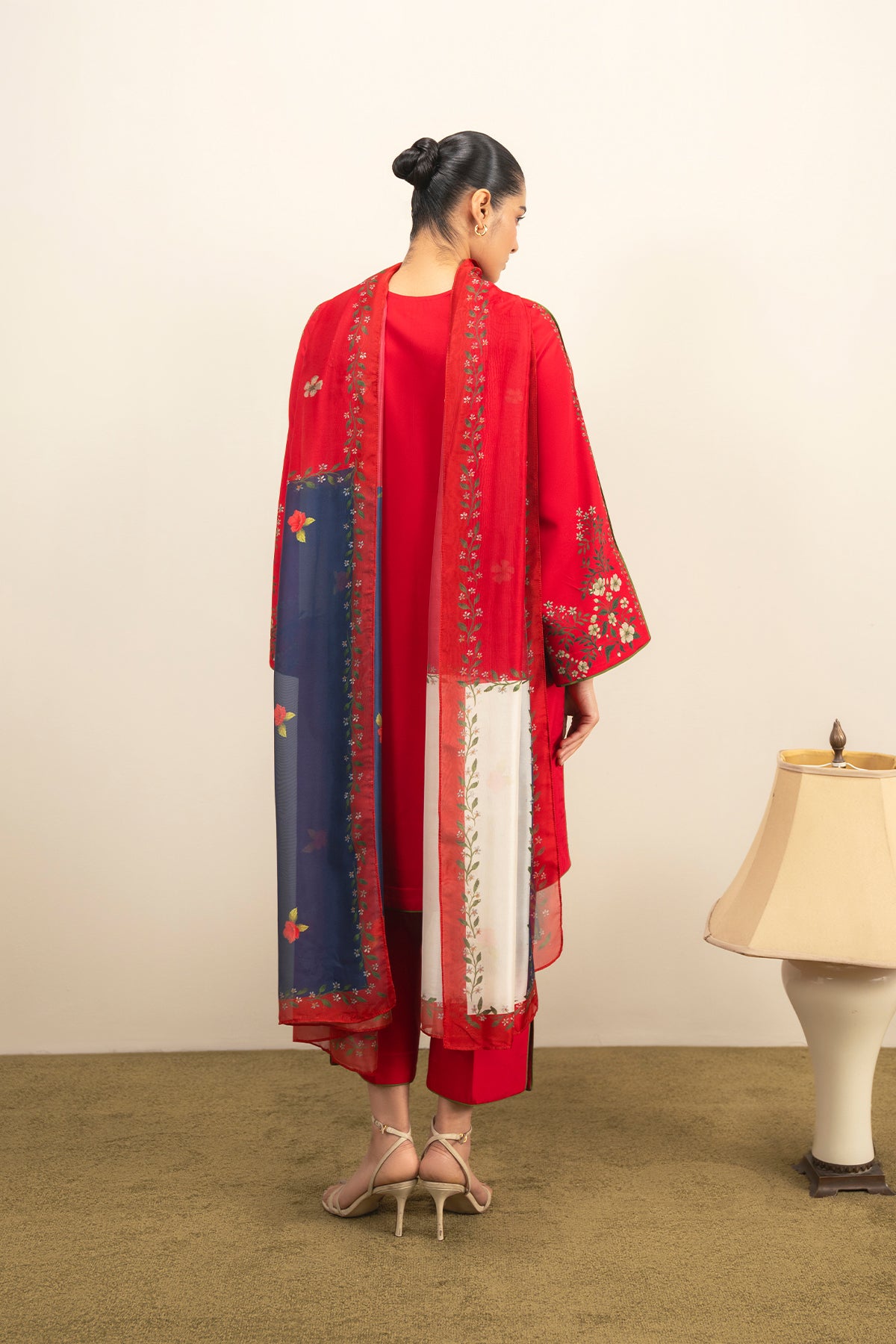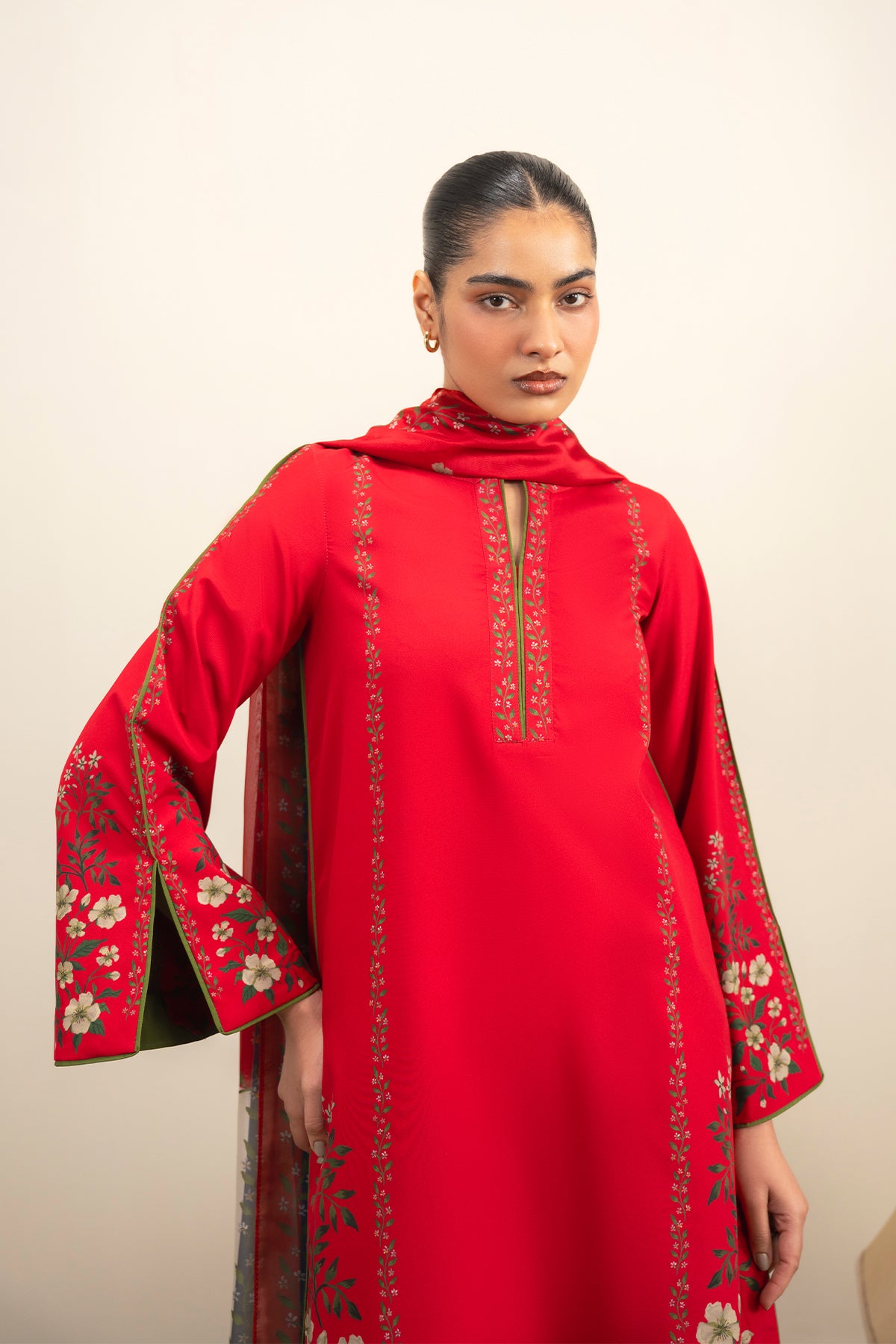 This crimson set commands with quiet intensity—its wide sleeves and sides embroidered in blooming detail. A vertical placket lends structure, while the matching dupatta and trousers keep the palette rich, tonal, and strikingly composed.