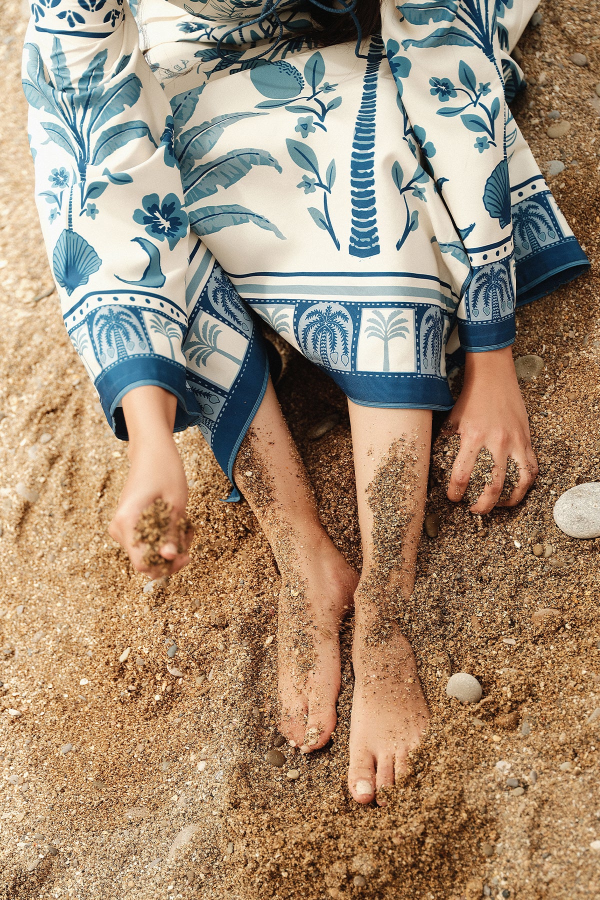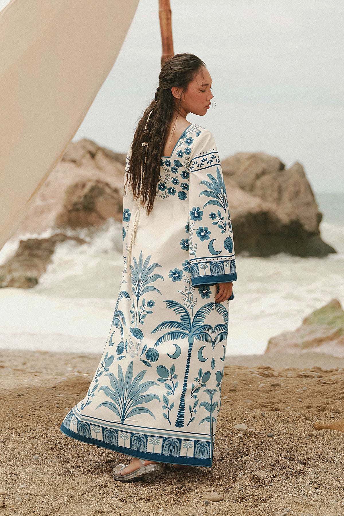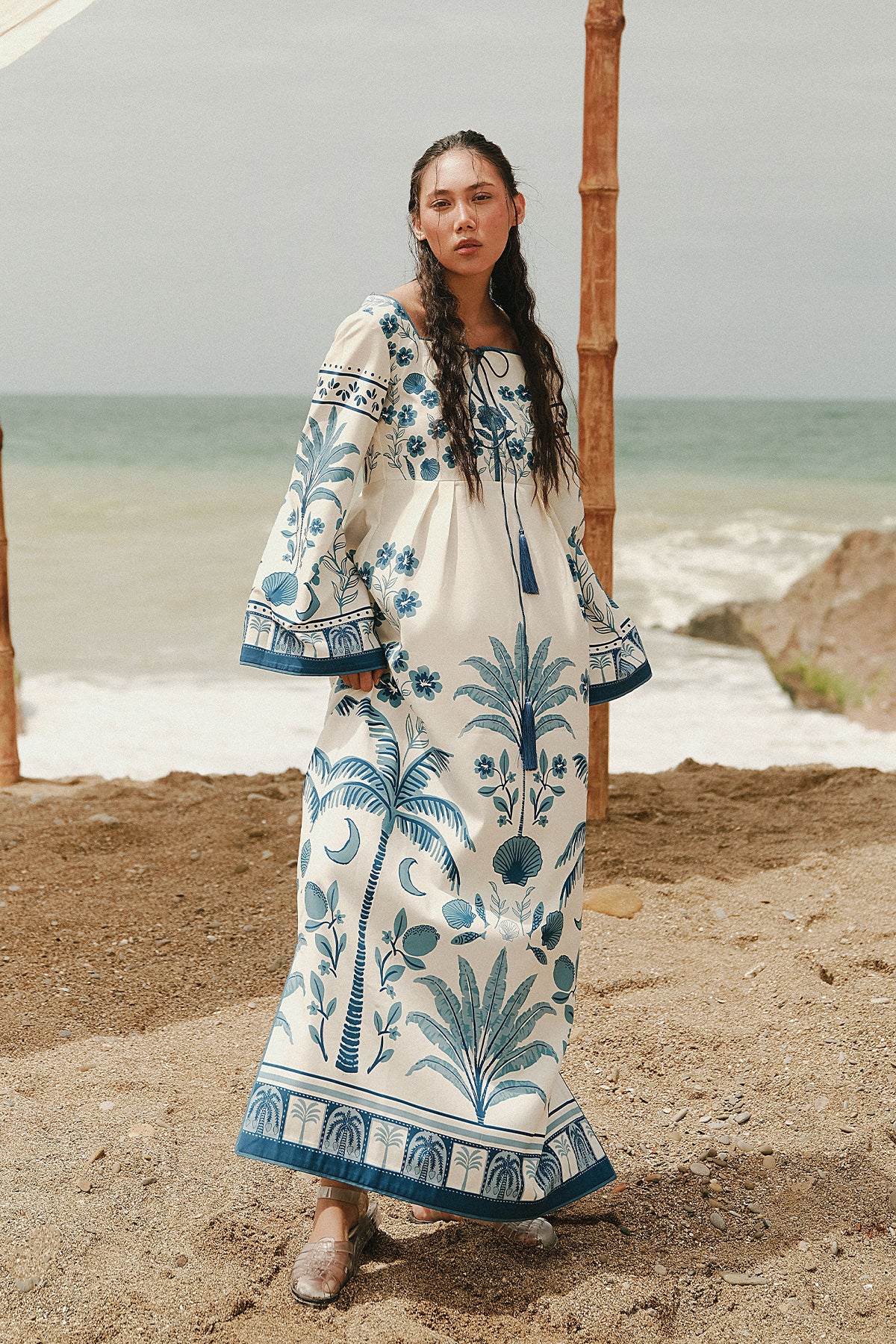 A flowingprinted georgette dress with bold blue botanical prints on a cream base, featuring a square tie neckline and long flared sleeves for a relaxed, boho-chic vibe.
