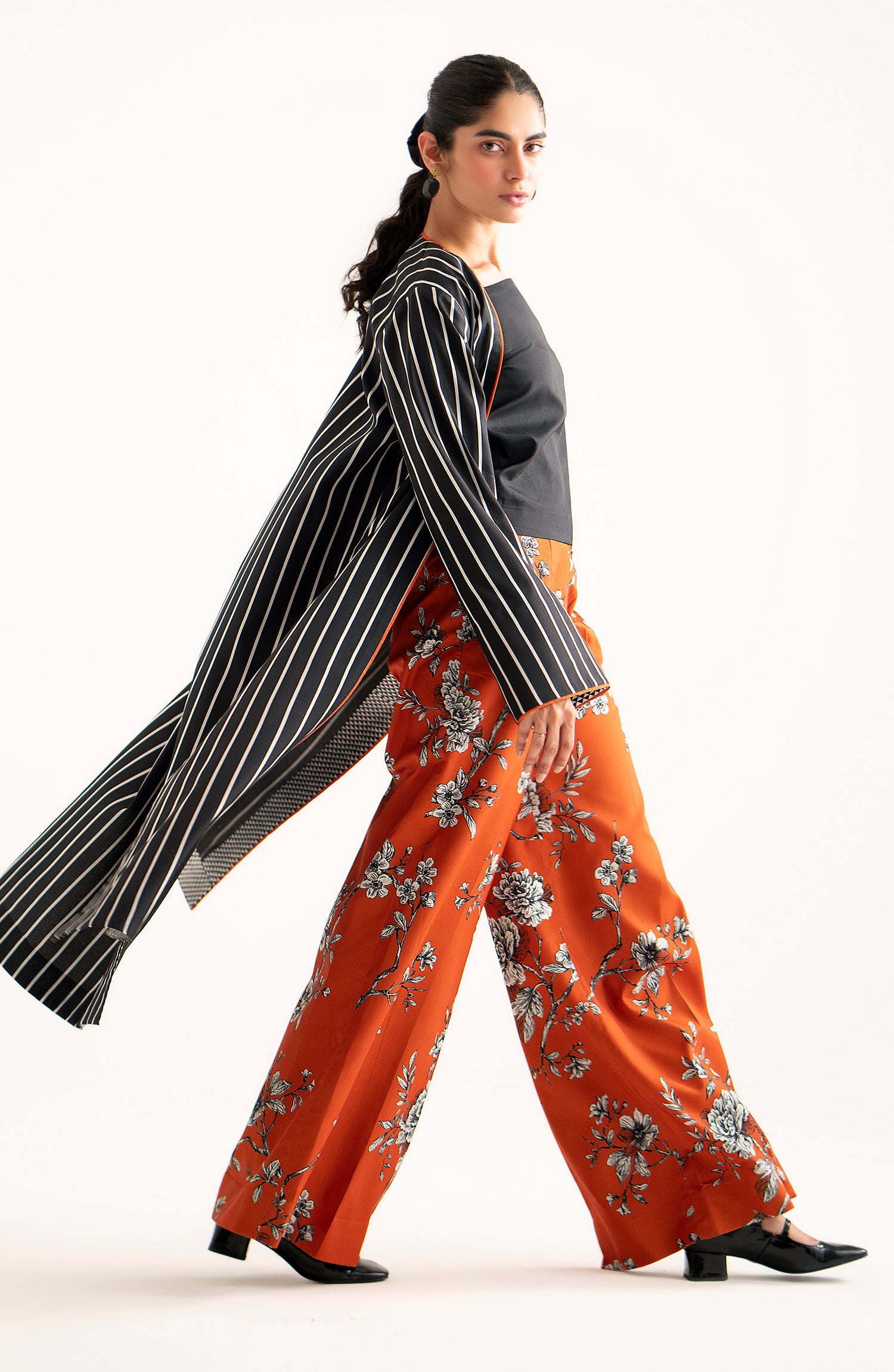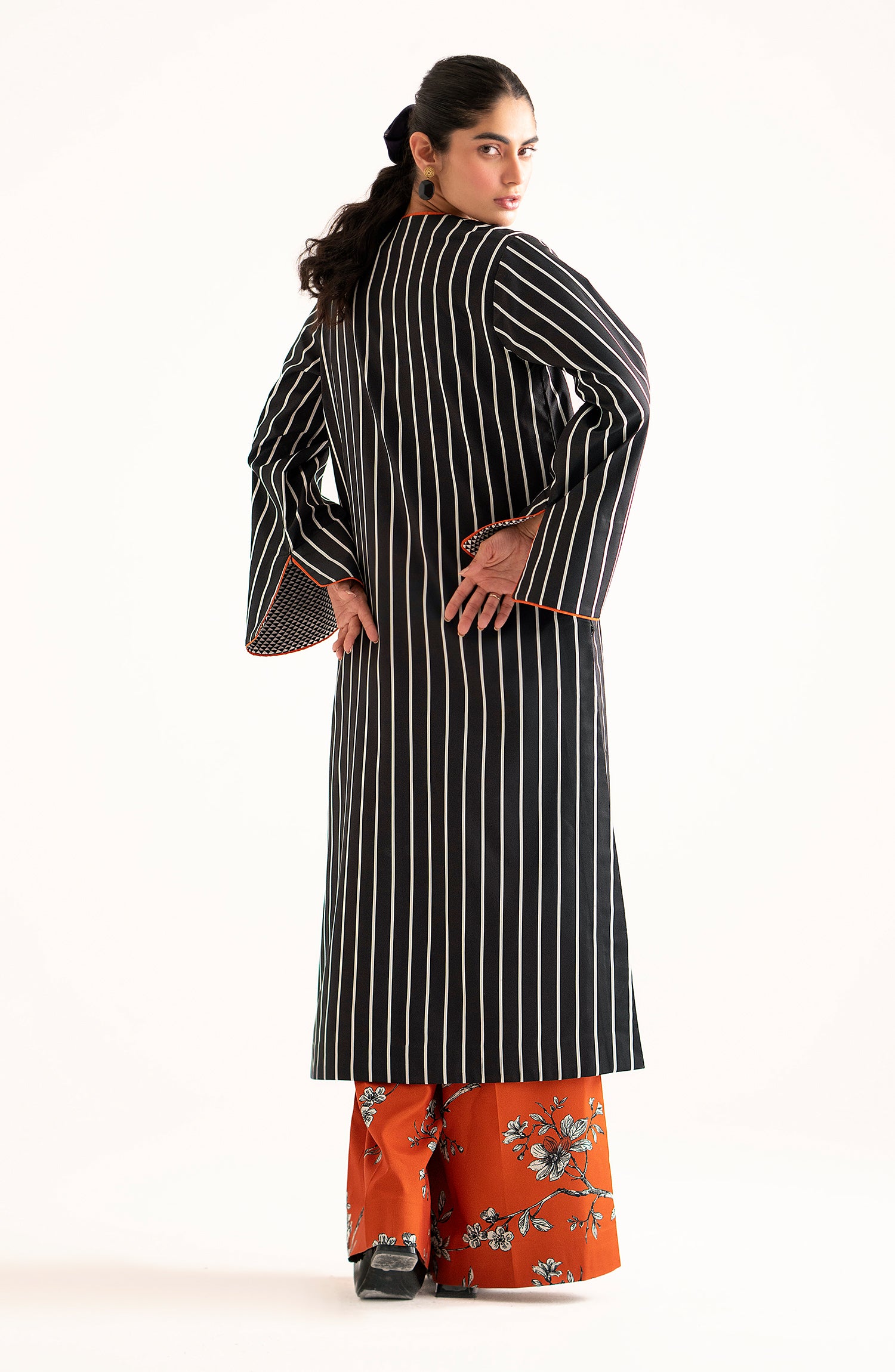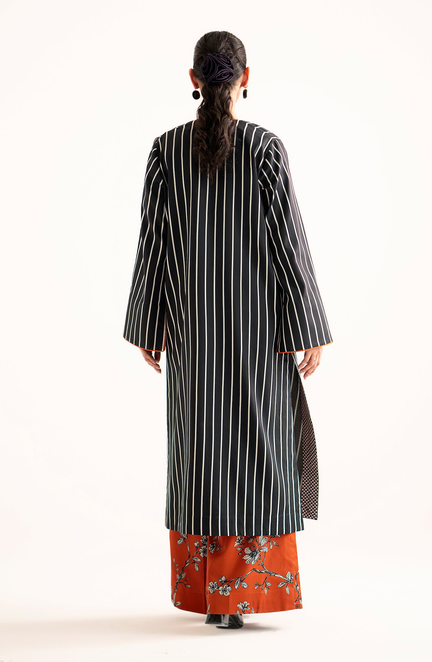 Make a bold statement with this black and white striped shrug, which can be paired with a black tank top and contrasting floral pants.
