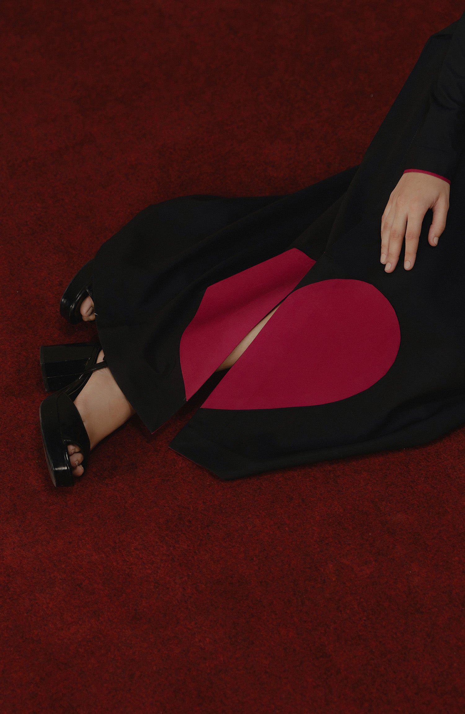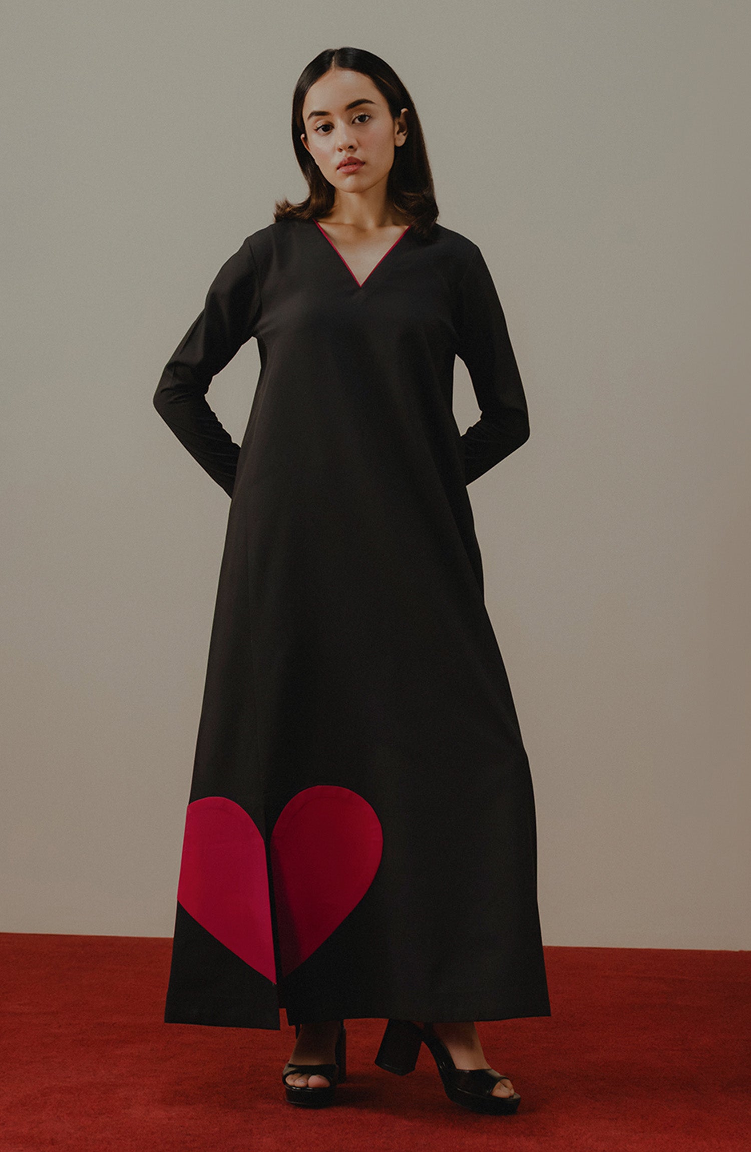 Midnight black full-length dress makes a striking statement with clean lines and a sleek silhouette. The design is elevated by a bold heart at the hem adding a playful pop of passion to its refined elegance